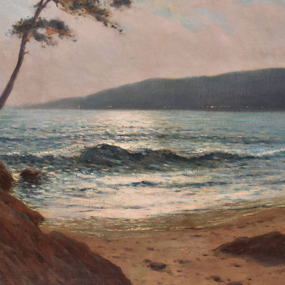 uno scorcio di costa con dei pini marittimi mentre c'è il tramonto, XX secolo. Primi del Novecento.