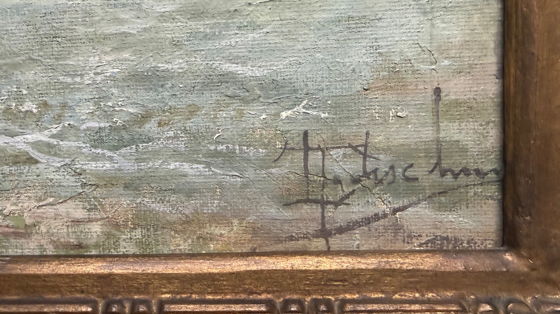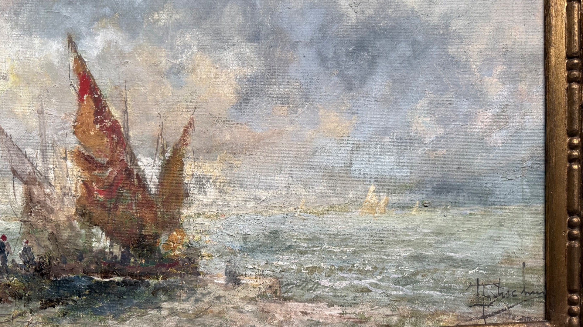 Dipinto olio su tela raffigurante marina.Cm 73,5x54.Tela:cm 60x40..Lucio Todeschini (Milano 1892-Cortenova 1969).Lucio Todeschini è nato a Milano il 20 febbraio 1892 da una famiglia di artisti. Il padre Giambattista, pittore affermato nella Lombardia del secondo Ottocento e nipote dell’abate Antonio Stoppani di cui dipinse un celebre ritratto oggi ai Musei Civici di Lecco, aveva realizzato le lunette del cortile di Brera e, con Giuseppe Mentessi, aveva decorato la Loggia del Palazzo della Permanente a Milano, specializzandosi in seguito nel ritratto, ma non trascurando il paesaggio, specialmente del lecchese. Il fratello maggiore, Piero (1888-1945) - anch’egli pittore e, come Lucio, allievo del padre - al ritorno dalla guerra di Libia aveva esposto alla “Società Artisti e Patriottica” le sue impressioni dal vero in Africa per le quali aveva ricevuto la medaglia d’oro, dedicandosi poi a soggetti moral-patriottici e al disegno di cartelloni pubblicitari. Architetto di professione, Lucio si era presto trasferito a Cortenova in provincia di Como, dedicandosi privatamente alla pittura per la quale avvertiva una naturale inclinazione. Dipinse in prevalenza fiori, nature morte, scene e paesaggi della Valsassina, di cui il più noto è Dall’abbeveratoio, ma soprattutto angoli e paesaggi della vecchia Milano, una produzione non abbondante che conobbe tuttavia un’immediata fortuna presso una larga clientela di collezionisti privati.