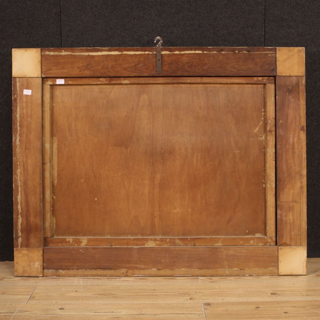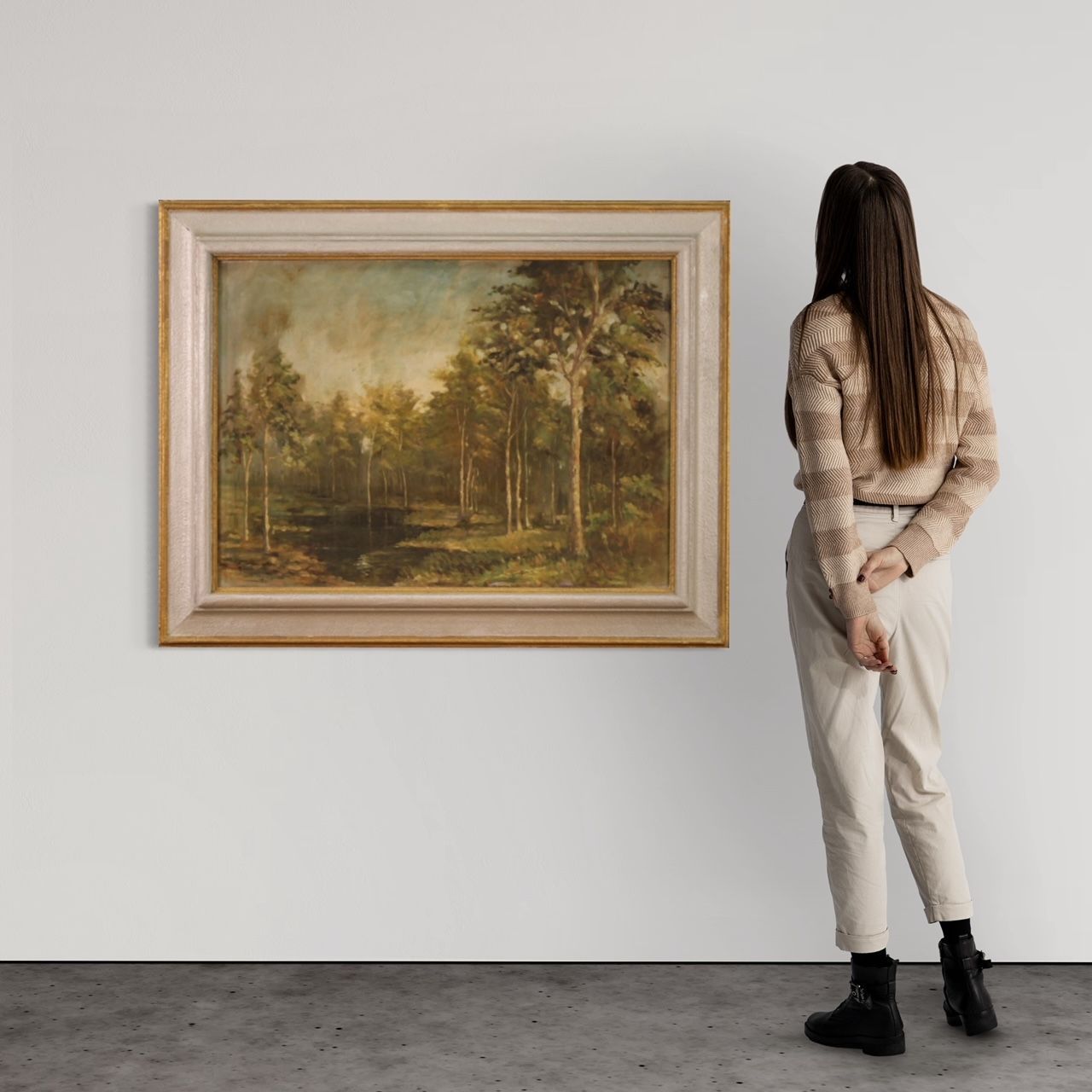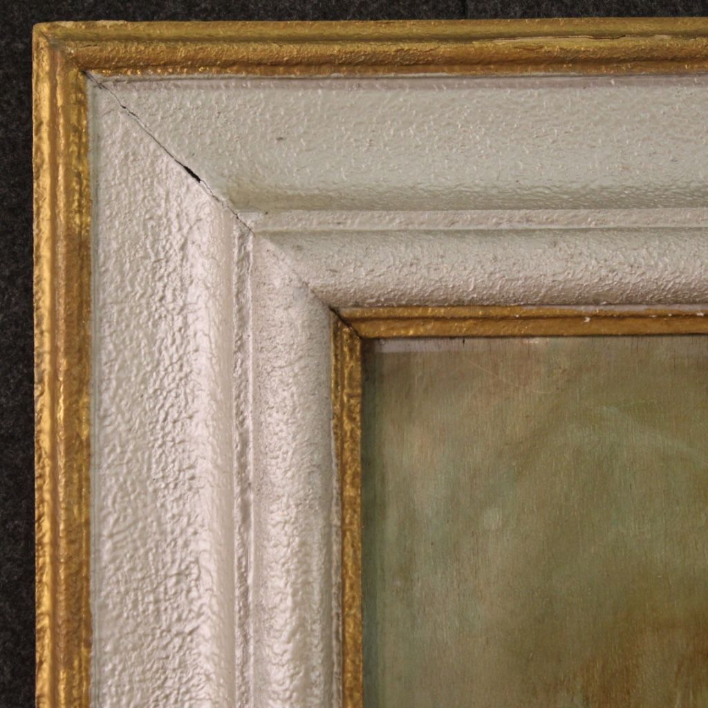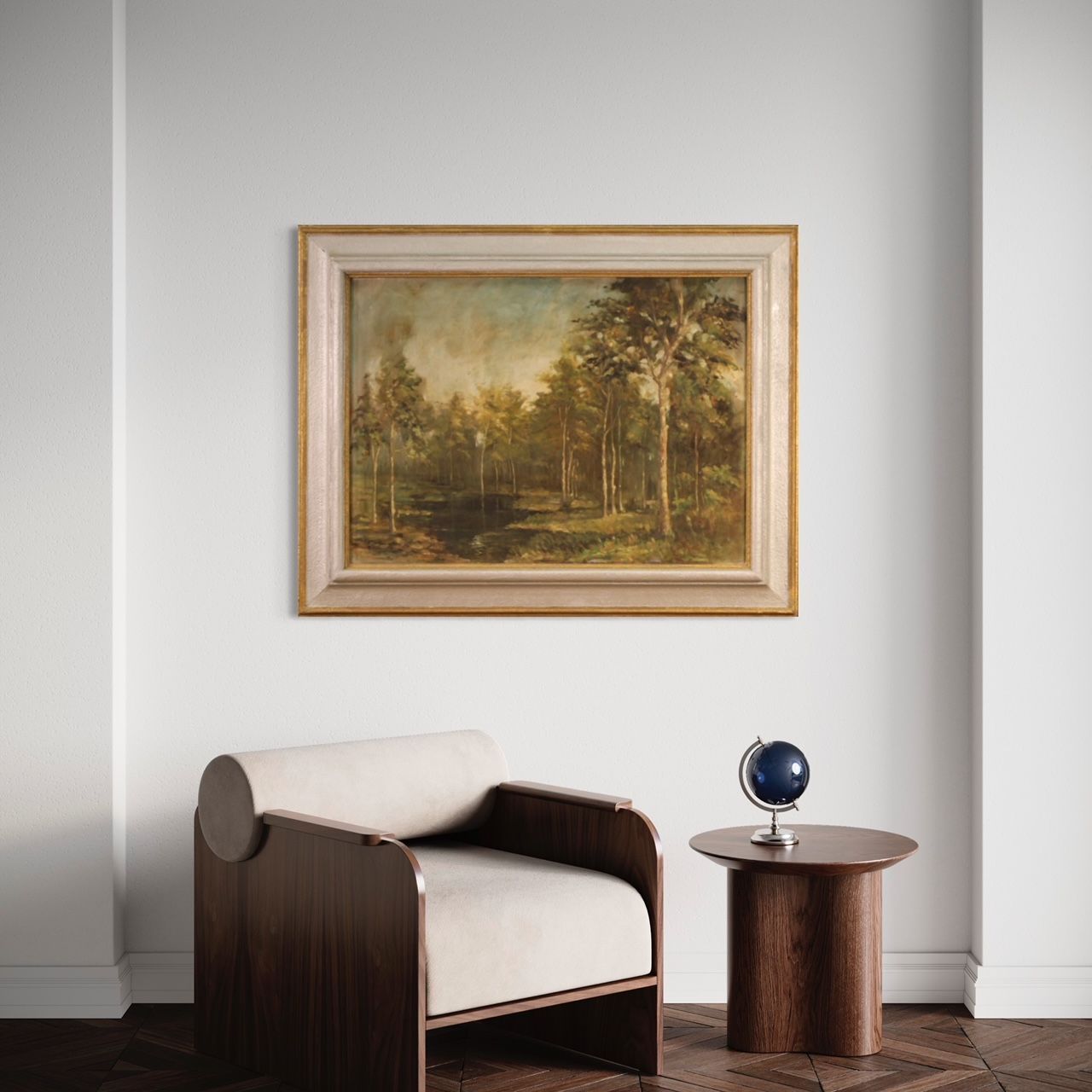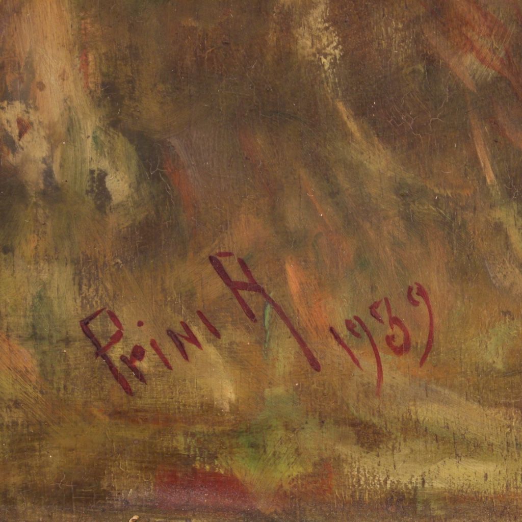 Italian painting dated 1939. Oil on board painting depicting a woodland landscape in impressionist style of good pictorial quality. Painting adorned with a wooden and plaster frame, sculpted, painted and gilded (bronze tint). Large size and impact artwork ideal to be placed in a living room or studio. Painting signed and dated lower right (see photo) Prini A. 1939 attributable to the painter Angelo Prini (1912-1999), lacking authentication. Painting with some small signs of the time, overall in good state of conservation. Sight size H 73 x W 101 cm.