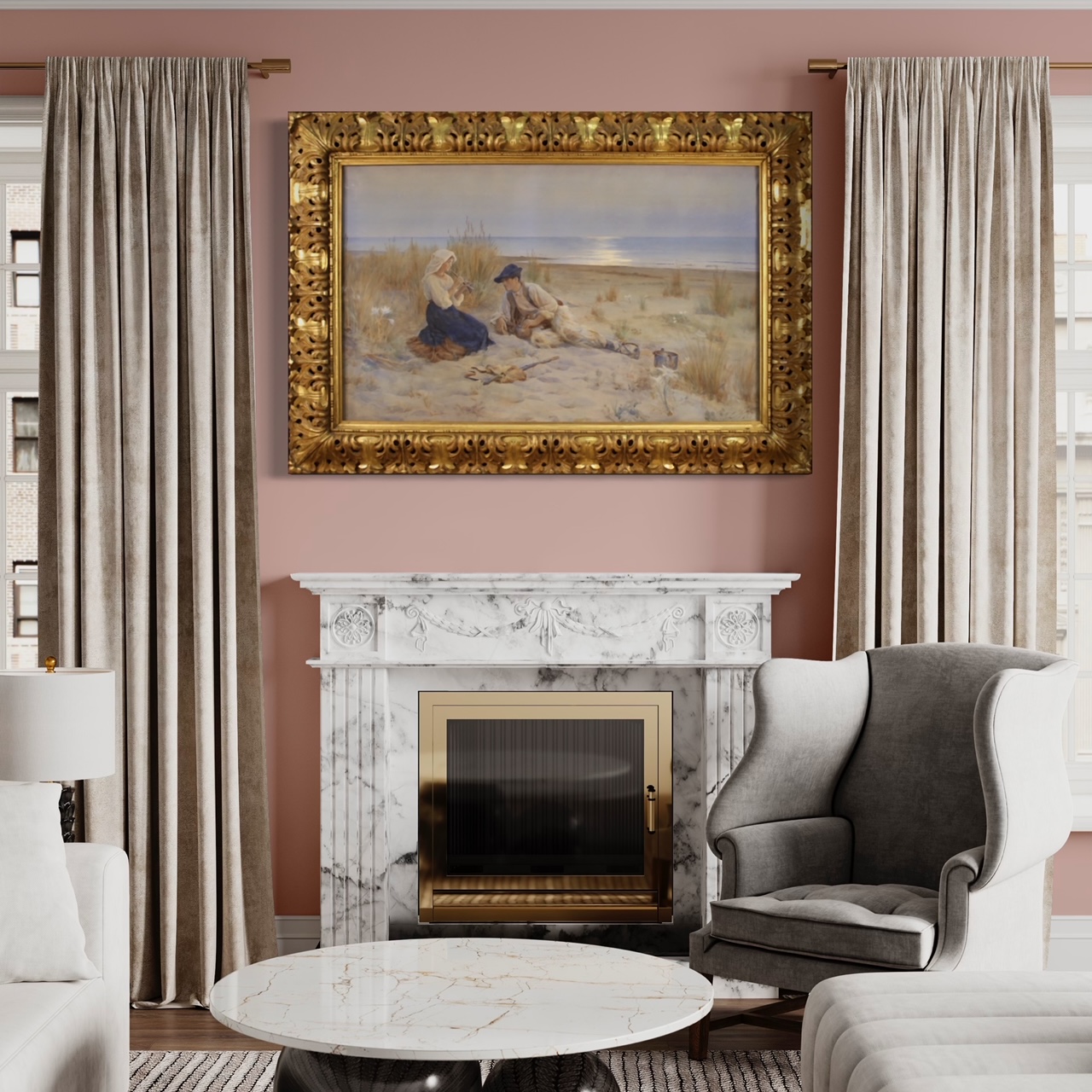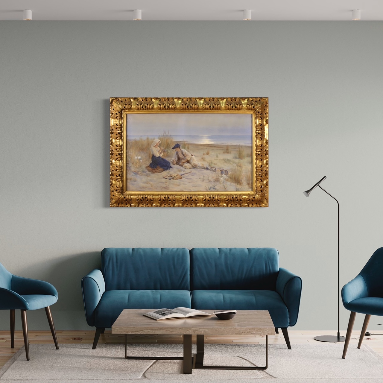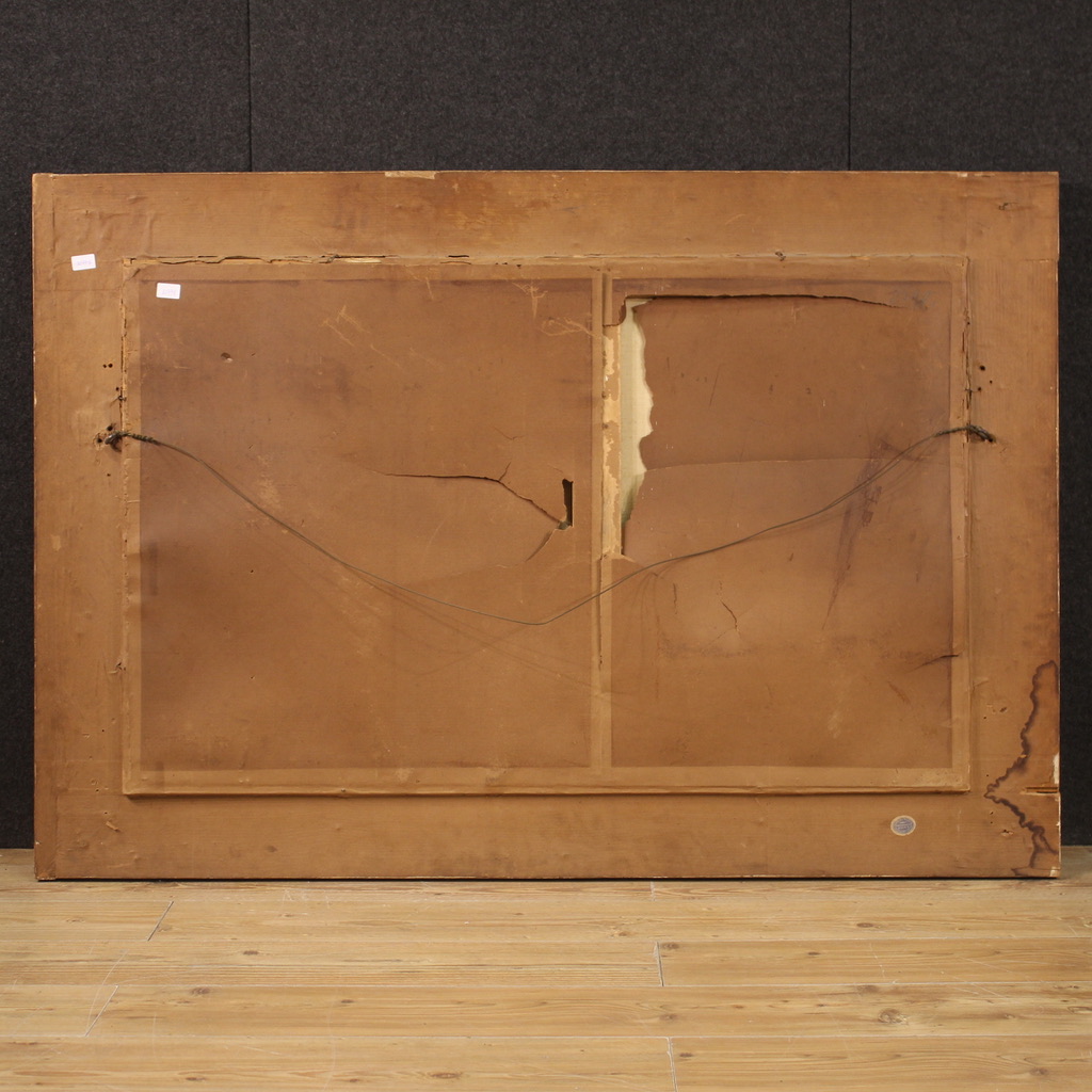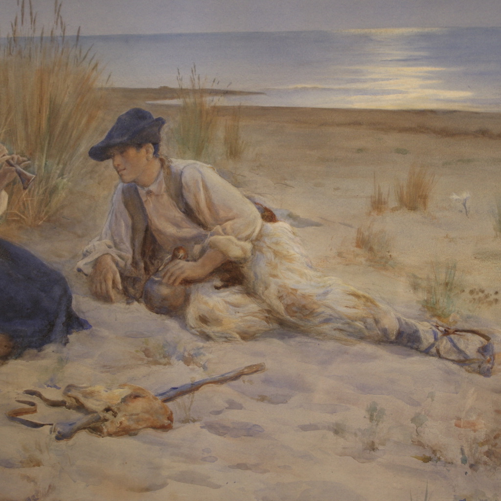 Antique Italian watercolor from the early 20th century. Mixed technique drawing mounted on a wooden frame depicting Seascape with young shepherds of excellent pictorial quality. Painting of great size and impact adorned with a non-coeval finely carved and gilded frame (see picture). Frame that shows some signs of aging and the lack of 3 wooden decorations (see picture). Framework signed in the lower right corner (see picture) attributable to the painter Enrico Nardi (1864-1947) lacking authentication. Watercolor of fabulous delicacy, pleasant glimpse with calm sea and reflection of the sun on the water, in the background. The two children depicted in the foreground are very well painted (see picture), she is intent on playing the clarinet while the shepherd boy is attentive and lying at her side. Frame complete with protective glass. Framework overall in good condition. Structurally sound frame with some small defects. Sight size H 74 X W 121 cm
