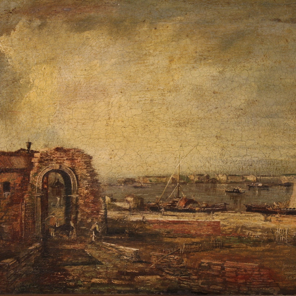COD 9008 Italian painting from the second half of the 20th century. Framework oil on canvas in antique style depicting a seascape with fishermen and boats. Nice sized and pleasantly decor painting with modern lacquered and gilded wooden frame. Painting of excellent depth with antique patina of nineteenth-century character. In good condition with some small signs of aging. Sight size H 69 x W 99 cm. Visit our website www.parino.it, shipping worldwide, free shipping in Europe. For Traders and Retailers Wholesale Prices.