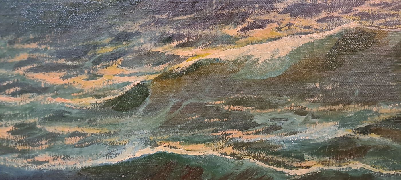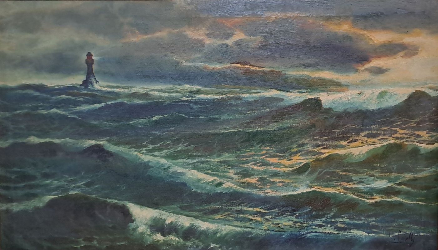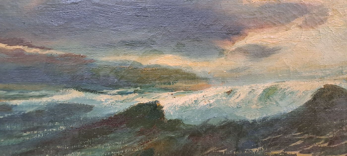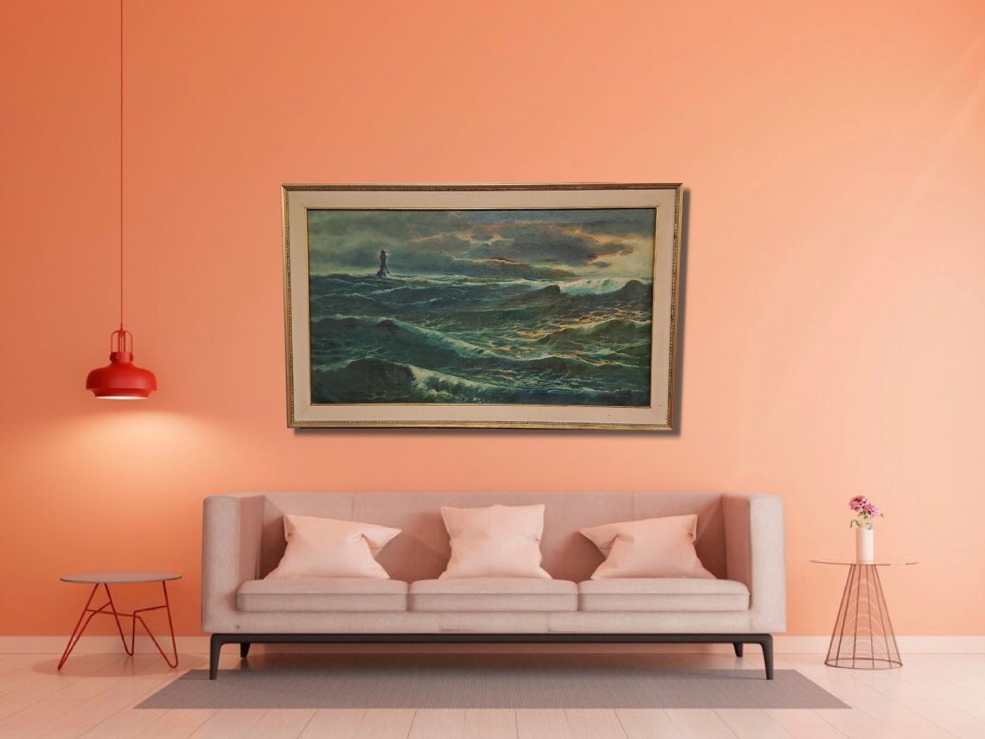 Large oil painting on canvas depicting a storm. On the left side, a lighthouse signals the proximity of the coast to sailors, while on the right, a wave breaks into white foam. The light is turning to sunset, as can be seen from the reddish color of the sky that shines through the clouds. Signed Caselli at the bottom right. Datable to the 40s/50s of the 20th century. The dimensions are: 85 X 130 (with frame) 68 x 115 (without frame)