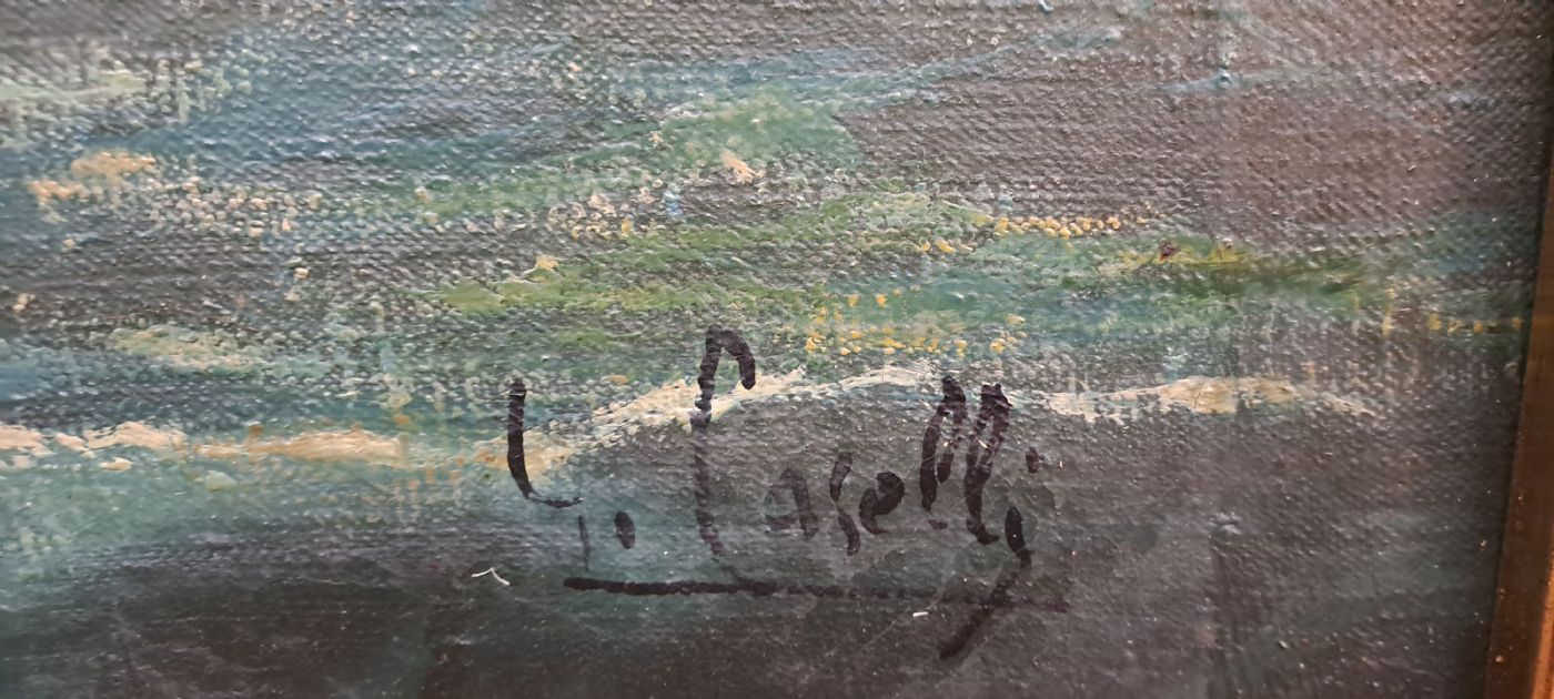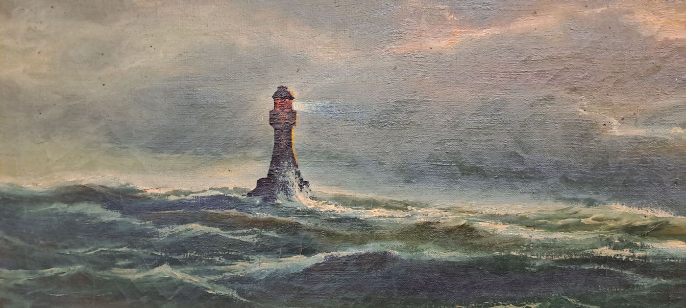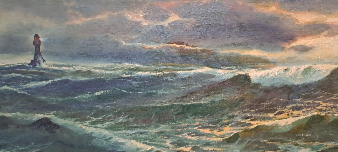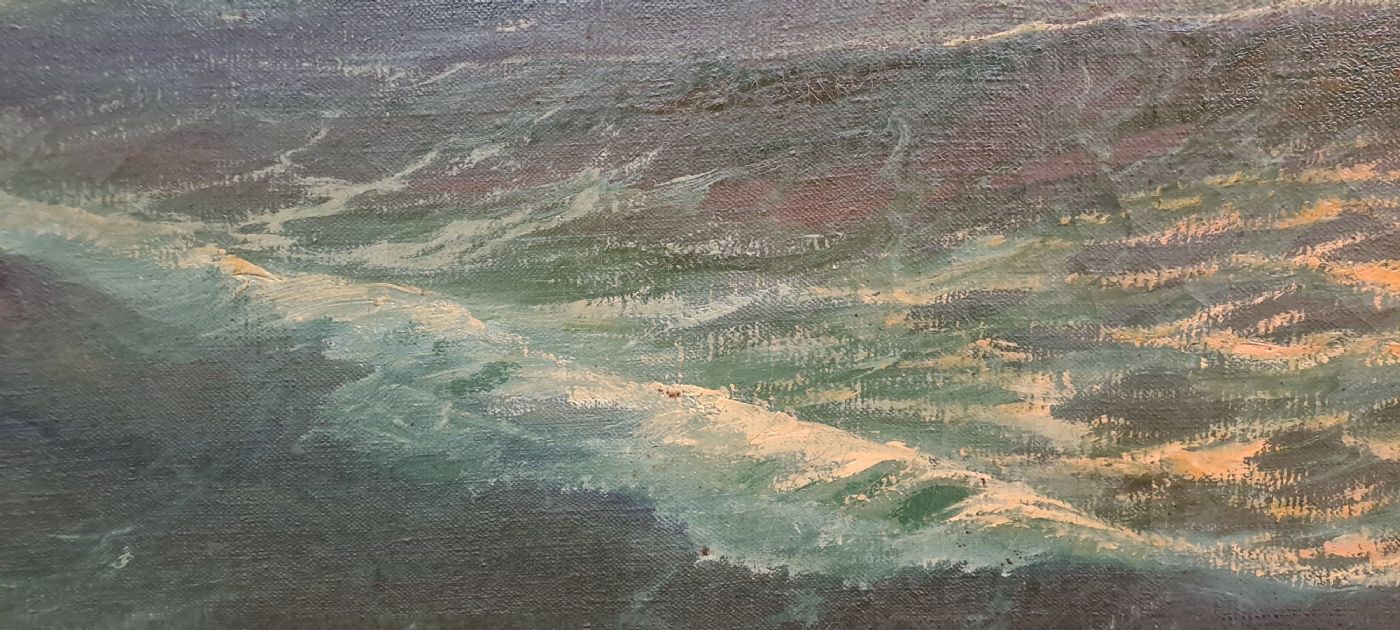 Large oil painting on canvas depicting a storm. On the left side, a lighthouse signals the proximity of the coast to sailors, while on the right, a wave breaks into white foam. The light is turning to sunset, as can be seen from the reddish color of the sky that shines through the clouds. Signed Caselli at the bottom right. Datable to the 40s/50s of the 20th century. The dimensions are: 85 X 130 (with frame) 68 x 115 (without frame)