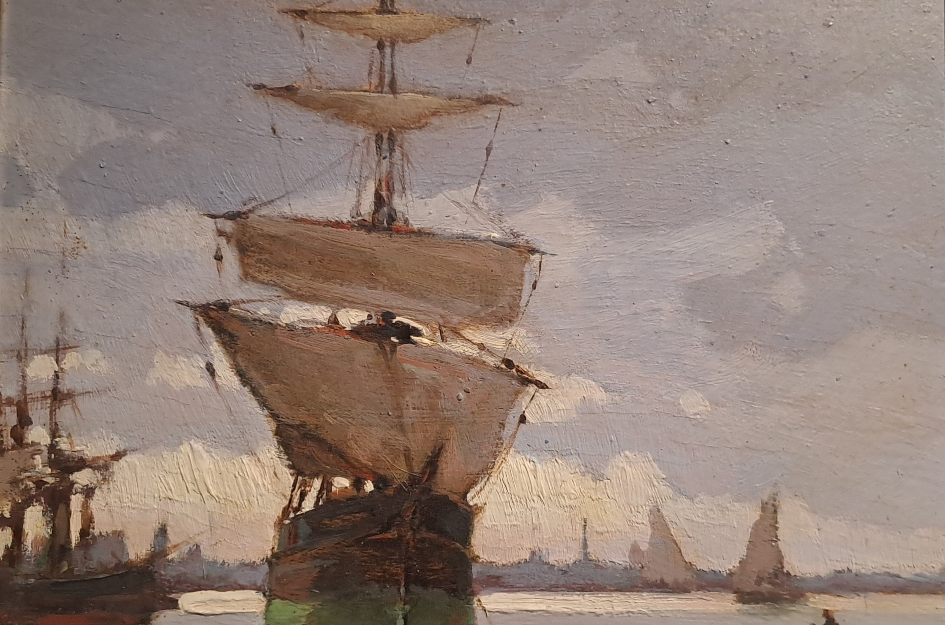 Magnifico Olio del Maestro Renuccio Renucci (Livorno 1880 – 1947) - Marina con Veliero Descrizione Un incantevole dipinto ad olio che cattura la vibrante atmosfera di un porto al tramonto o all'alba, opera del celebre pittore livornese Renuccio Renucci, fondatore del prestigioso Gruppo Labronico. L'opera presenta una composizione potente e bilanciata: al centro domina l'imponente sagoma di un veliero ormeggiato, con le vele ammainate, mentre la luce radente del cielo si riflette sull'acqua, creando un gioco di riflessi e cromie tipiche dell'ambiente marittimo toscano. La pennellata è corposa e materica, come era consuetudine per Renucci, erede della tradizione macchiaiola ma con influenze divisioniste che gli conferiscono una luce e un realismo lucido. In primo piano, l'artista inserisce due piccole imbarcazioni con pescatori o figure solitarie, elemento che accentua la dimensione umana della scena e il contrasto dimensionale con la grande nave. Sullo sfondo si intravede il profilo della costa o del porto con elementi architettonici che si fondono nella nebbia luminosa dell'orizzonte. Questo dipinto di piccolo formato è un esempio perfetto dei soggetti prediletti dal Maestro Renucci, il quale eccelleva nelle marine, nei ritratti di velieri e nelle scene di vita portuale. L'opera è firmata in basso a destra "R. Renucci" . Dimensioni: 38 x 26 cm con cornice, 21 x 20 cm il dipinto Note Biografiche sull'Artista Renuccio Renucci (Livorno, 1880 – 1947) è stato una figura di spicco nel panorama artistico toscano della prima metà del Novecento. Formazione e Stile: Allievo del maestro Ugo Manaresi, Renucci si distinse fin da subito per uno stile che, partendo dalle suggestioni del Divisionismo, approdò a una cifra stilistica personale caratterizzata da una pennellata robusta, elegante e da un forte senso decorativo. Fu particolarmente apprezzato per il realismo delle sue lucide composizioni. Gruppo Labronico: Nel 1920 fu tra i membri fondatori del Gruppo Labronico, un sodalizio artistico nato a Livorno con l'intento di onorare la memoria di Giovanni Fattori e promuovere la pittura della scuola locale, in particolare la pittura dal vero. Soggetti: La sua arte è indissolubilmente legata alla sua città natale. I suoi soggetti preferiti erano le marine, le vedute del porto di Livorno, i velieri e le scene con pescatori. La sua fortuna critica e commerciale fu particolarmente forte in Toscana, dove le sue opere sono tutt'oggi molto ricercate e presenti in collezioni pubbliche e private. L'opera proposta rappresenta un'opportunità di acquisire un'autentica testimonianza della pittura livornese del Gruppo Labronico.