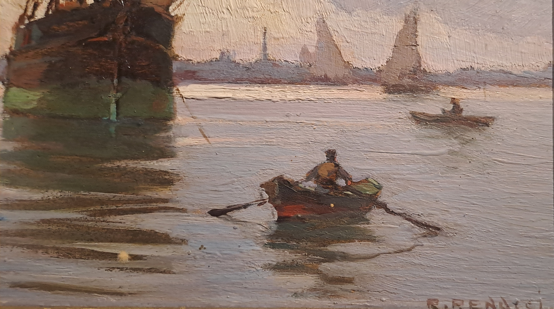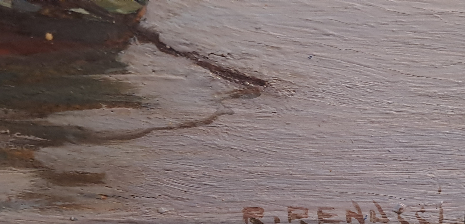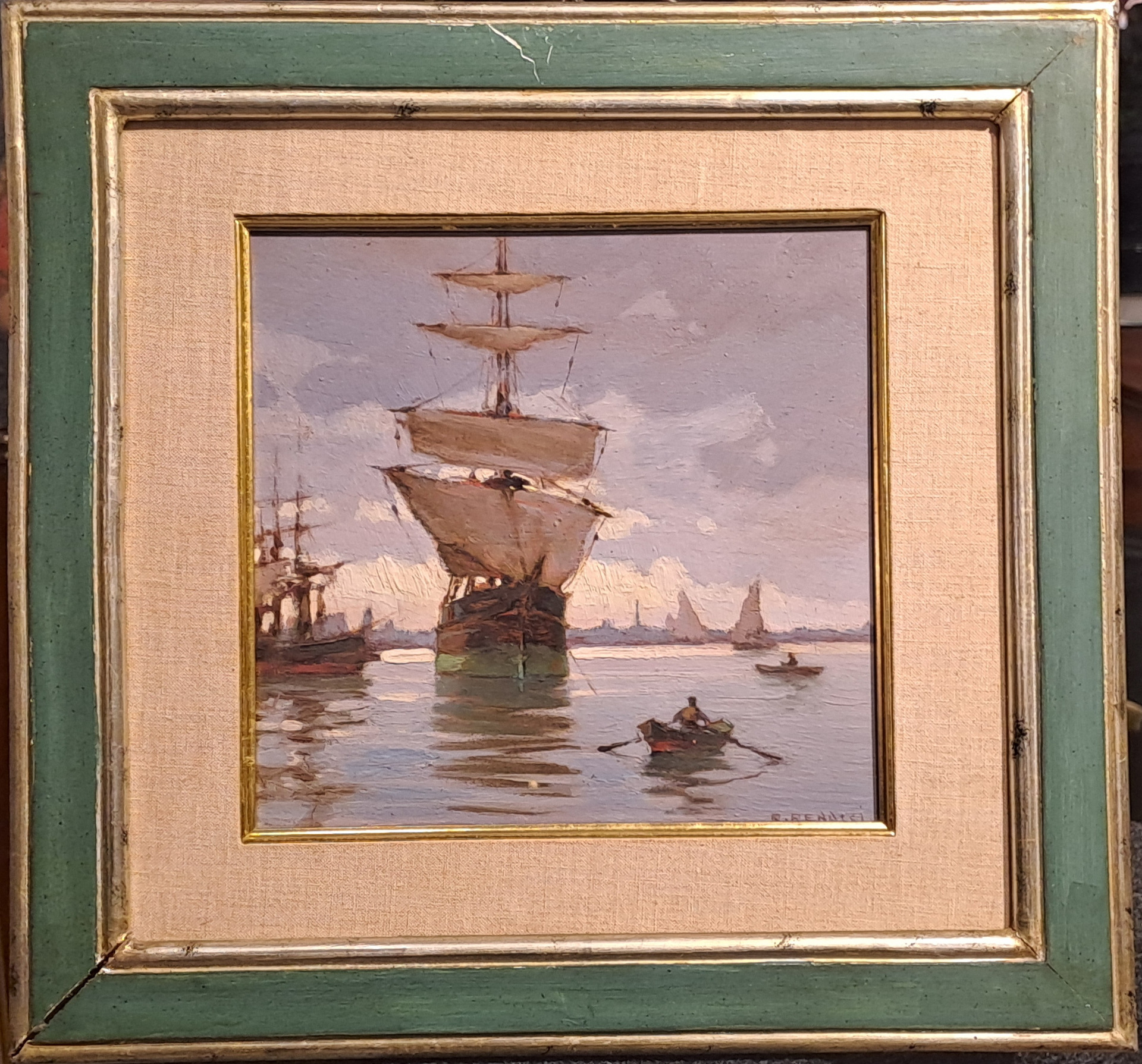 Magnifico Olio del Maestro Renuccio Renucci (Livorno 1880 – 1947) - Marina con Veliero Descrizione Un incantevole dipinto ad olio che cattura la vibrante atmosfera di un porto al tramonto o all'alba, opera del celebre pittore livornese Renuccio Renucci, fondatore del prestigioso Gruppo Labronico. L'opera presenta una composizione potente e bilanciata: al centro domina l'imponente sagoma di un veliero ormeggiato, con le vele ammainate, mentre la luce radente del cielo si riflette sull'acqua, creando un gioco di riflessi e cromie tipiche dell'ambiente marittimo toscano. La pennellata è corposa e materica, come era consuetudine per Renucci, erede della tradizione macchiaiola ma con influenze divisioniste che gli conferiscono una luce e un realismo lucido. In primo piano, l'artista inserisce due piccole imbarcazioni con pescatori o figure solitarie, elemento che accentua la dimensione umana della scena e il contrasto dimensionale con la grande nave. Sullo sfondo si intravede il profilo della costa o del porto con elementi architettonici che si fondono nella nebbia luminosa dell'orizzonte. Questo dipinto di piccolo formato è un esempio perfetto dei soggetti prediletti dal Maestro Renucci, il quale eccelleva nelle marine, nei ritratti di velieri e nelle scene di vita portuale. L'opera è firmata in basso a destra "R. Renucci" . Dimensioni: 38 x 26 cm con cornice, 21 x 20 cm il dipinto Note Biografiche sull'Artista Renuccio Renucci (Livorno, 1880 – 1947) è stato una figura di spicco nel panorama artistico toscano della prima metà del Novecento. Formazione e Stile: Allievo del maestro Ugo Manaresi, Renucci si distinse fin da subito per uno stile che, partendo dalle suggestioni del Divisionismo, approdò a una cifra stilistica personale caratterizzata da una pennellata robusta, elegante e da un forte senso decorativo. Fu particolarmente apprezzato per il realismo delle sue lucide composizioni. Gruppo Labronico: Nel 1920 fu tra i membri fondatori del Gruppo Labronico, un sodalizio artistico nato a Livorno con l'intento di onorare la memoria di Giovanni Fattori e promuovere la pittura della scuola locale, in particolare la pittura dal vero. Soggetti: La sua arte è indissolubilmente legata alla sua città natale. I suoi soggetti preferiti erano le marine, le vedute del porto di Livorno, i velieri e le scene con pescatori. La sua fortuna critica e commerciale fu particolarmente forte in Toscana, dove le sue opere sono tutt'oggi molto ricercate e presenti in collezioni pubbliche e private. L'opera proposta rappresenta un'opportunità di acquisire un'autentica testimonianza della pittura livornese del Gruppo Labronico.