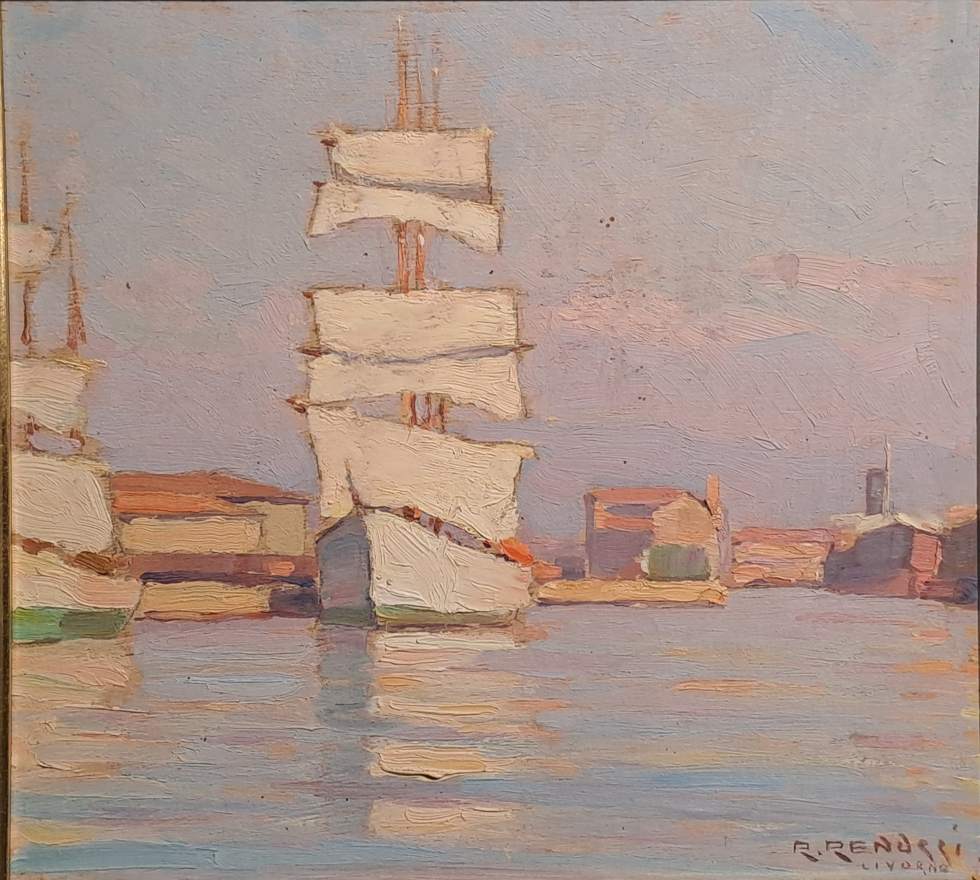 A fascinating small-sized oil on panel capturing the luminous and vibrant atmosphere of a port, by the renowned Livorno painter Renuccio Renucci (1880-1947).