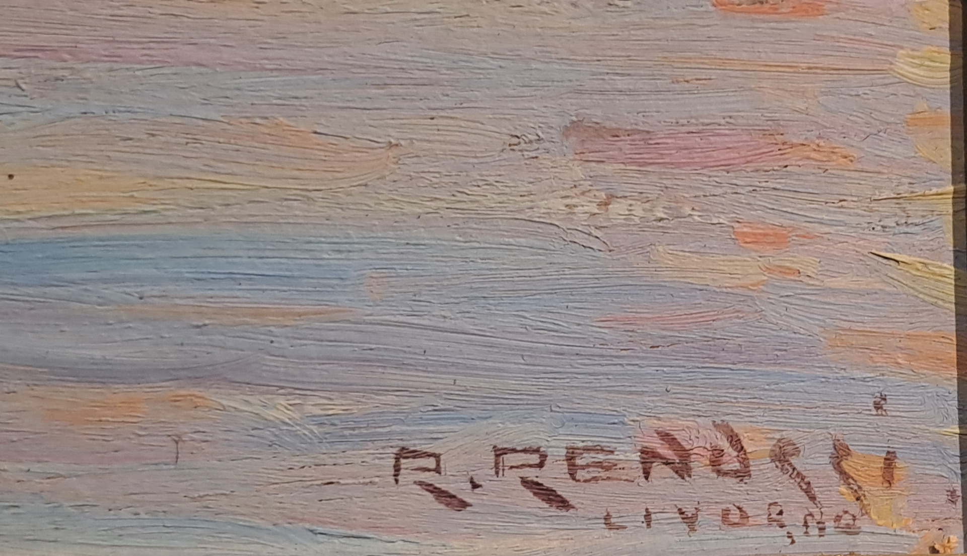 Oil on Panel by Renuccio Renucci: "Sailing Ships in Port" A fascinating small-sized oil on panel capturing the luminous and vibrant atmosphere of a port, by the renowned Livorno painter Renuccio Renucci (1880-1947). The painting depicts a port scene, most likely the Port of Livorno, with two sailing ships or large boats dominating the composition. The white sails, rendered with textured and pasty brushstrokes, stand out against a clear sky, played on shades of pink, lilac, and pale blue, typical of the light of early morning or late afternoon. Stylistic Details Technique: Oil on panel. Style: The work features Renucci's characteristic full and elegant brushstroke, a mature synthesis between the early echoes of Divisionism and the tradition of Labronica painting. Subject: The artist's predilection for seascapes, boats, and port life manifests itself in the attention to the constructive details of the hulls and the vibrant reflection on the water, rendered with touches of fresh color and skillfully juxtaposed. Conservation: Excellent condition. The artist's signature is visible at the bottom. This painting is an excellent and highly collectible example of Renucci's talent in transforming an everyday scene into a work of art rich in light and poetry. Dimensions: 39 x 36 cm with frame, 21 x 20 cm the painting. Biographical Notes: Renuccio Renucci (Livorno, 1880 – 1947) Renuccio Renucci was an important Italian painter, a key figure in the Tuscan artistic scene of the twentieth century. Training and Initial Style: He began his artistic training at a very young age in Livorno under the guidance of the master Ugo Manaresi. Initially, he adopted late-Divisionist stylistic modules, characterized by a vibrant use of color. The Labronico Group: In 1920 he was among the founders of the famous Labronico Group, an association of Livorno painters who aimed to renew the tradition of local painting. Themes: His style evolved into a painting that favored Labronica themes: seascapes, the port, boats and fishermen. His small-format paintings, such as the one under consideration, are particularly appreciated for their luminous synthesis and energetic but controlled brushstroke. Critical Fortune: Renucci had considerable commercial and market success, especially in Tuscany, where he was admired for the realism of his compositions. His works are exhibited in private and public collections, and his figure has been repeatedly celebrated with retrospectives (such as those of 1957 and 1977 in Livorno) which confirm his value in the panorama of Italian art.