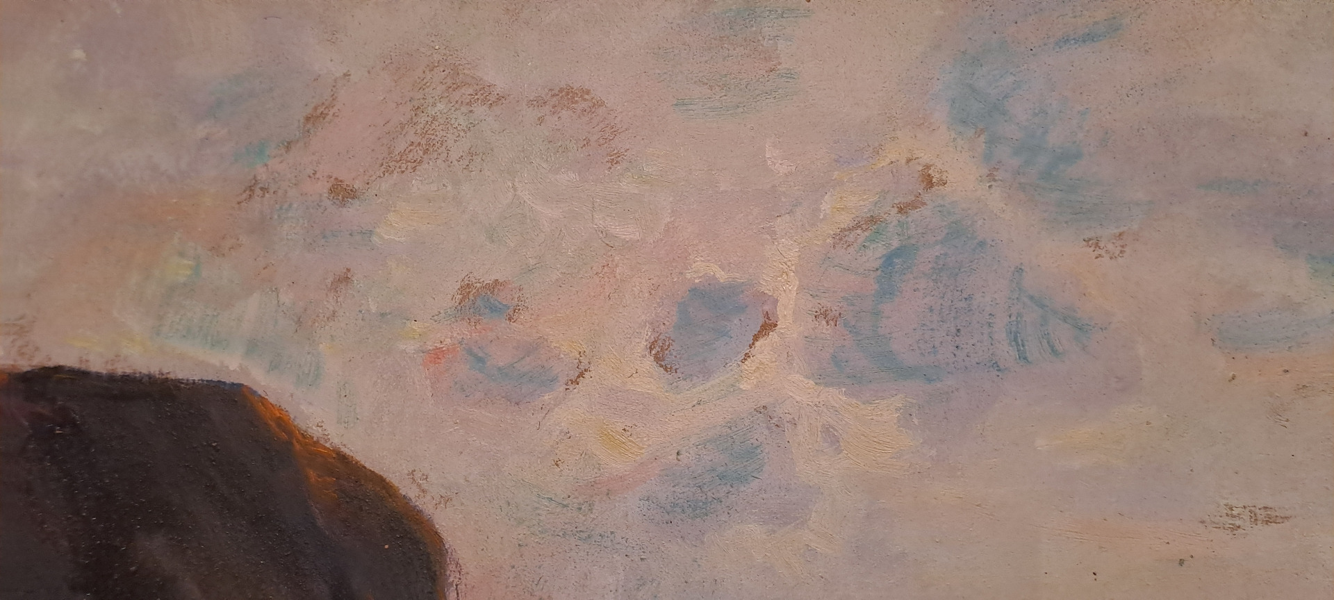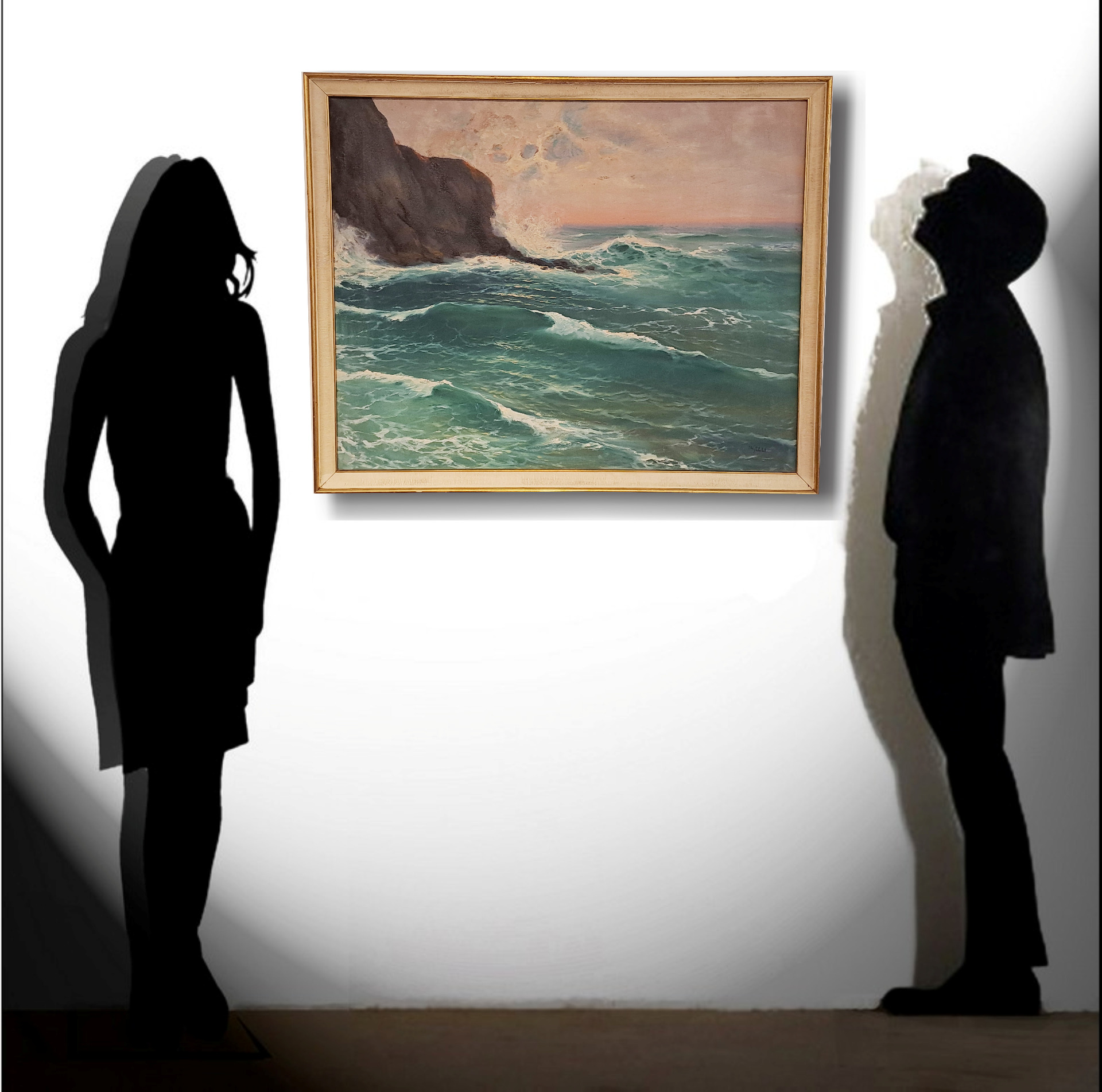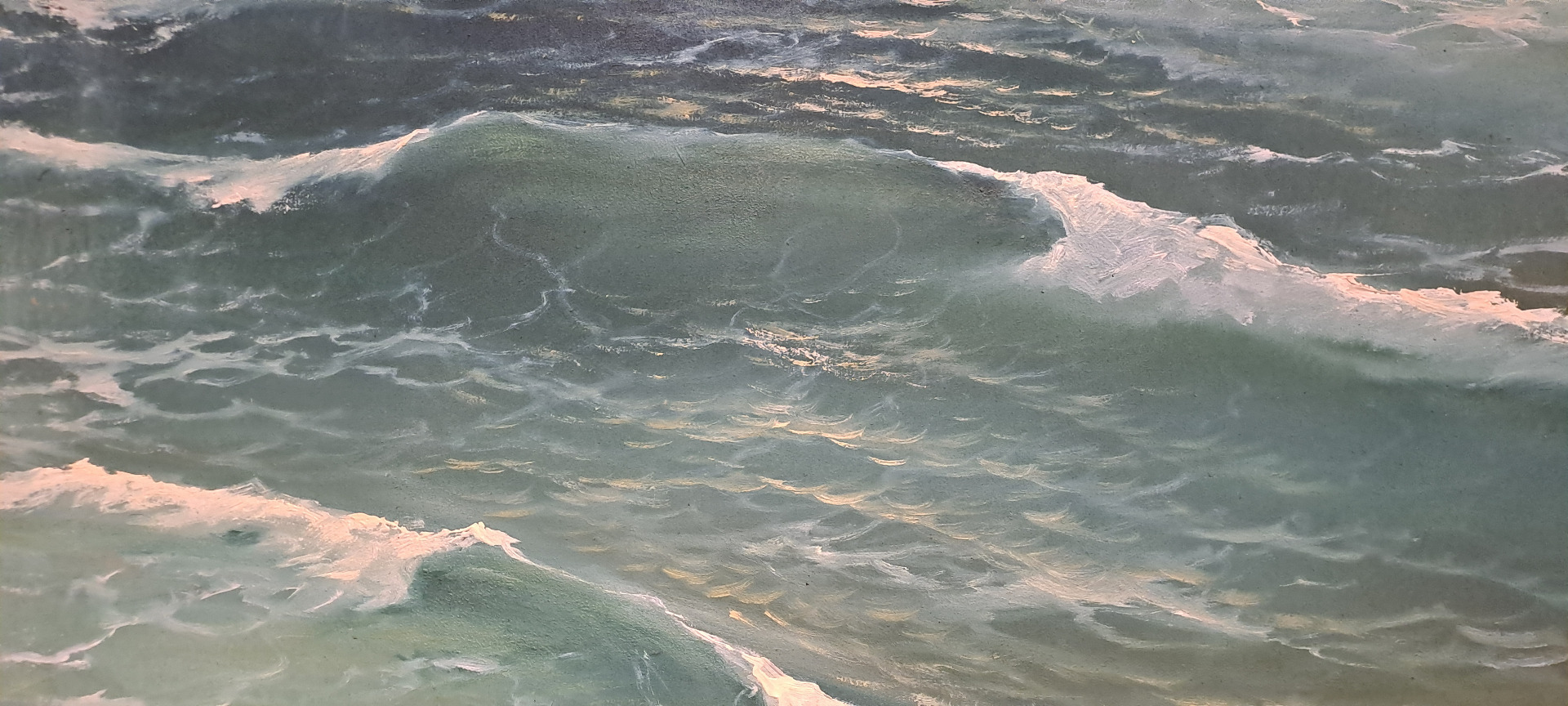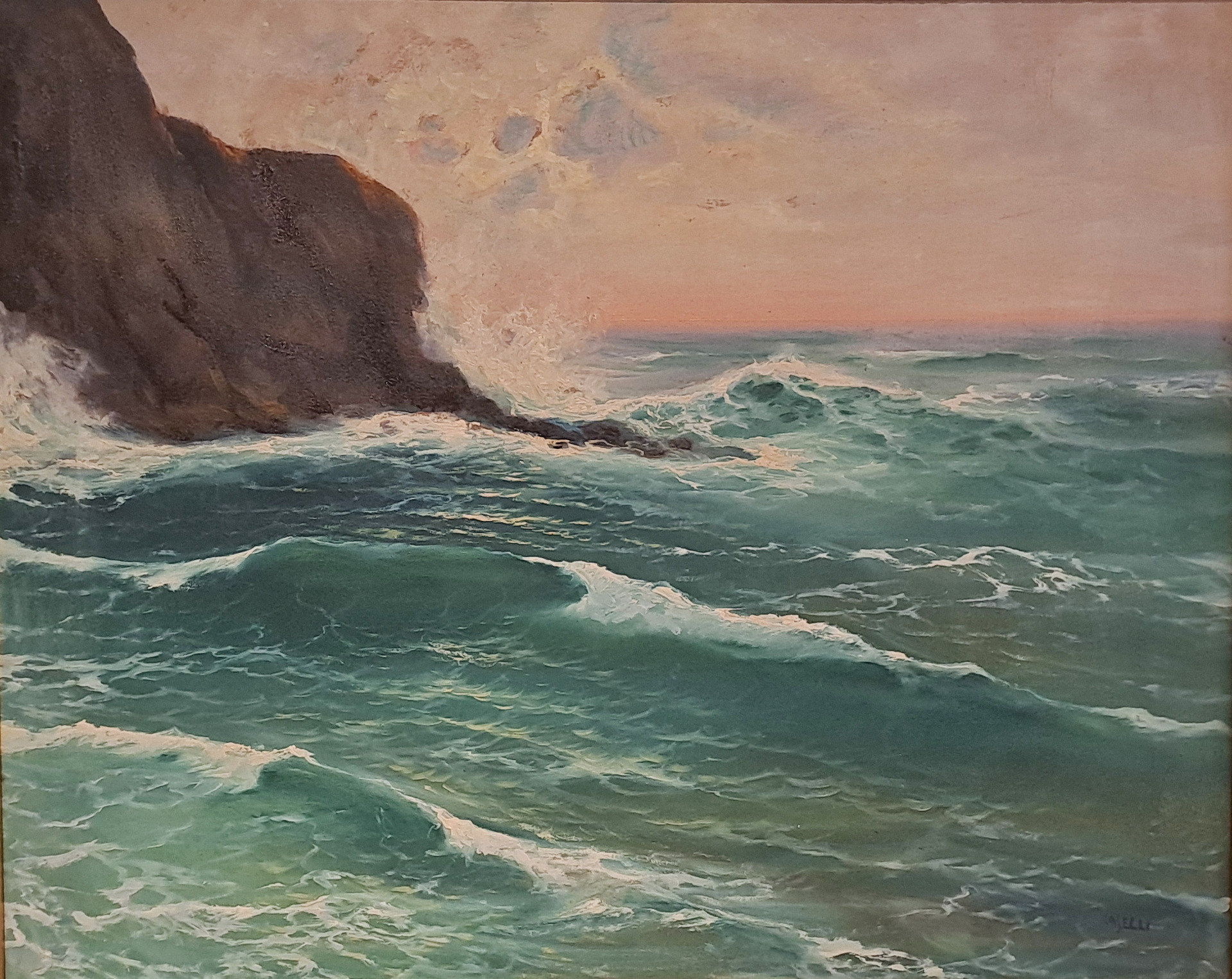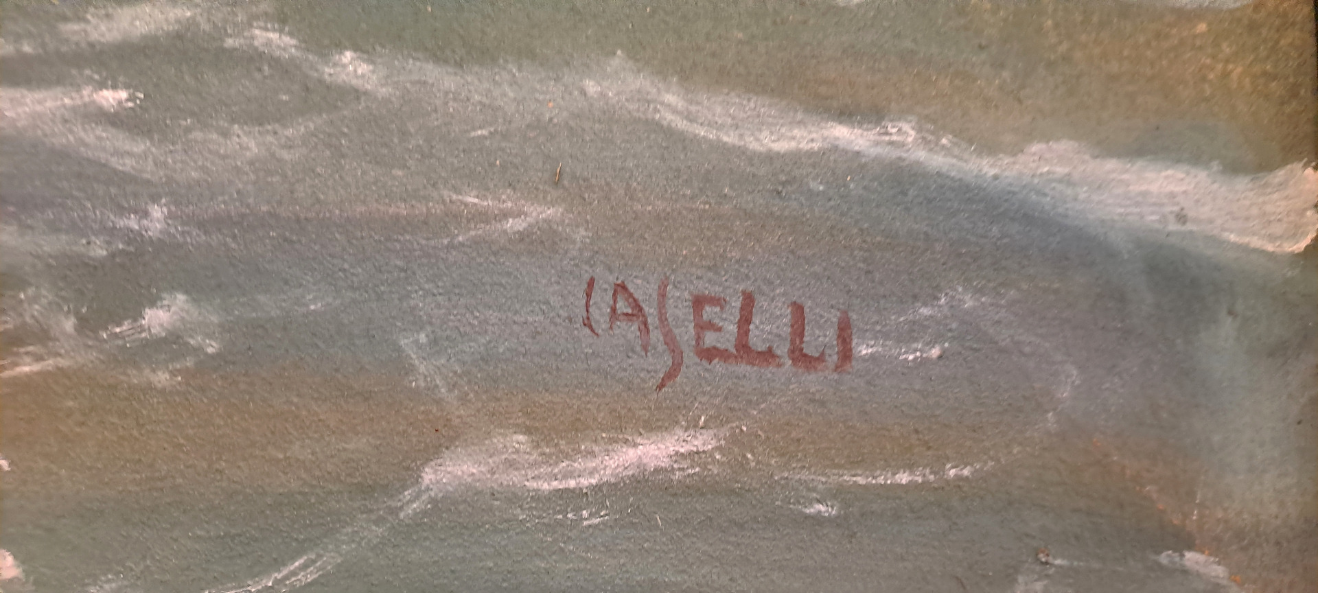 This fascinating painting, the work of the Ligurian painter Giuseppe Caselli (1893-1976), captures the power and beauty of the sea.The artist, known for his vibrant and luminous seascapes, paints a coastal scene that is both dramatic and serene.
