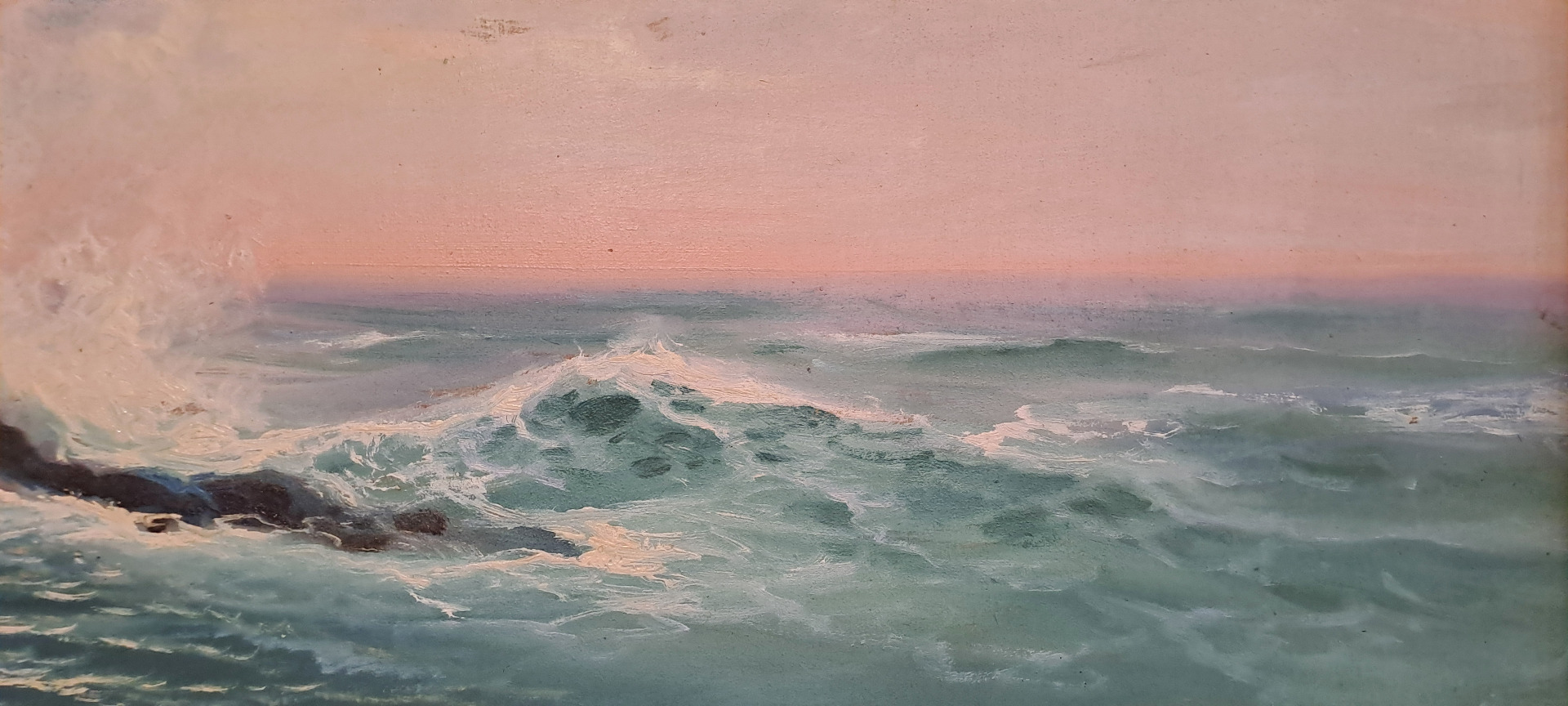 The painting depicts a seascape where foamy waves crash forcefully against a rocky cliff on the left. The color palette is expertly balanced, with tones of aquamarine and turquoise blending into the deep blue of the sea. The white foam of the waves creates a strong dynamic contrast, highlighting the incessant movement of the water. The sky, painted with shades of pastel pink and soft orange, suggests a sunrise or sunset, giving the scene an atmosphere of calm and suggestion.