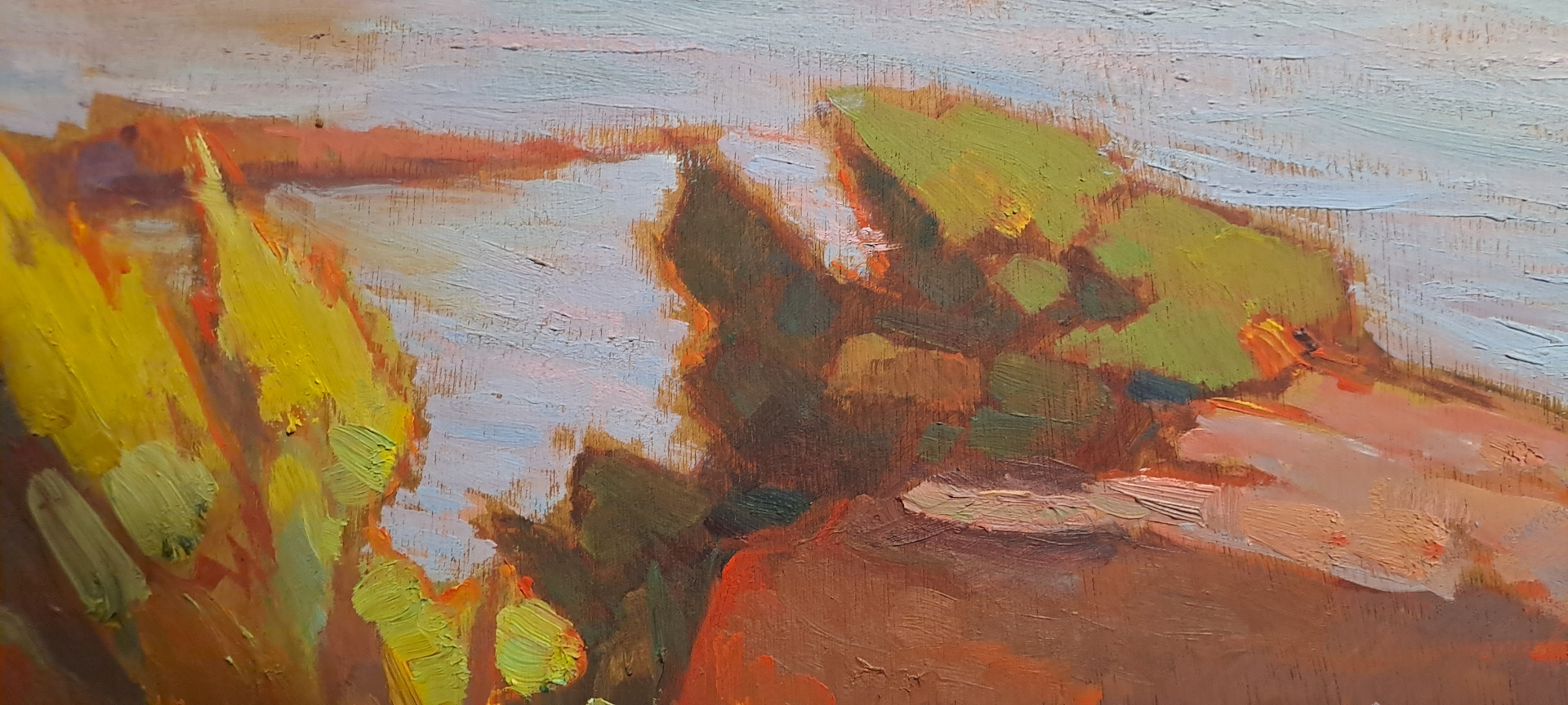 Visual Dynamism: The contrast between the fiery rocks and the sea, rendered with a cold and luminous blue-grey, creates an effect of strong depth and lyricism. The light is reflected on the water creating a suggestive chromatic mirror.