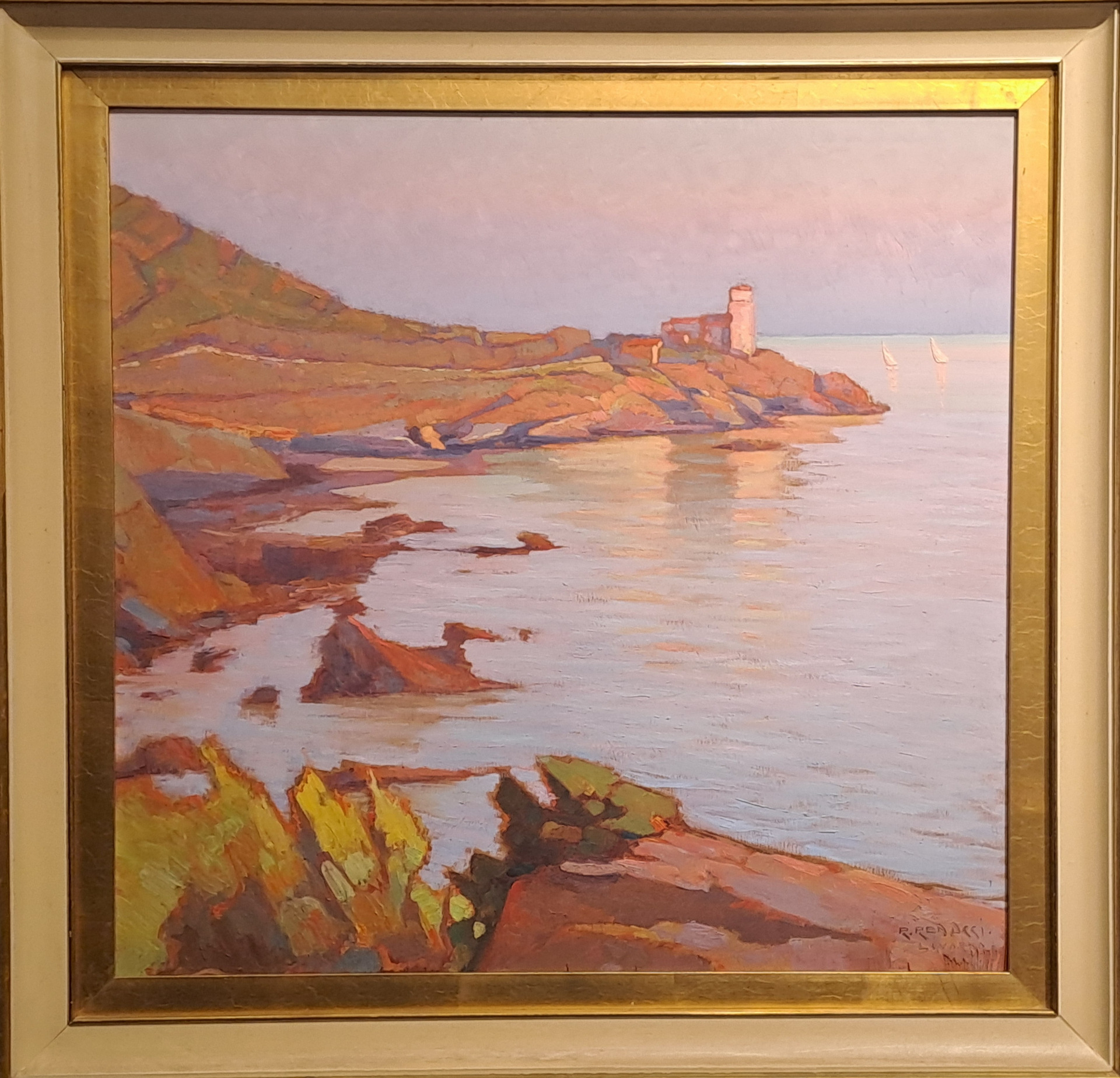 Atmosphere and Color: The painting is a magnificent example of Renucci's ability to render light. The time of day chosen (sunset or dawn) floods the scene with warm orange, red and ochre tones that dress the cliff.