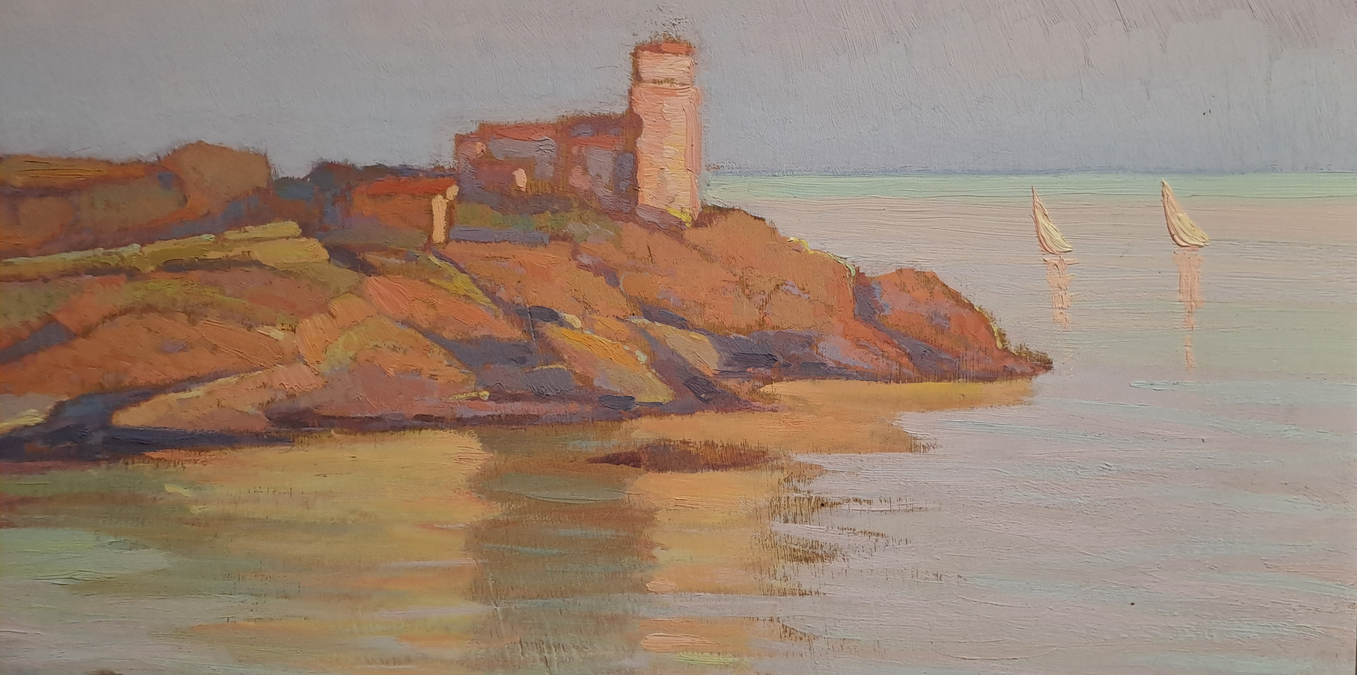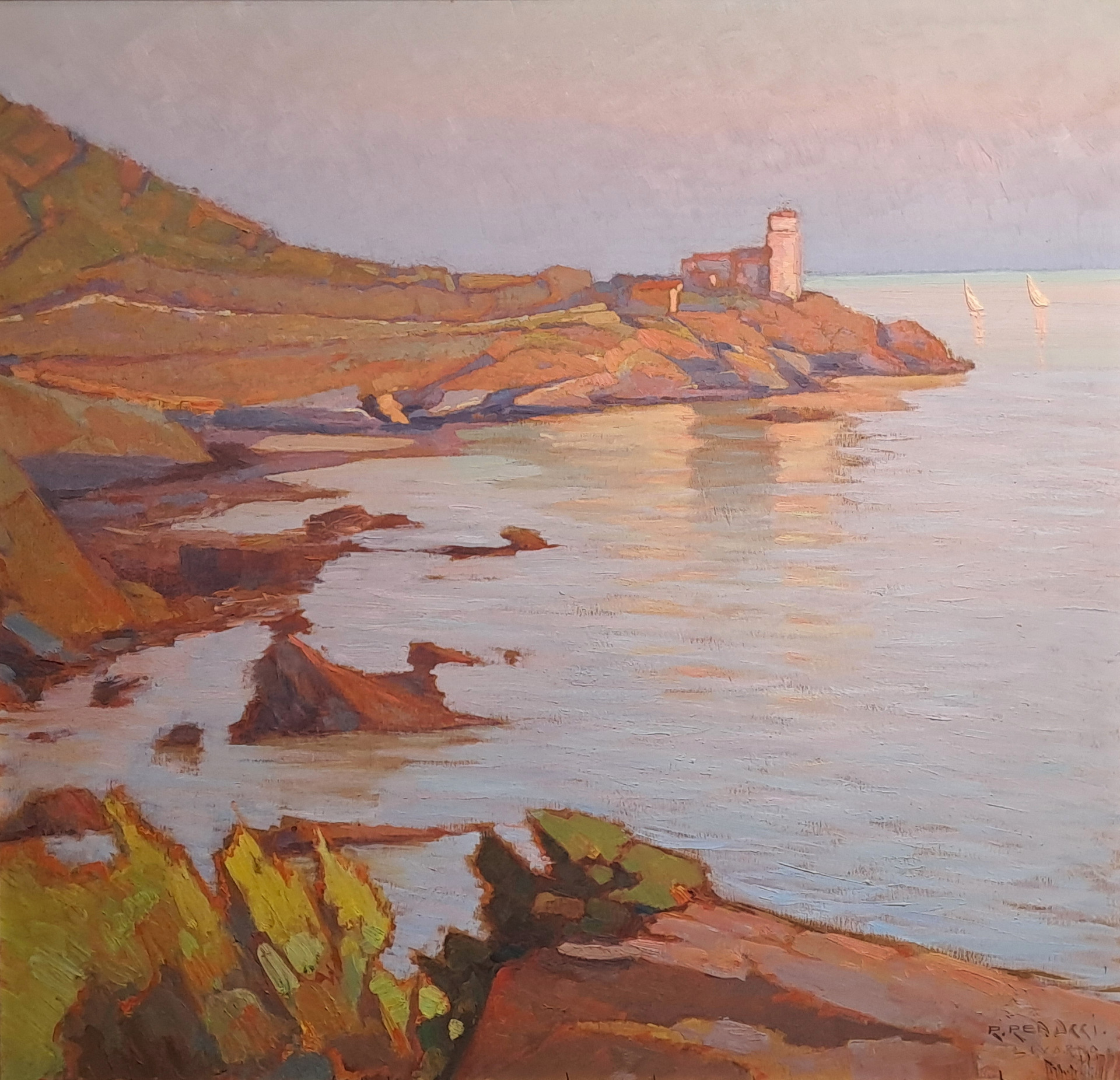 Atmosphere and Color: The painting is a magnificent example of Renucci's ability to render light. The time of day chosen (sunset or dawn) floods the scene with warm orange, red and ochre tones that dress the cliff.