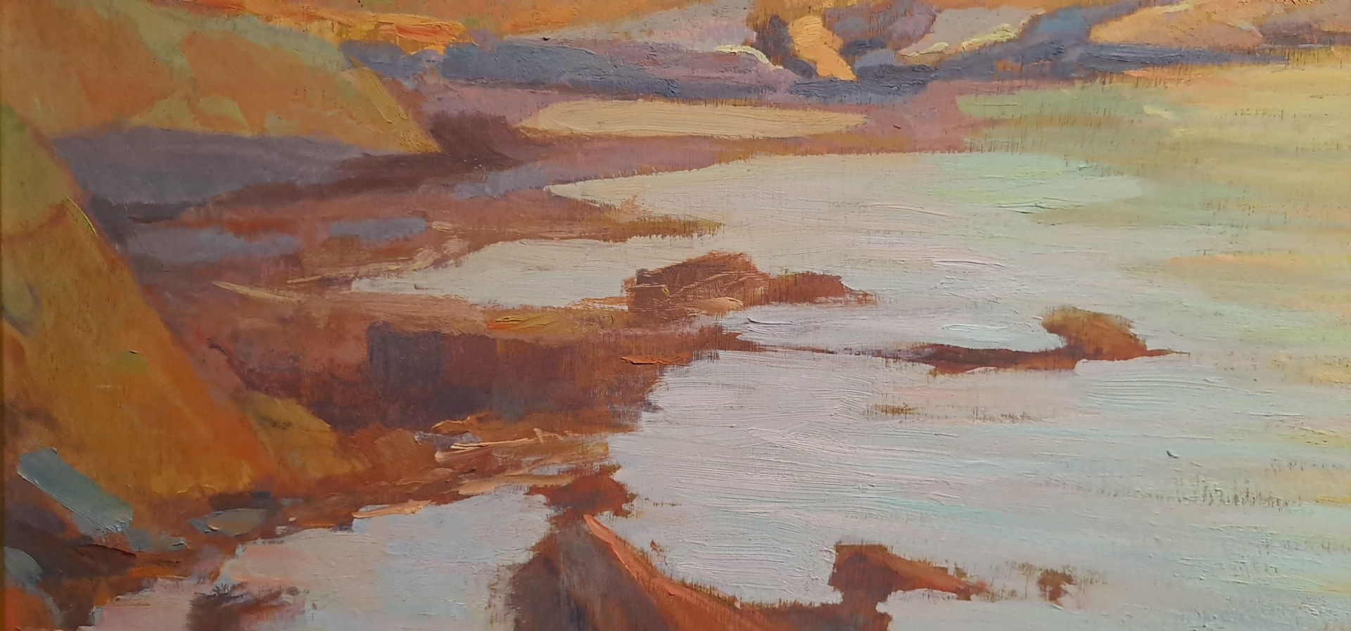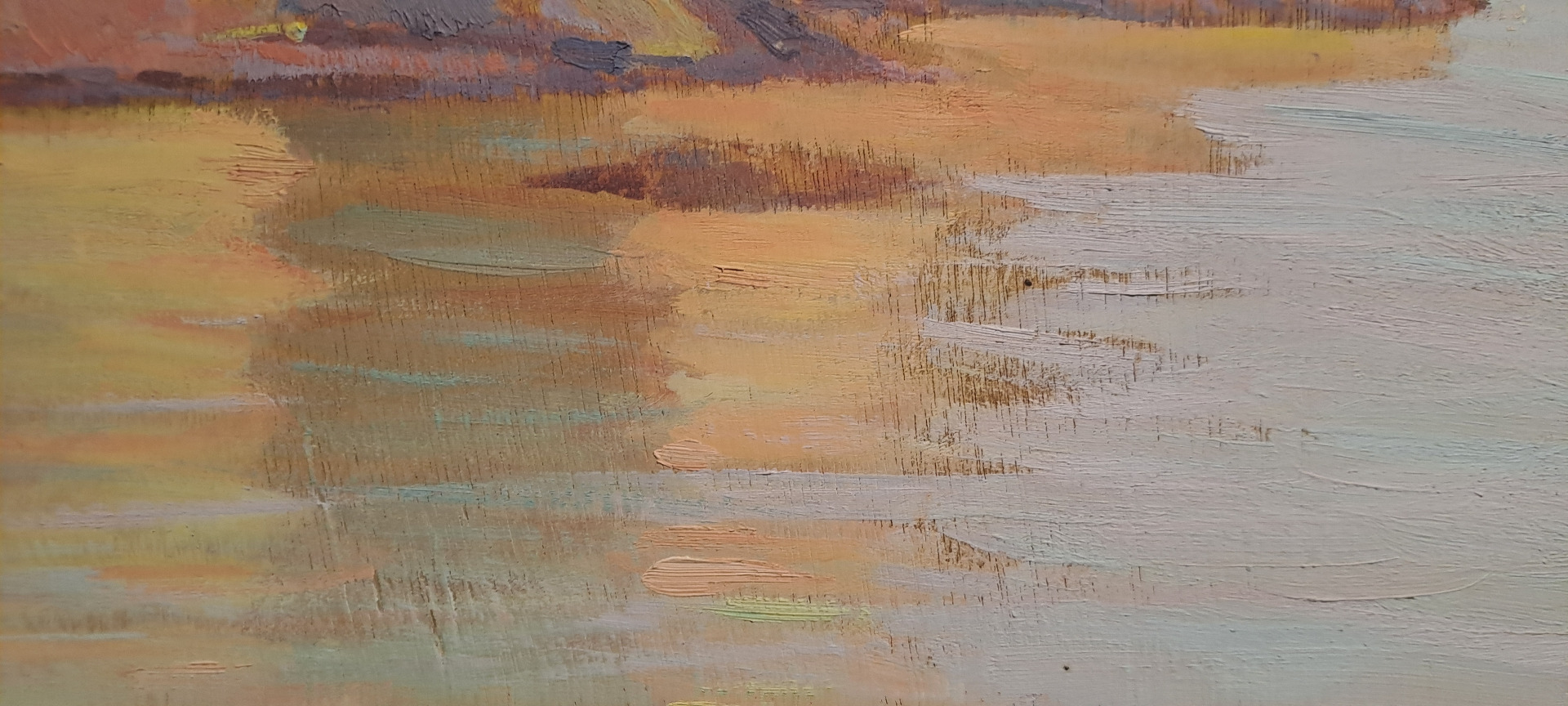 Visual Dynamism: The contrast between the fiery rocks and the sea, rendered with a cold and luminous blue-grey, creates an effect of strong depth and lyricism. The light is reflected on the water creating a suggestive chromatic mirror.