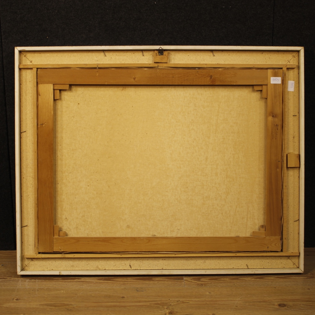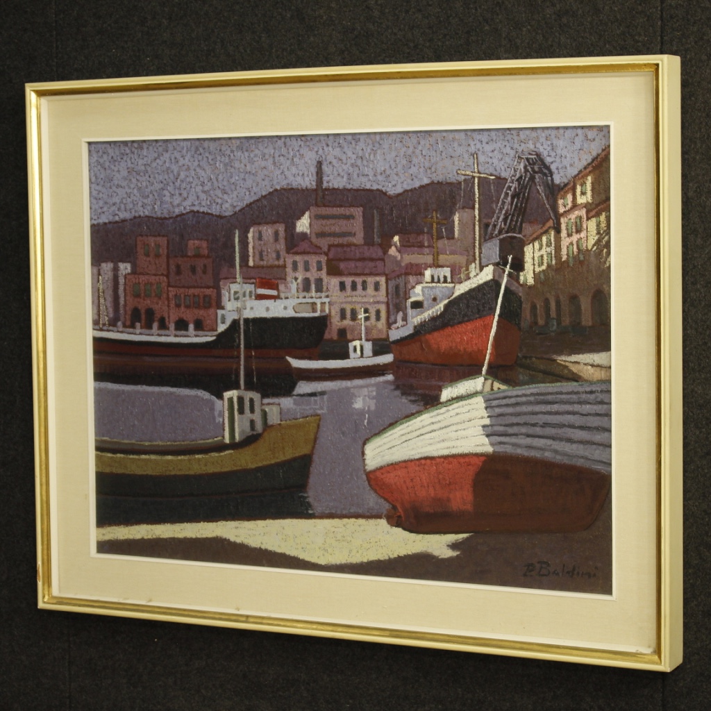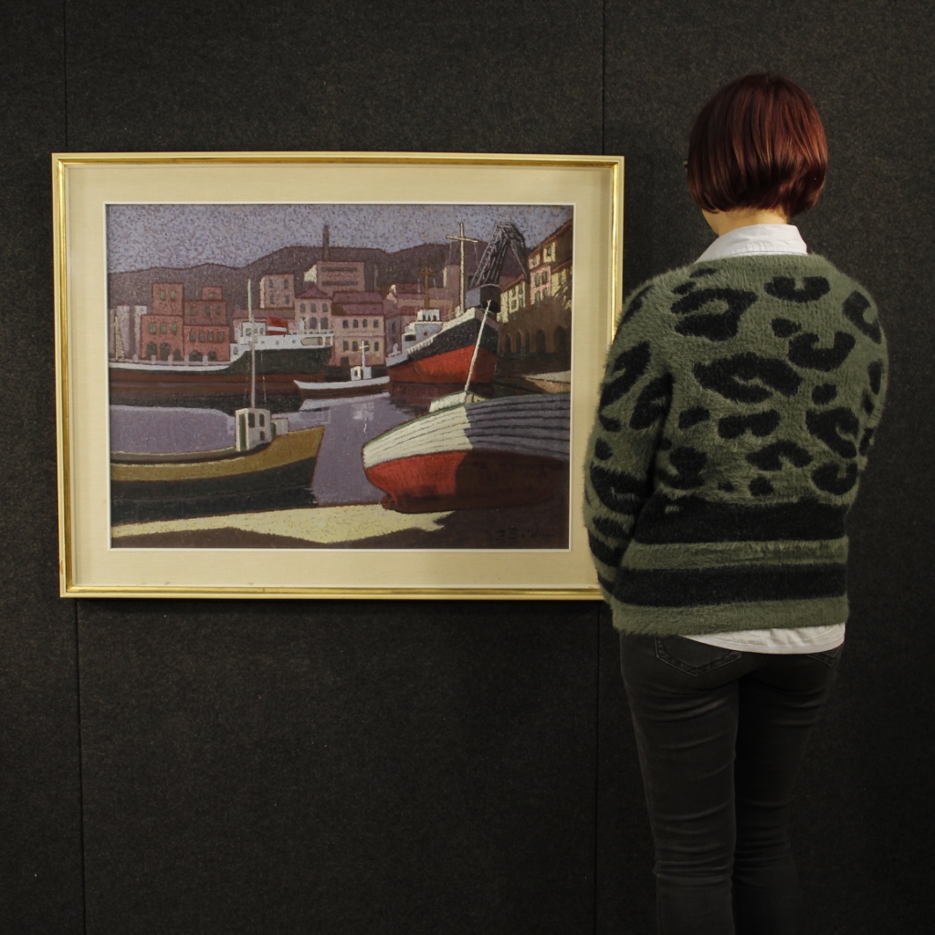 20th century Italian painting. Oil painting on canvas depicting seascape with boats, ships and harbor in the background with a good pictorial quality. Signed painting on the lower right (see photo) for antique dealers and collectors. Modern lacquered and gilded frame with passe-partout in fabric (with some small marks) and protective glass. Beautiful framework of pleasant decor in good state of preservation. Sight size: H 60 x W 90 cm.