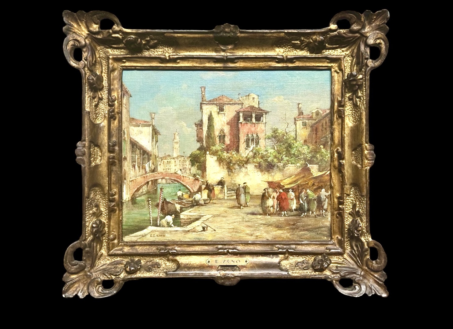 Oil on canvas painting depicting a Venetian view. Signature E. Zeno. Cm 44x39. Canvas: cm 32x27. Zeno is the pseudonym of Eugenio Bonivento (1880–1956), an Italian painter known above all for his views of the lagoon and the Venetian countryside. He studied at the Academy of Fine Arts in Venice, where he was a student of Guglielmo Ciardi, and interpreted the painting of the Venetian masters of the 18th century with a modern style, characterized by a "full-bodied and dynamic" brushstroke and the use of light. His works are exhibited in galleries such as the Galleria d'arte moderna in Milan and the Galleria internazionale d'arte moderna in Venice.