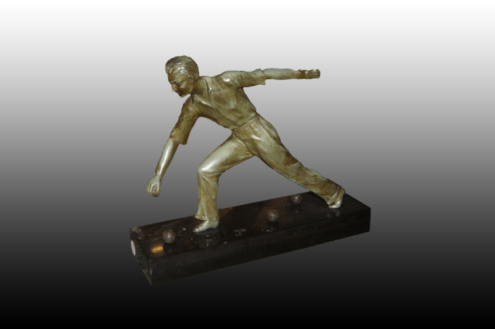 Scultura francese di inizio 1900, stile Decò in bronzo con base in marmo, raffigurante giocatore di bocce.