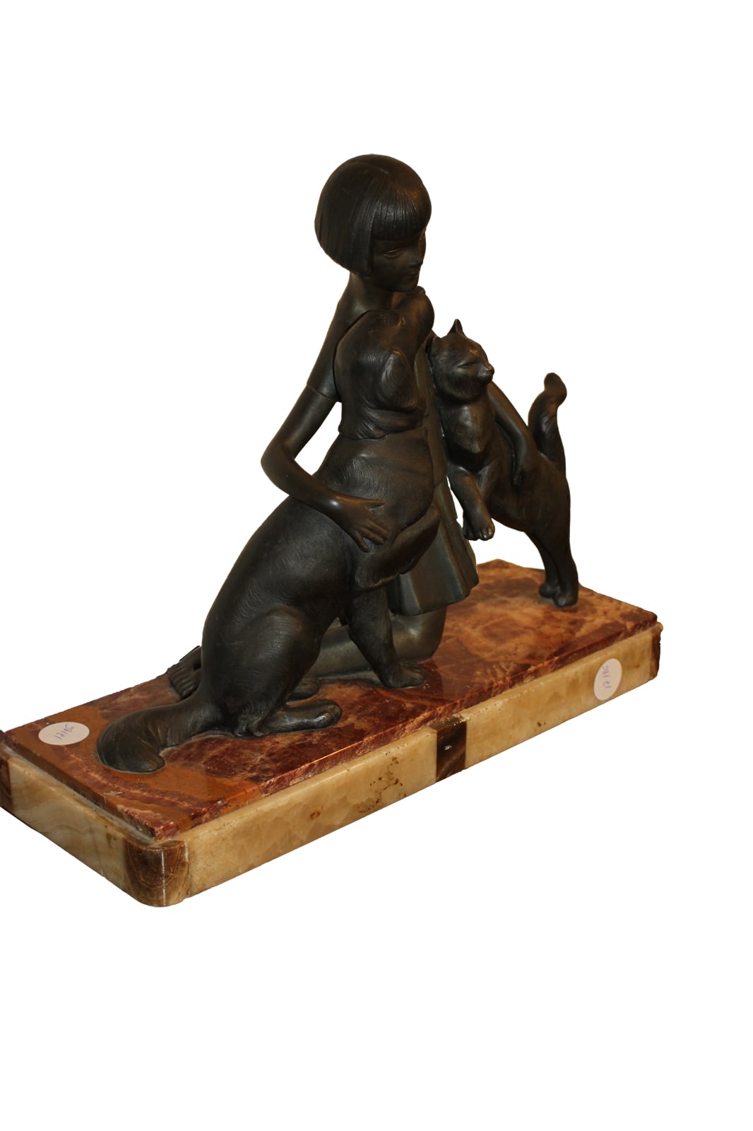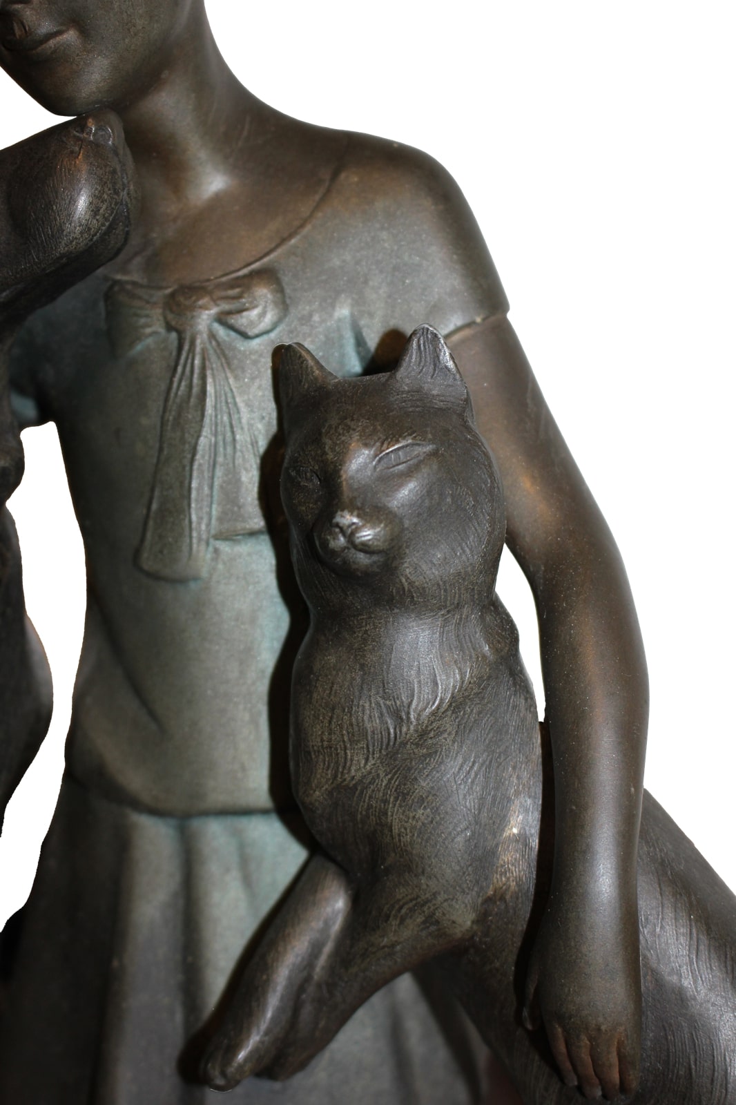L’opera raffigura una graziosa fanciulla in compagnia di un cane e di un gatto, resa con raffinatezza e armonia tipiche del gusto Déco. Il bronzo presenta una superficie finemente cesellata e patinata, che valorizza i dettagli del volto e del movimento delle figure.