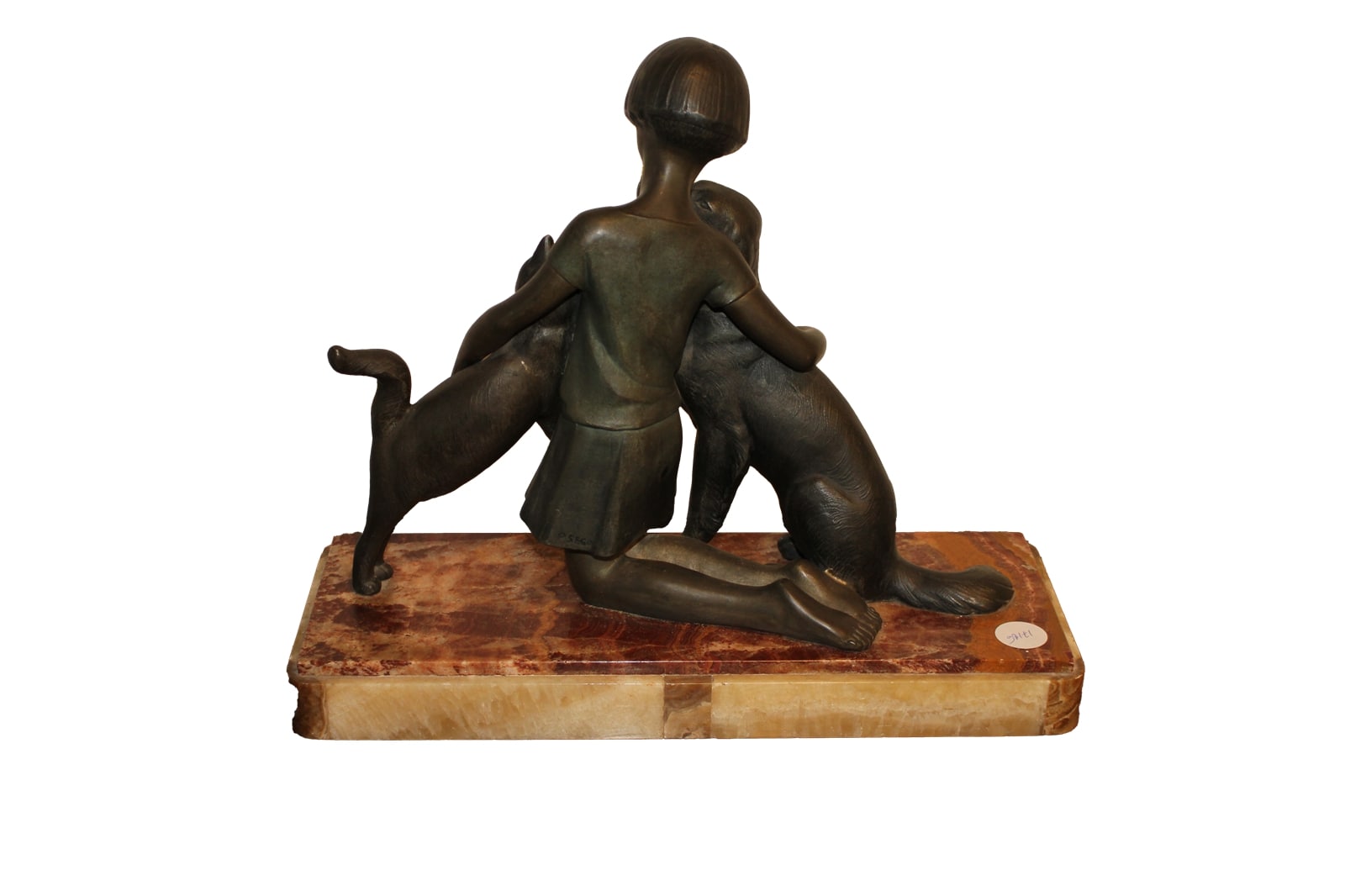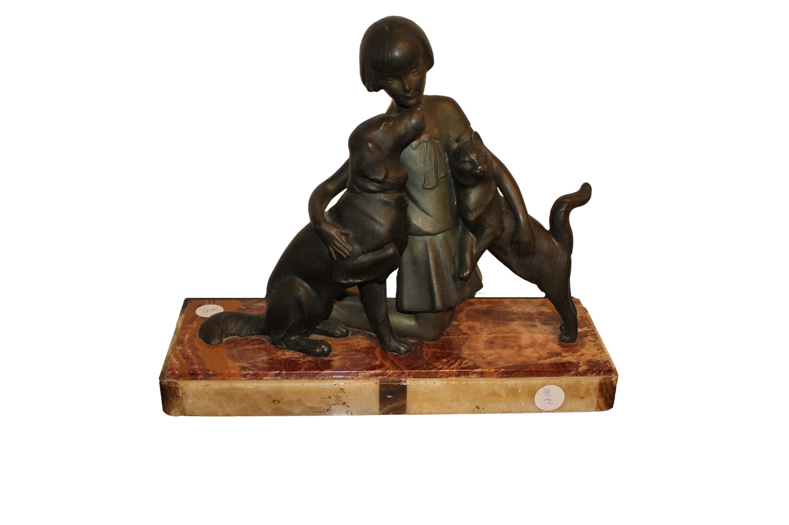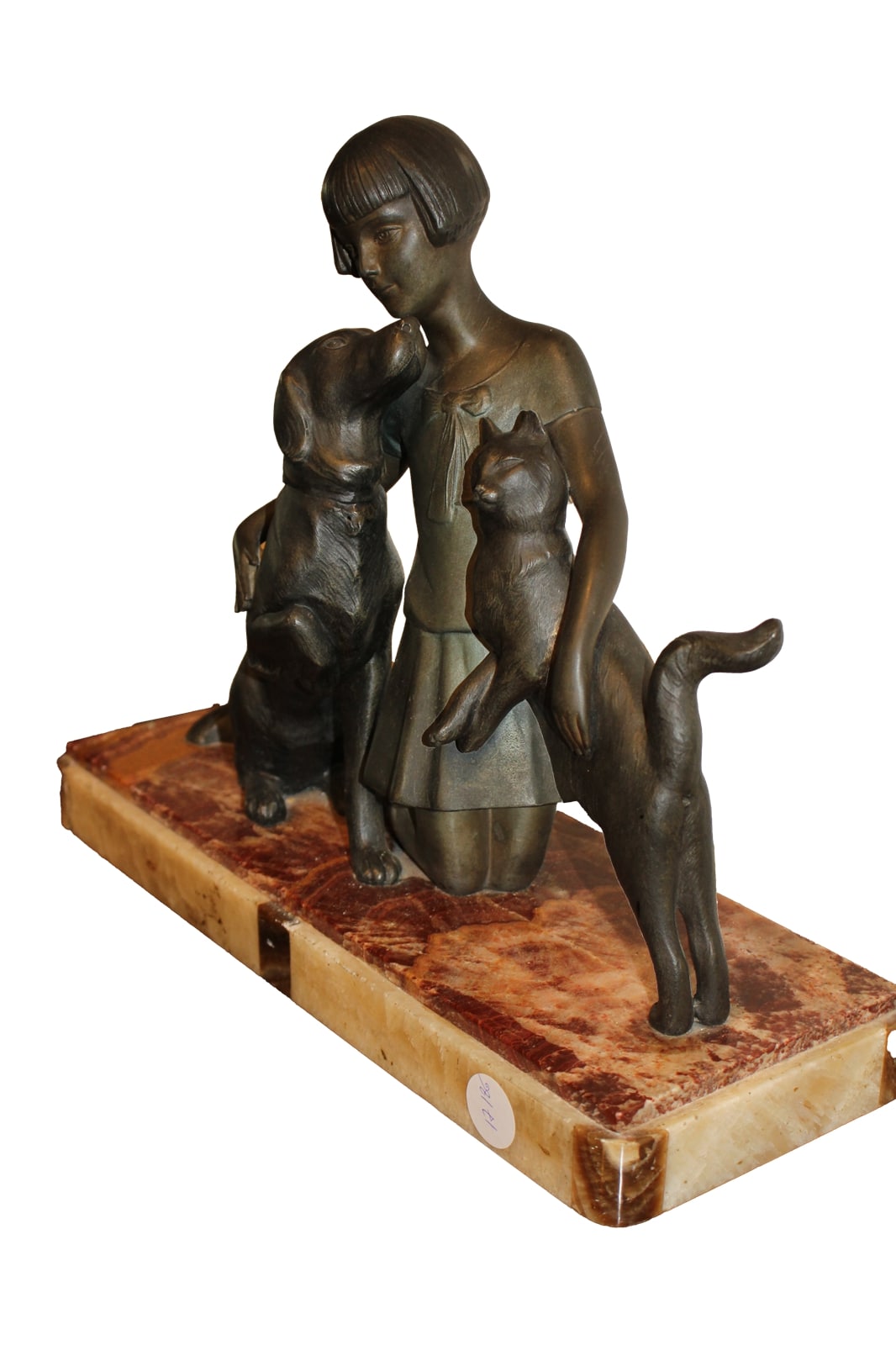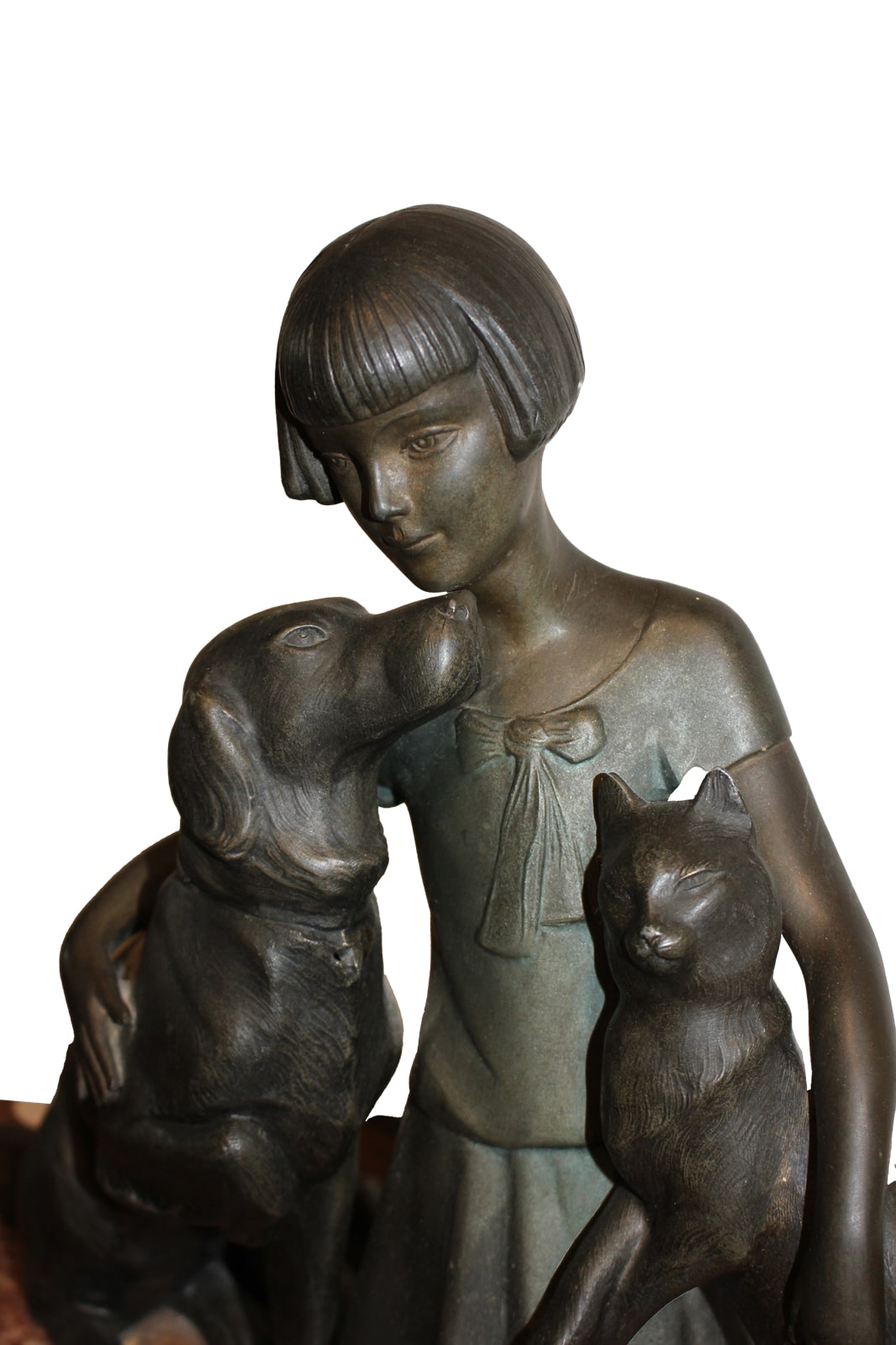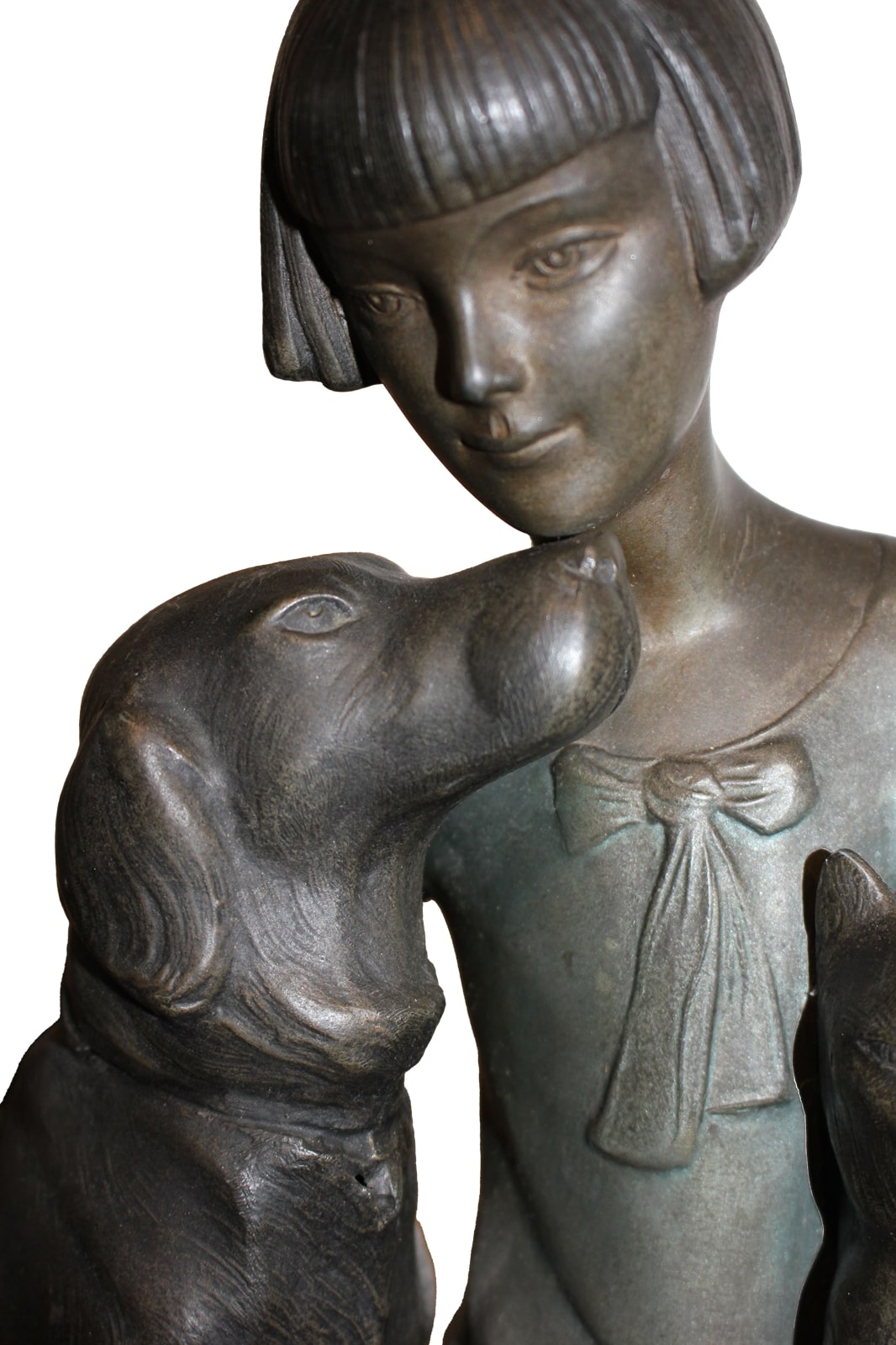 Scultura decò francese fanciulla con cane e gatto firmata da P. Sega - XX secolo