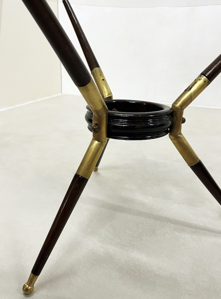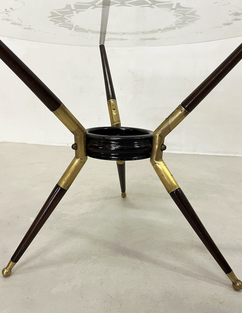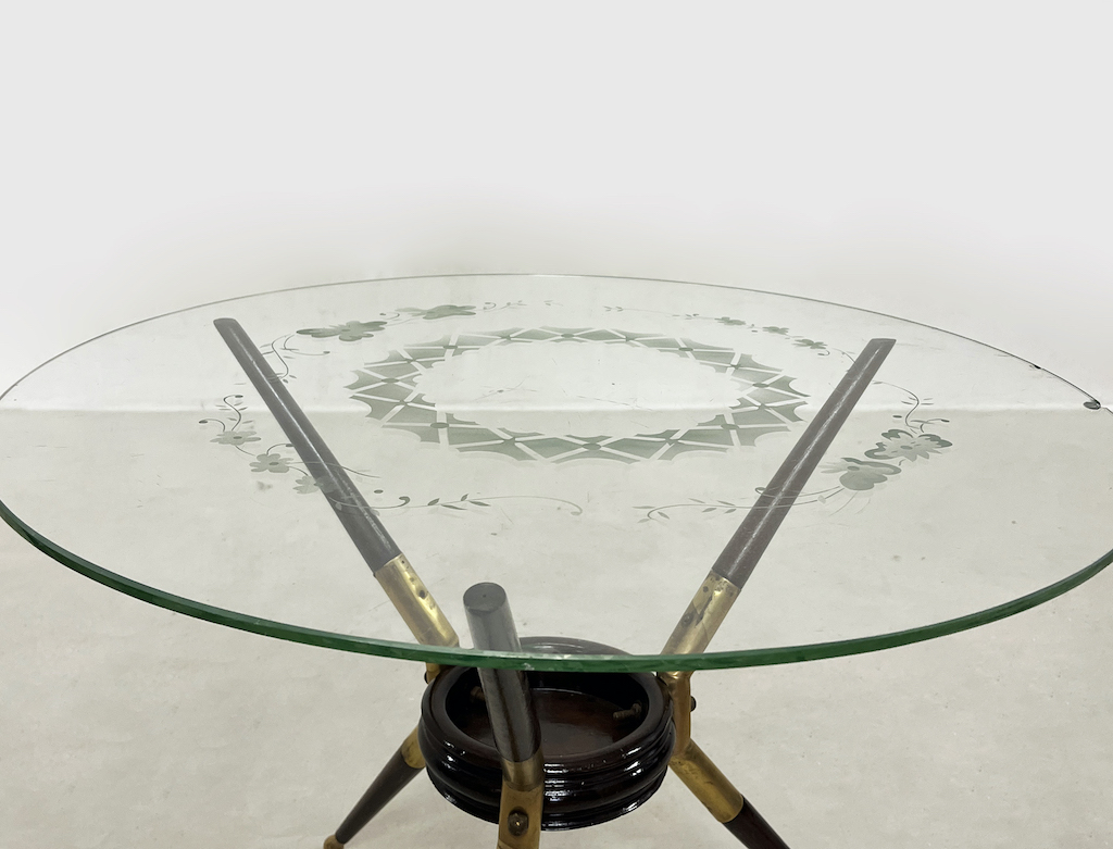 Particular coffee table attributed to Cesare Lacca 1950 with a three-legged structure made of black ebonized wood and brass, with a central round element and a transparent glass top decorated with floral and geometric motifs. Defects highlighted in the photos. Origin: Italy Period: 1950...