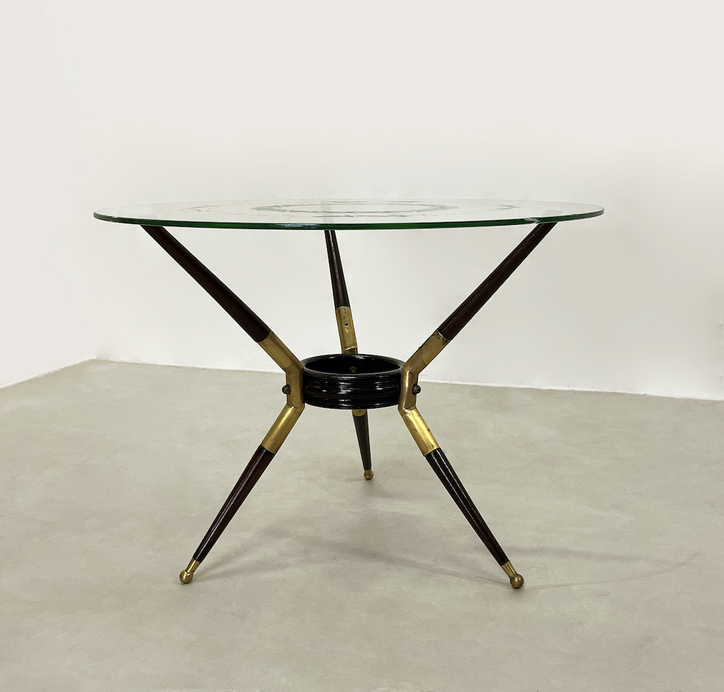 Particular coffee table attributed to Cesare Lacca 1950 with a three-legged structure made of black ebonized wood and brass, with a central round element and a transparent glass top decorated with floral and geometric motifs. Defects highlighted in the photos. Origin: Italy Period: 1950 Dimensions: Ø 65 x H 50 cm