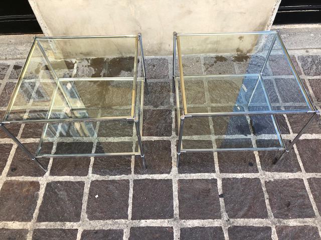 Coppia di tavolini in metallo con piani in cristallo.