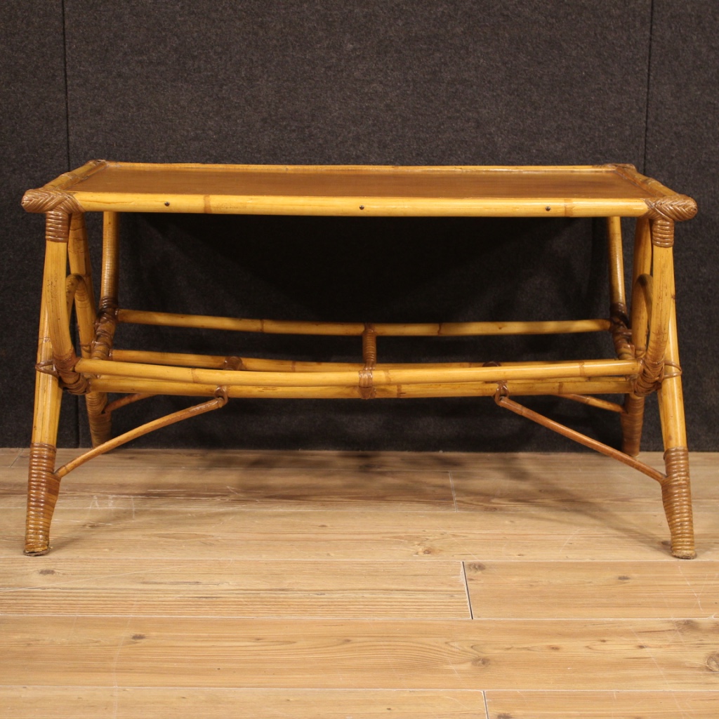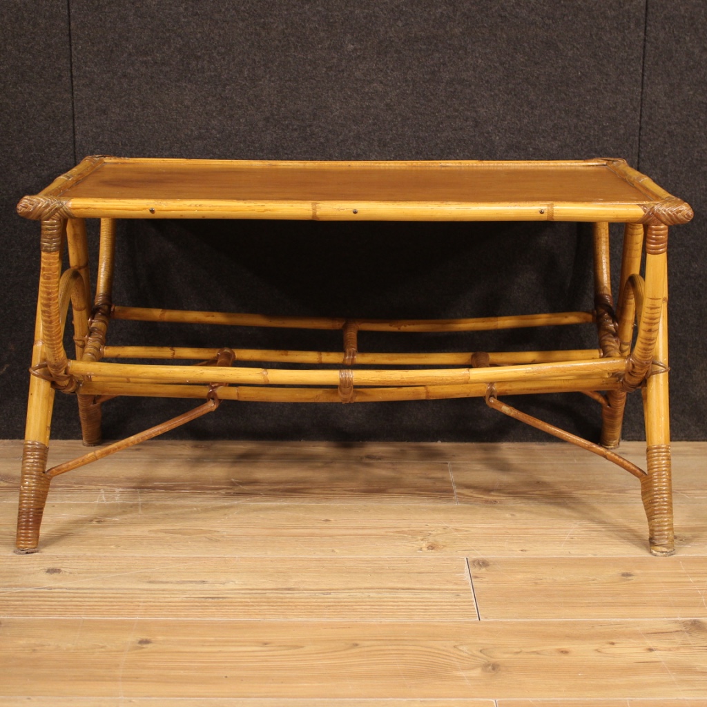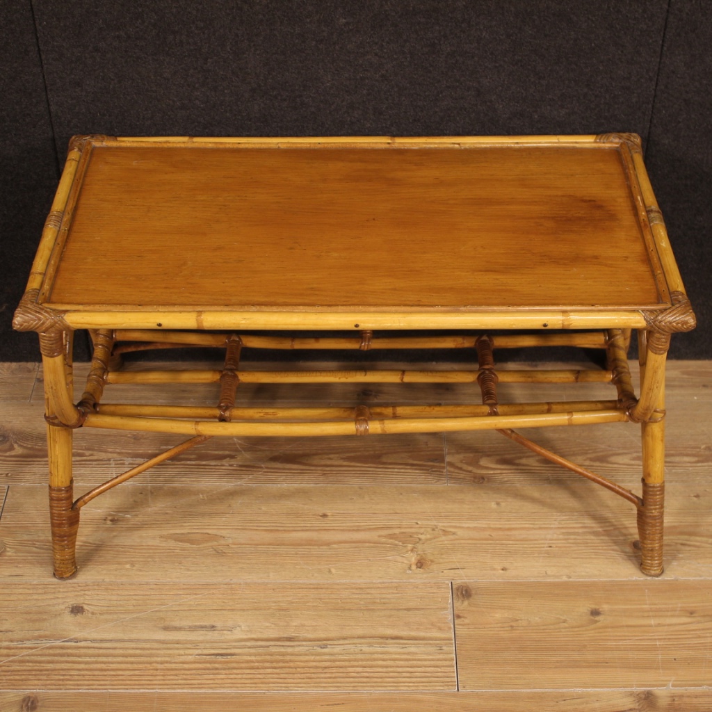Italian design coffee table from the 70s. Furniture in bamboo, exotic wood and woven wood of beautiful lines and pleasant decor. Coffee table equipped with a solid wooden top and magazine compartment underneath, of good utility and service. Ideal furniture to be placed in a living room, for antique dealers and interior decorators. Coffee table with some small signs of wear, overall in a good state of conservation.
