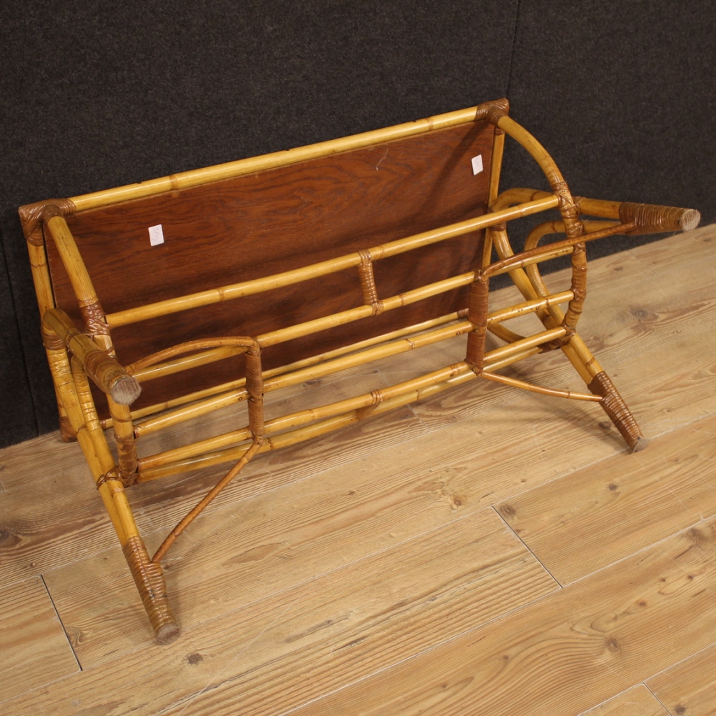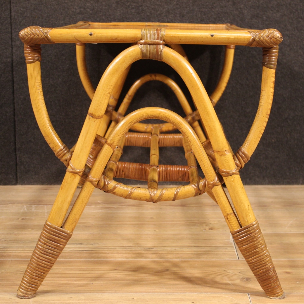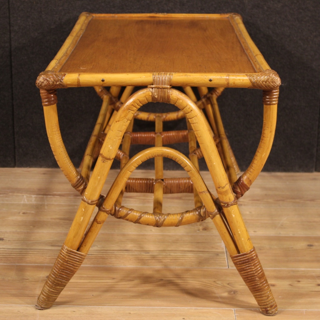 Italian design coffee table from the 70s. Furniture in bamboo, exotic wood and woven wood of beautiful lines and pleasant decor. Coffee table equipped with a solid wooden top and magazine compartment underneath, of good utility and service. Ideal furniture to be placed in a living room, for antique dealers and interior decorators. Coffee table with some small signs of wear, overall in a good state of conservation.