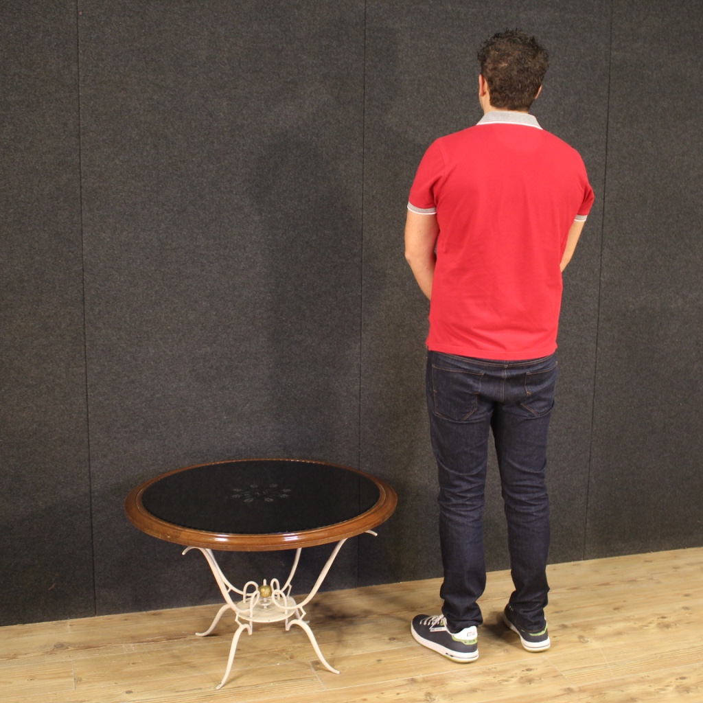 French design coffee table from 60s / 70s. Furniture with painted and gilded metal base, wooden top with chiseled built-in mirror of excellent quality. Coffee table of good size and service, of excellent solidity and stability. Furniture for antique dealers and interior decorators, difficult to find. Mirror top with some small scratches, without cracks or chips (see photos). In good condition with some small signs of aging.