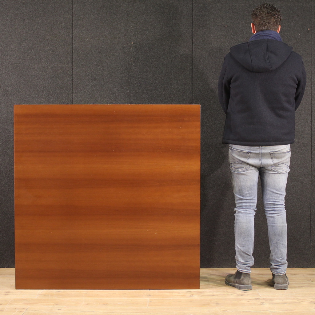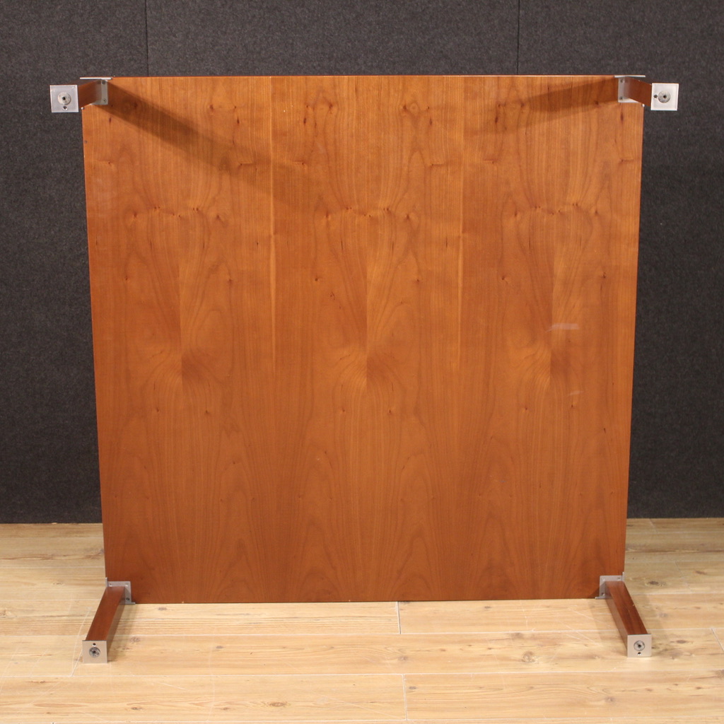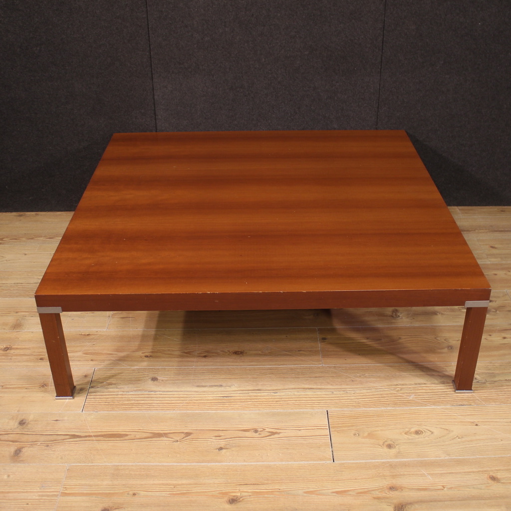 Great Italian coffee table from the 1980s. Cherry veneered design furniture of exceptional size and great service. Coffee table supported by four solid legs with silver metal decorations (see photo). Ideal furniture to be placed in a large living room or hall, for antique dealers and interior decorators. The top has small signs of wear (see photos). Coffee table of beautiful line and pleasant decor, overall in a good state of conservation.