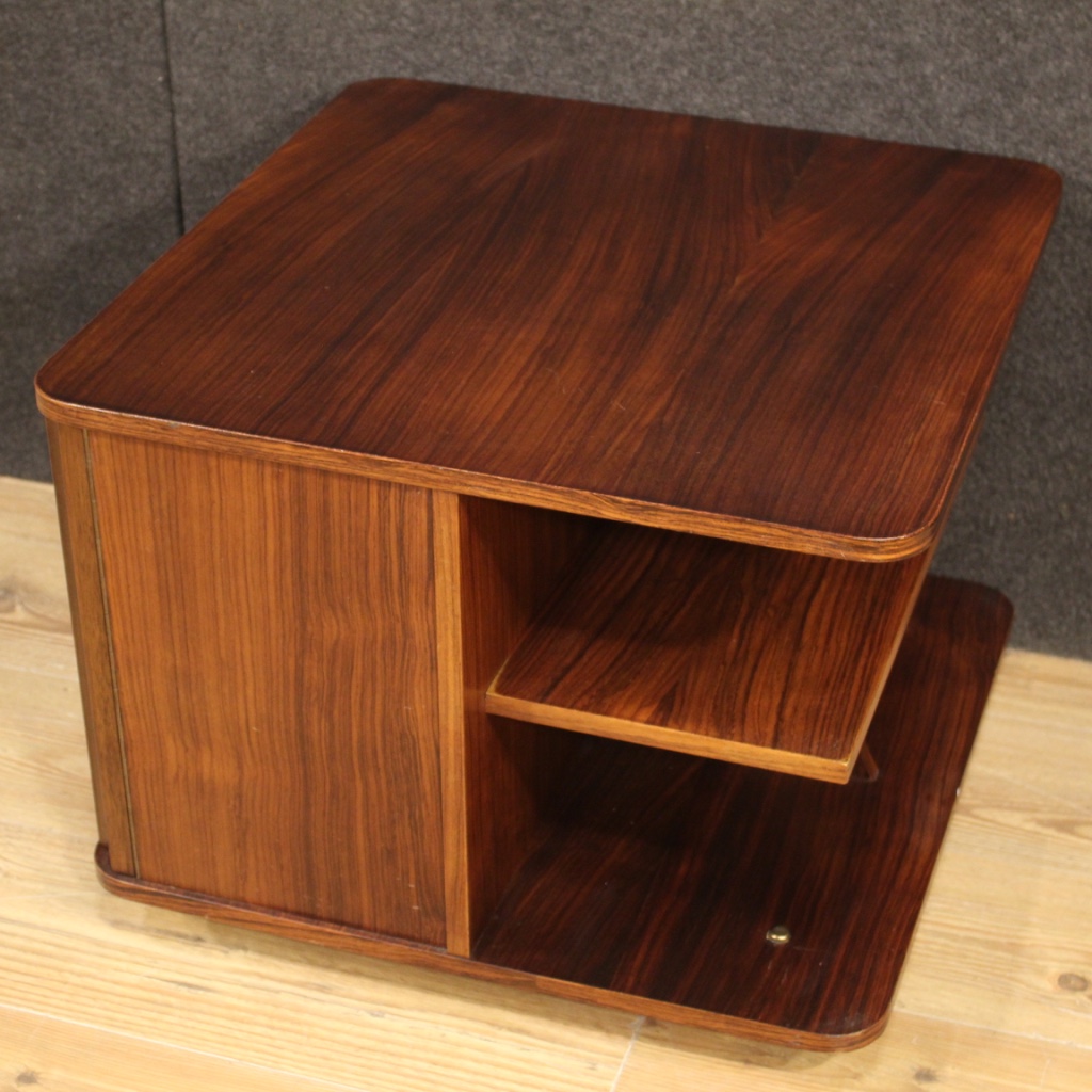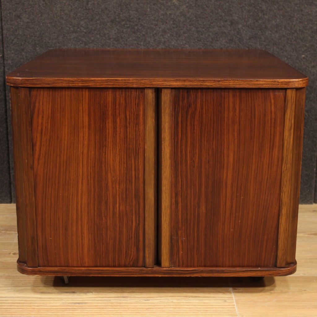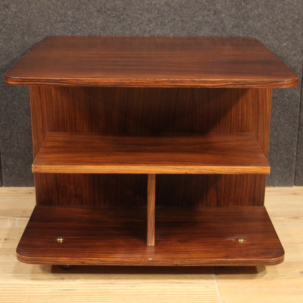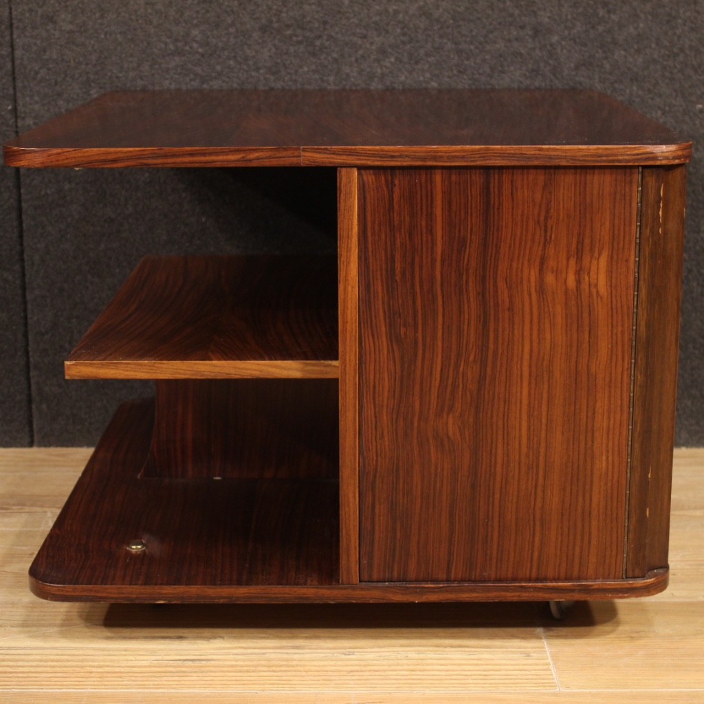 Italian coffee table from the 70s / 80s. Furniture in walnut and palisander woods mounted on swivel castors (see photo). Table of excellent proportion and service equipped with three shelves and two side doors (see photo). Ideal furniture for a living room but it can be easily placed in different points of the house. In good condition with some small signs of aging.