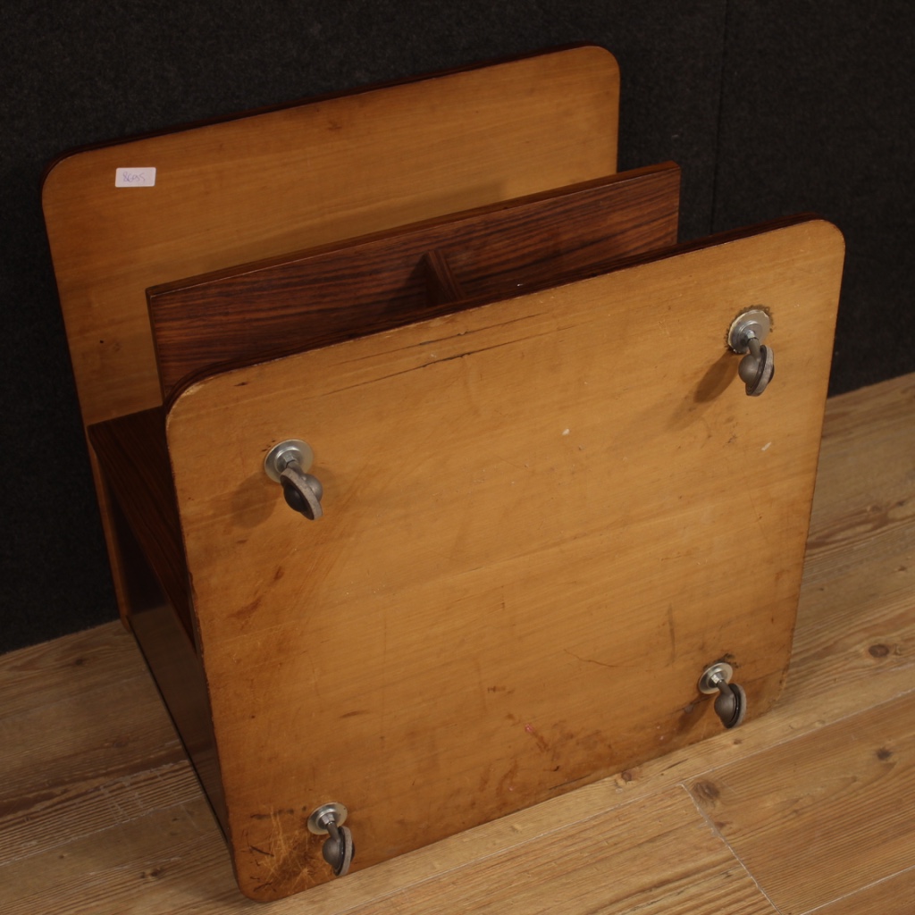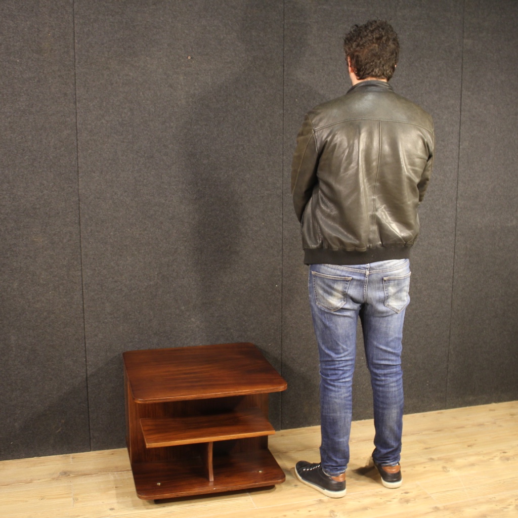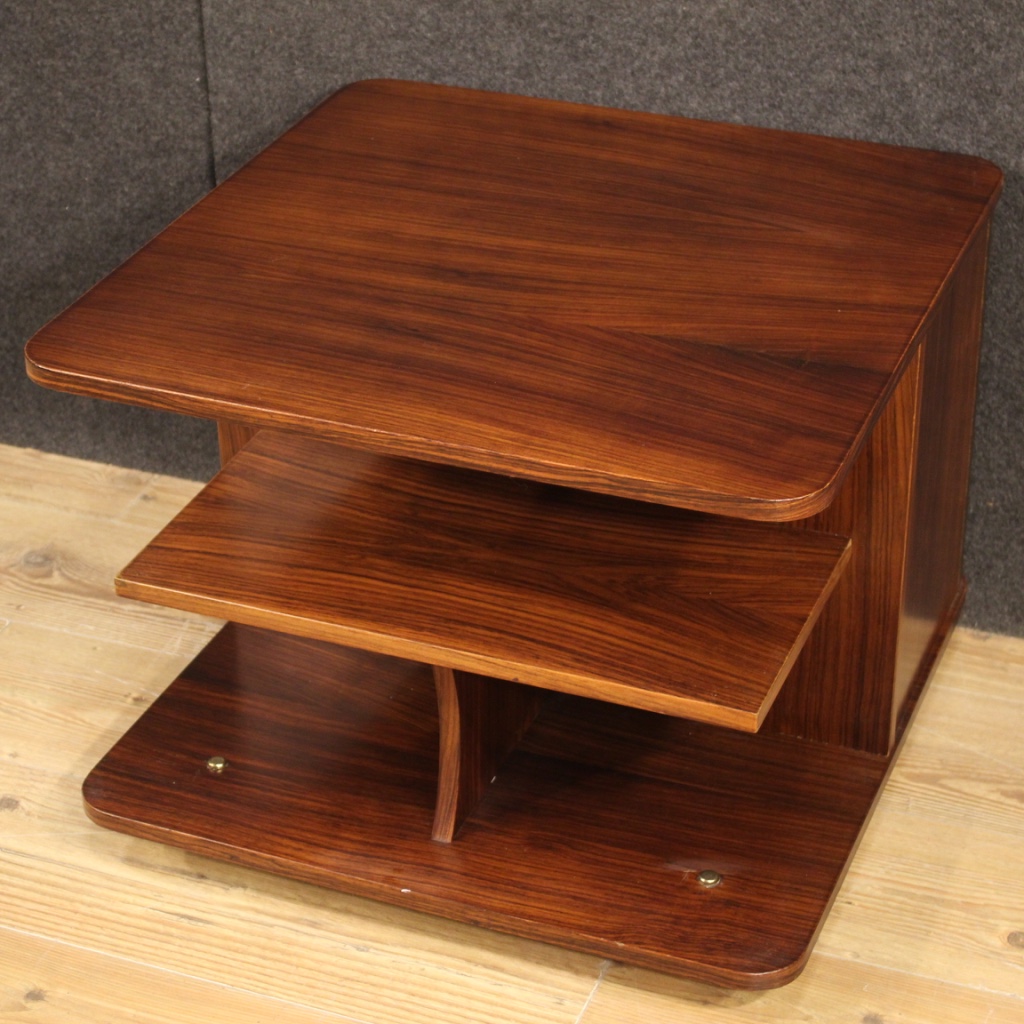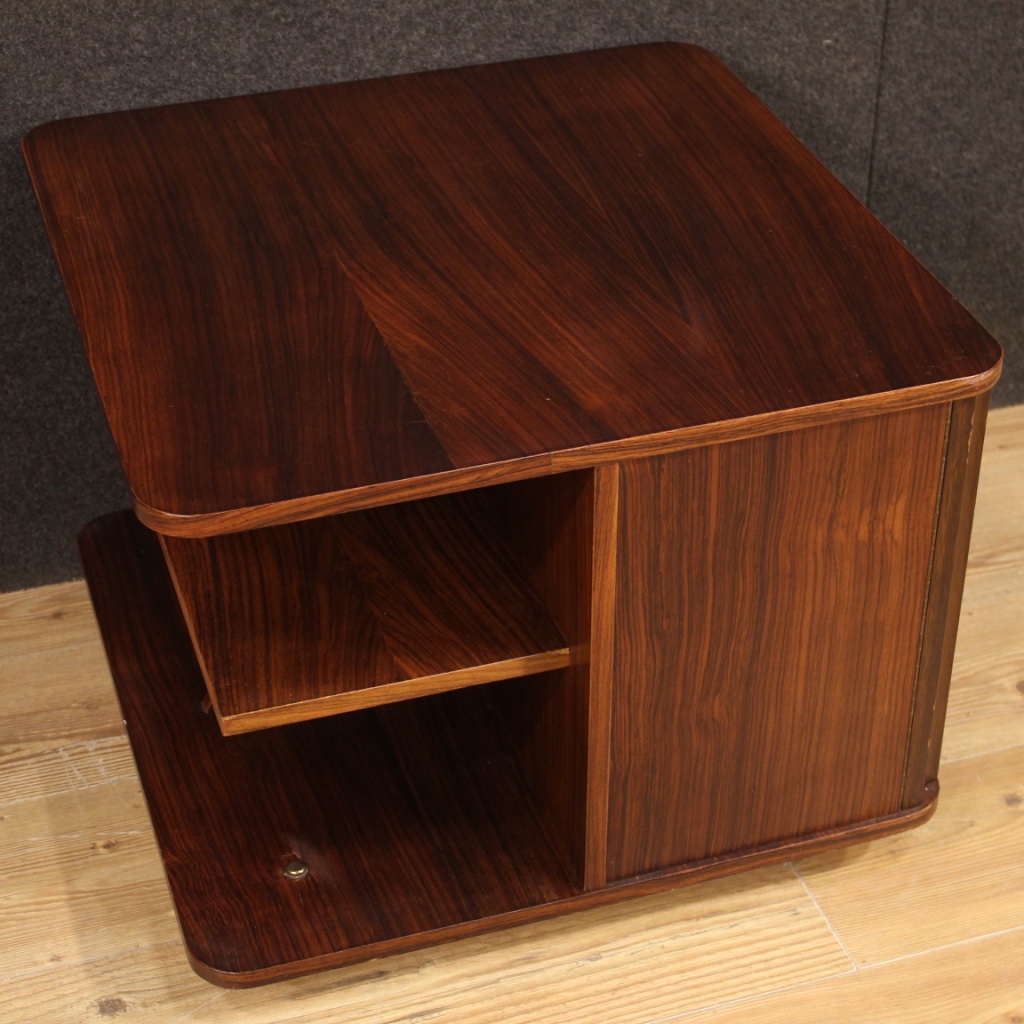 Italian coffee table from the 70s / 80s. Furniture in walnut and palisander woods mounted on swivel castors (see photo). Table of excellent proportion and service equipped with three shelves and two side doors (see photo). Ideal furniture for a living room but it can be easily placed in different points of the house. In good condition with some small signs of aging.