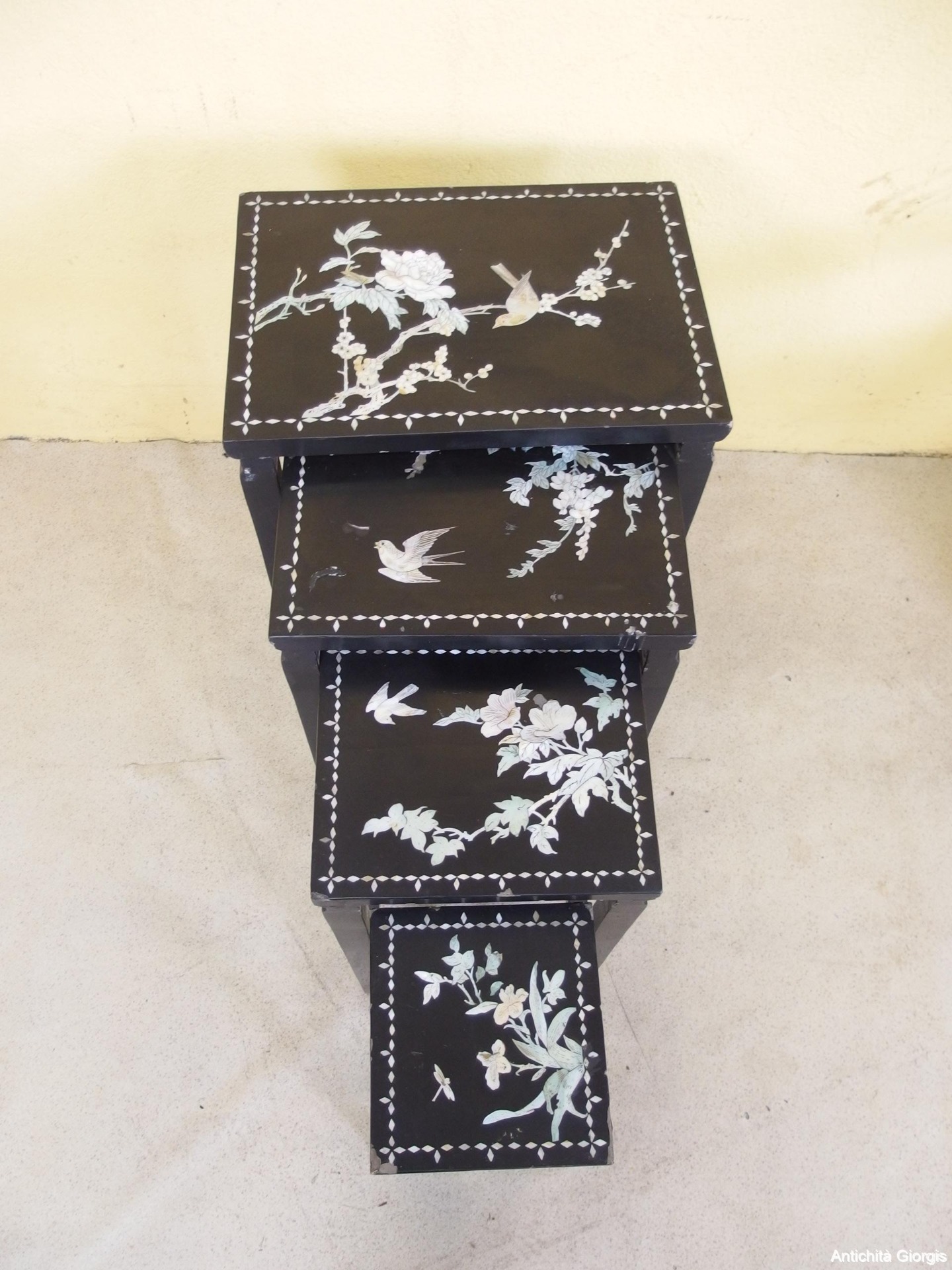 Bellissimo gruppo di n. 4 tavolini a scomparsa laccati con disegni floreali di stile orientale epoca primi 900 di provenienza Cina I tavolini sono originali si presentano in buone condizioni ( vedi foto) Dimensioni: cm L48xP35xH69 costo del trasporto euro 60