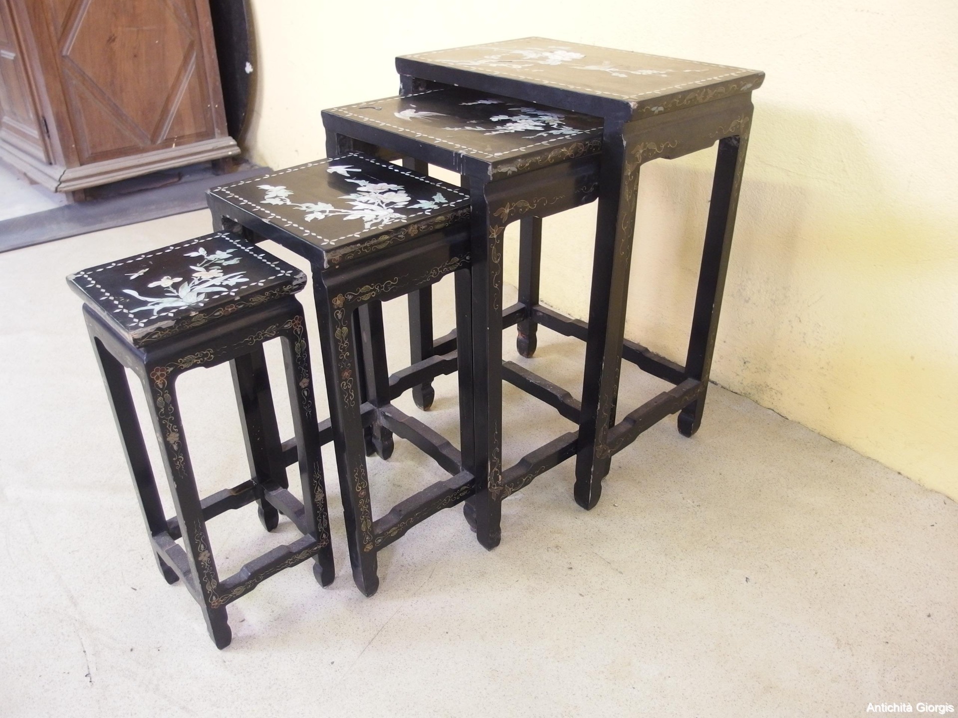 Bellissimo gruppo di n. 4 tavolini a scomparsa laccati con disegni floreali di stile orientale epoca primi 900 di provenienza Cina