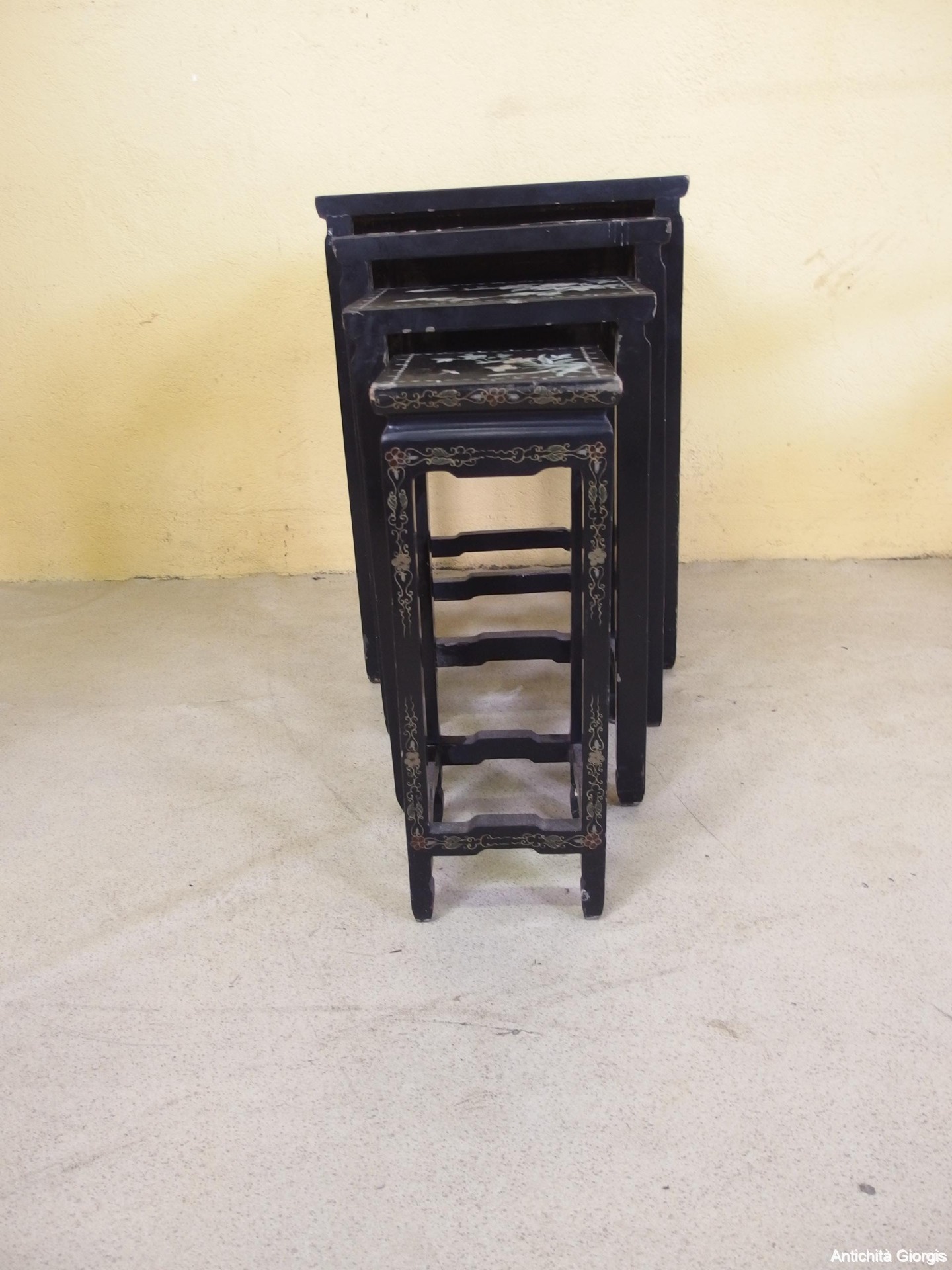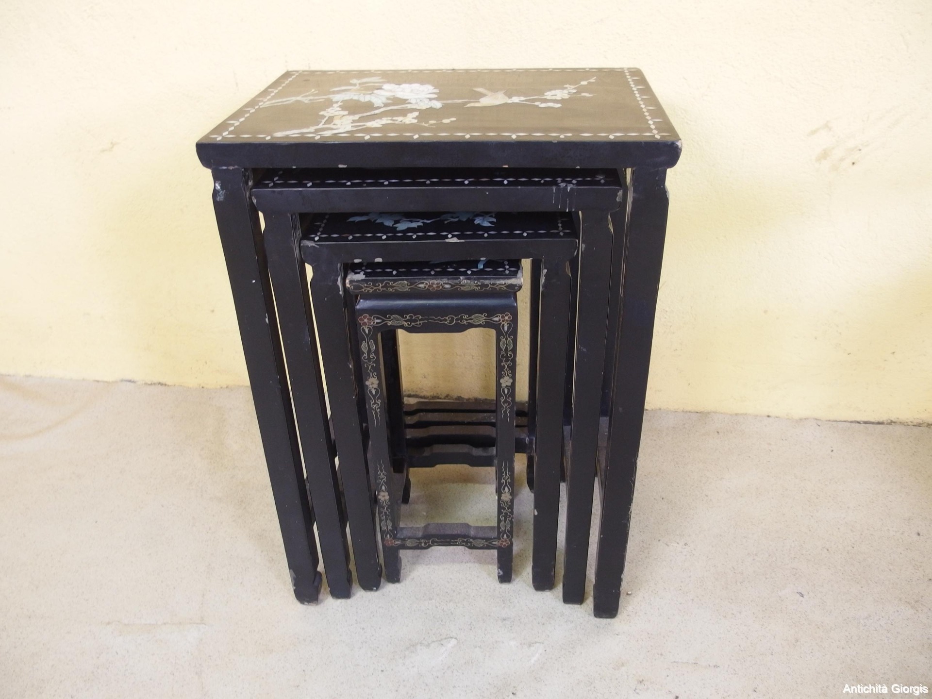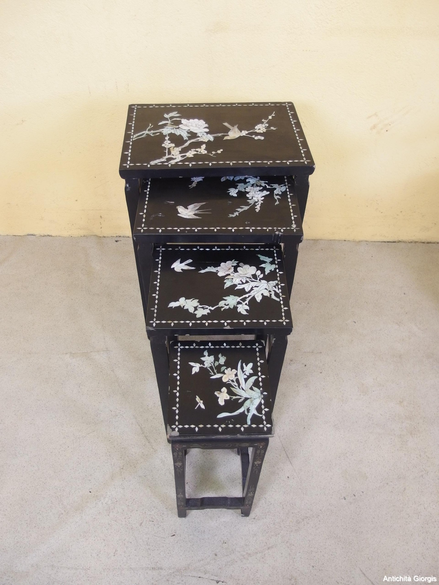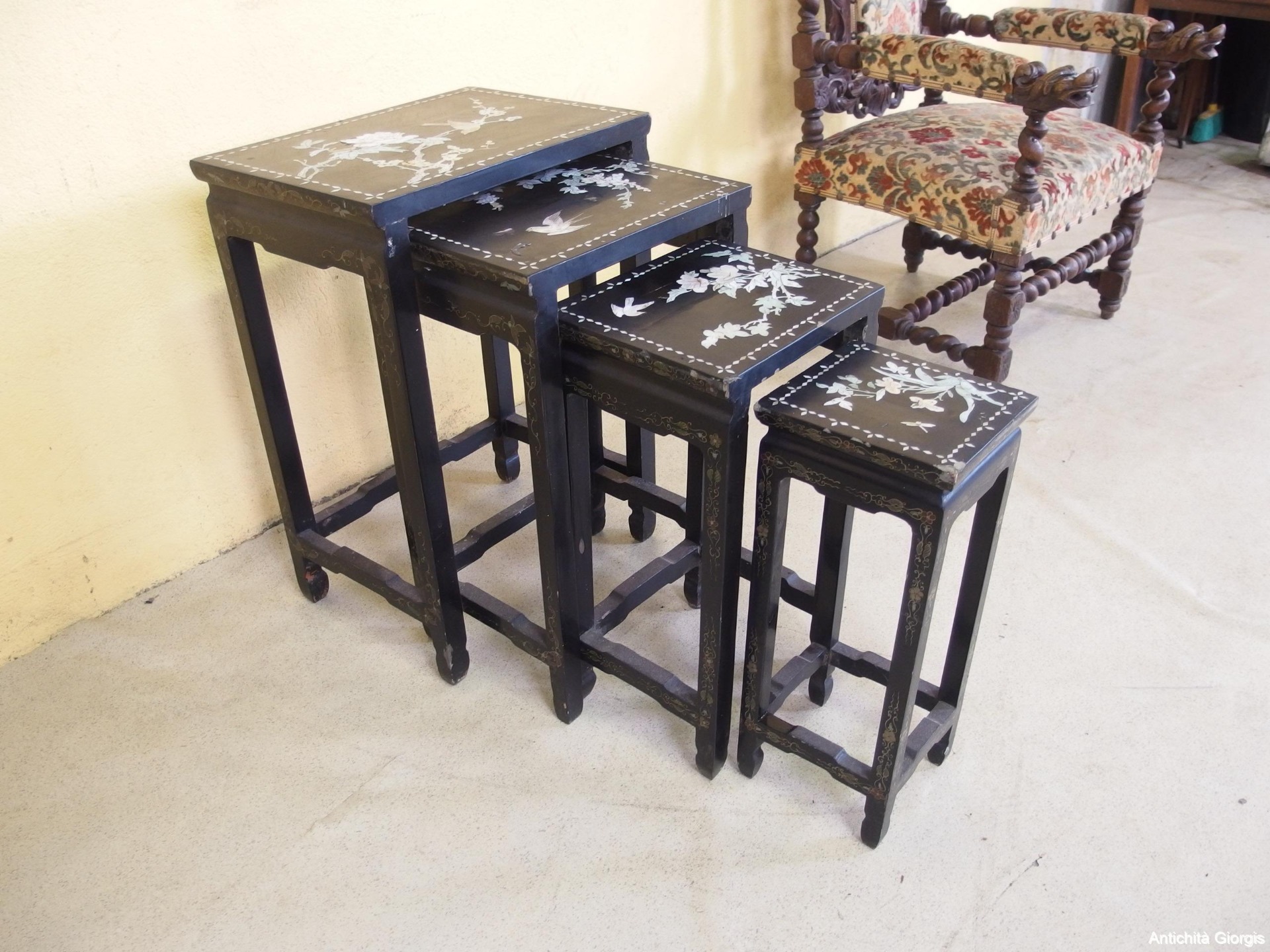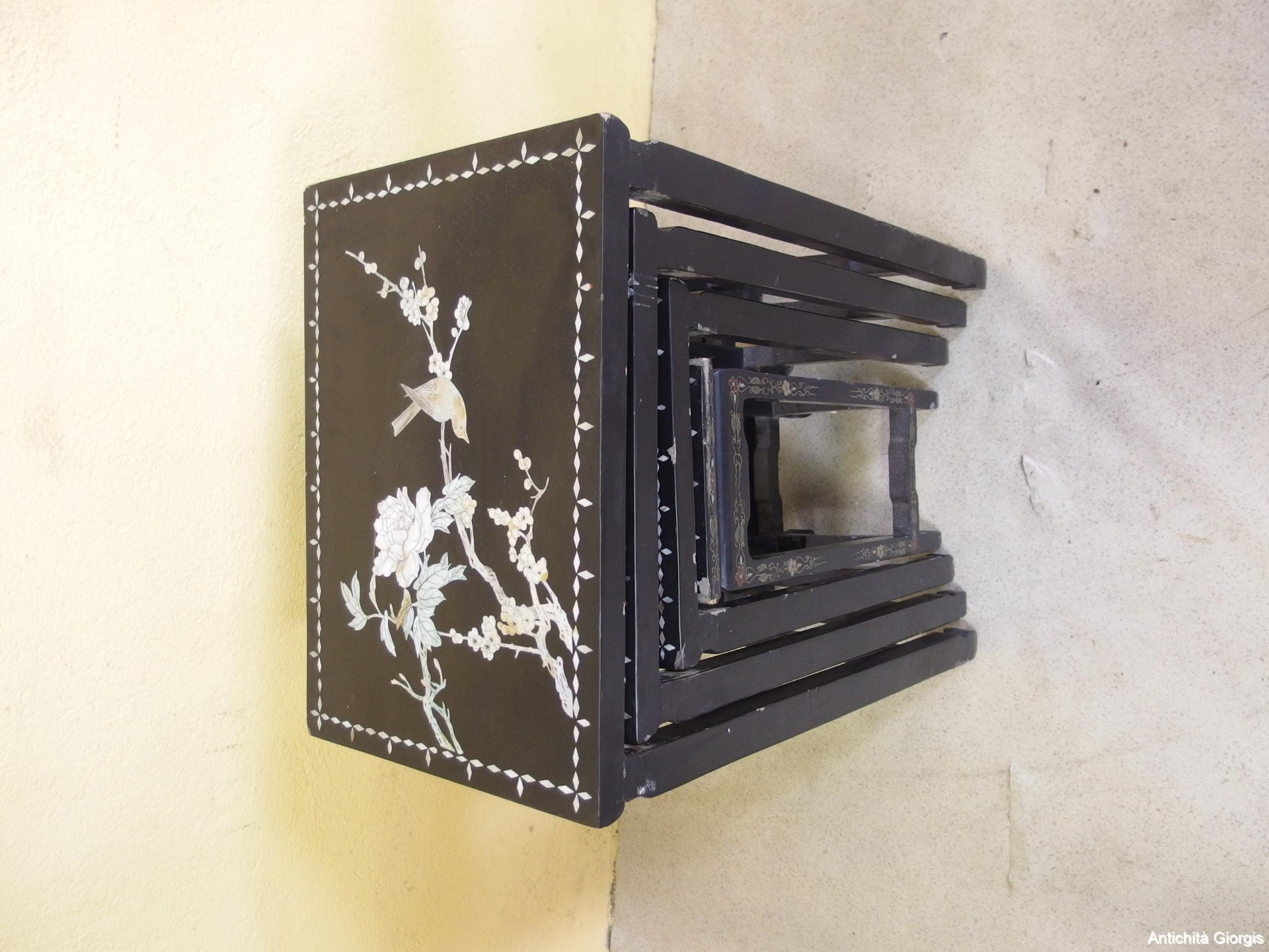 Bellissimo gruppo di n. 4 tavolini a scomparsa laccati con disegni floreali di stile orientale epoca primi 900 di provenienza Cina I tavolini sono originali si presentano in buone condizioni ( vedi foto) Dimensioni: cm L48xP35xH69 costo del trasporto euro 60