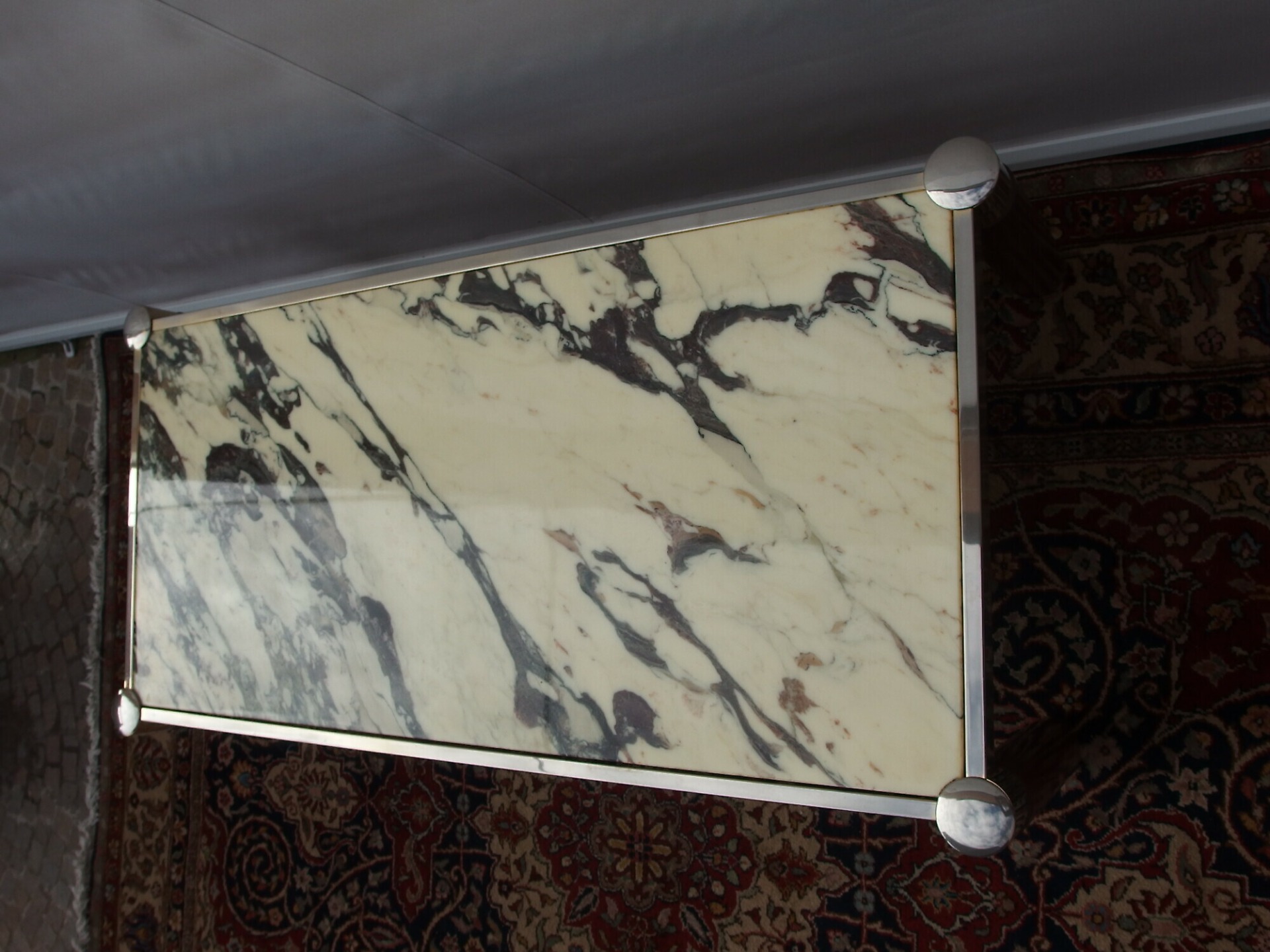 Bellissimo tavolino vintage da salotto rettangolare anni 70 con piano in marmo epoca 1960-70 di provenienza Italia. Il tavolino è in buone condizioni non necessita di restauri, (vedi foto). Il telaio in metallo ottonato, con gambe in legno di mogano il piano è in marmo non ha rotture. Dimensioni: cm L134xP65xH47 Costo del trasporto euro 150 Per più informazioni contattateci al 3498702952 Ci puoi vedere su INSTAGRAM e FACEBOOK