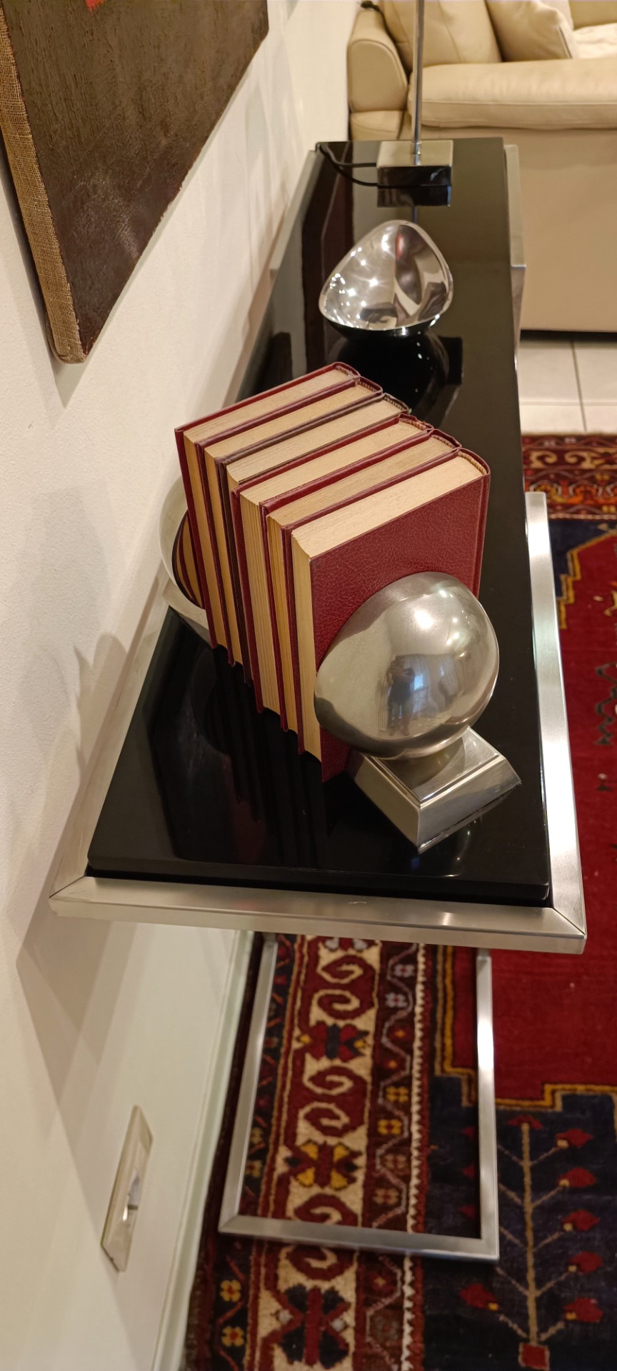 This 1980s design console in brushed steel is a vintage icon for contemporary decor. With its black lacquered wooden top, this console is a perfect blend of retro and modern style.