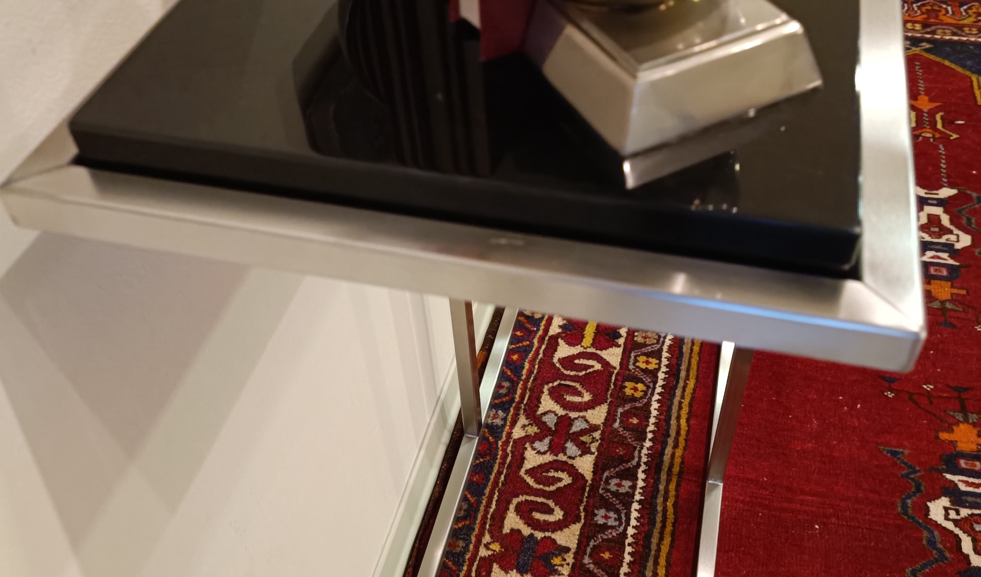 1980s Design Console in Brushed Steel with Black Lacquered Shelf
