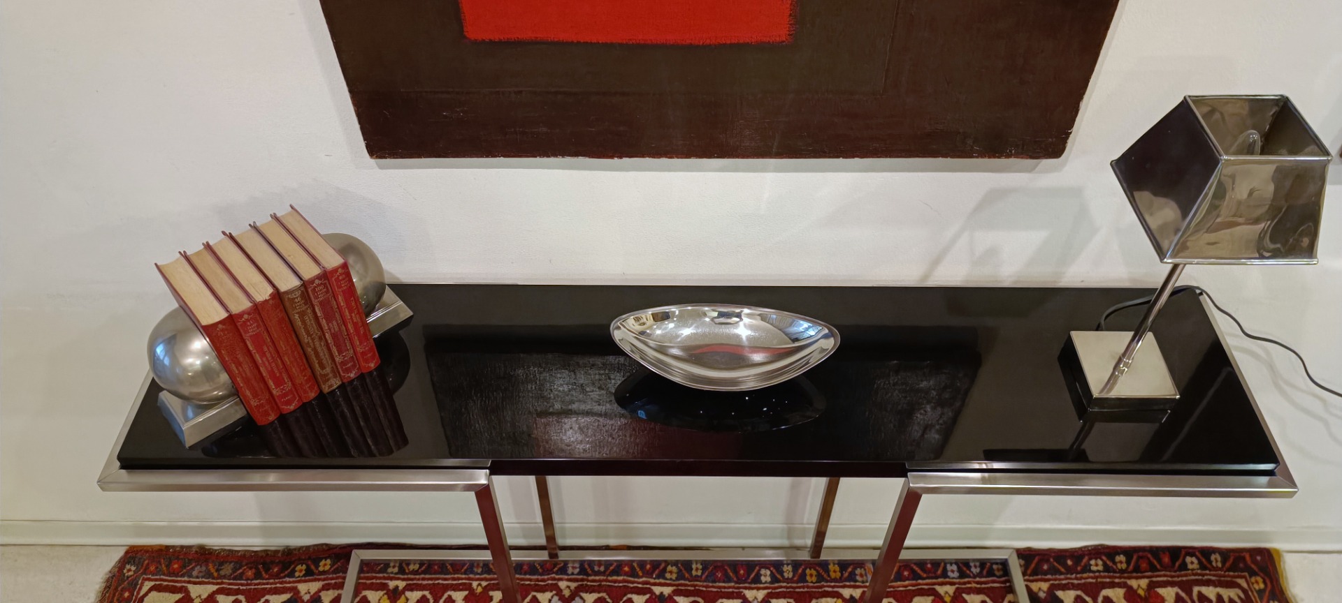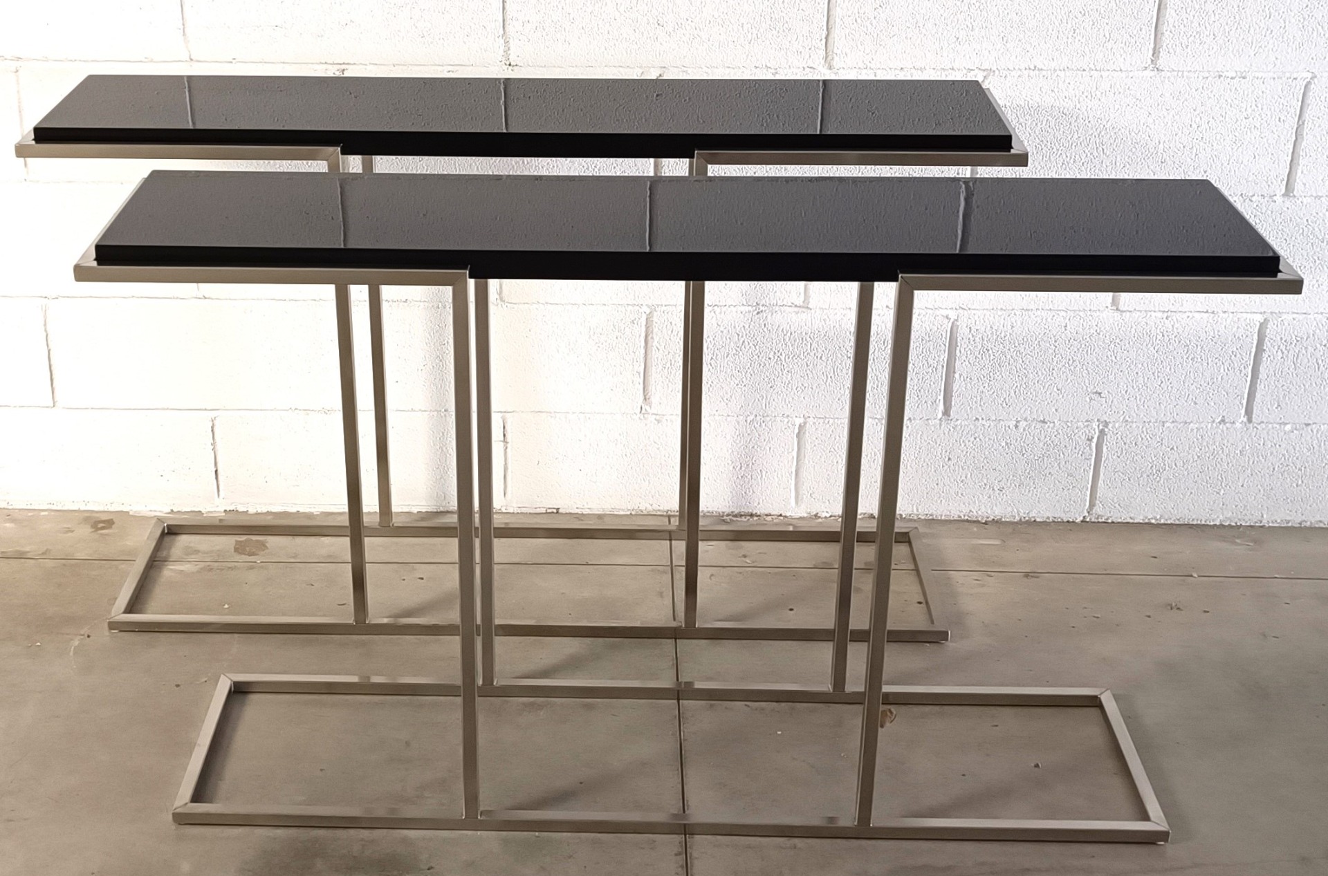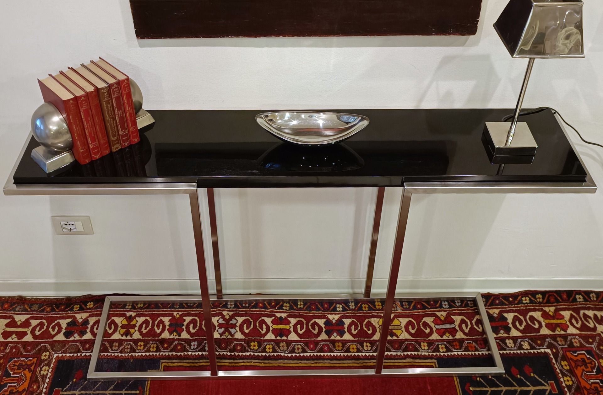This 1980s design console in brushed steel is a vintage icon for contemporary decor. With its black lacquered wooden top, this console is a perfect blend of retro and modern style.