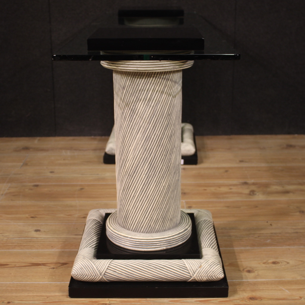 Particular design console, Spain from the 70s/80s. Furniture composed of two columns adorned with wicker with black lacquered wooden elements and glass top. Glass top equipped with special holes to be fixed to the columns (see photo). Console that can be completely disassembled to facilitate its movement and placement in the home. Furniture of interesting construction, for antique dealers, interior decorators and design collectors. Console of fine workmanship and pleasant furnishings, which can be easily placed in different parts of the house. Structurally sound, it has small signs of wear. Overall in good state of conservation.