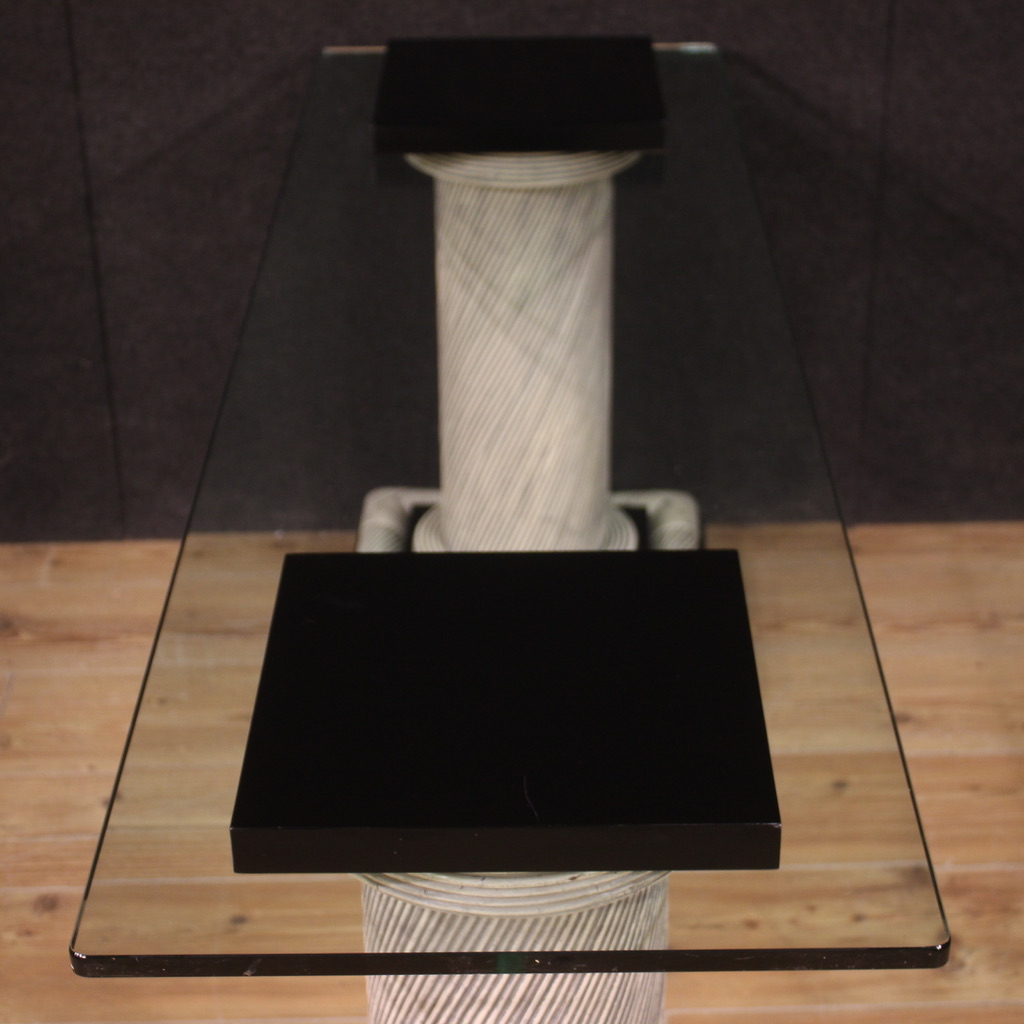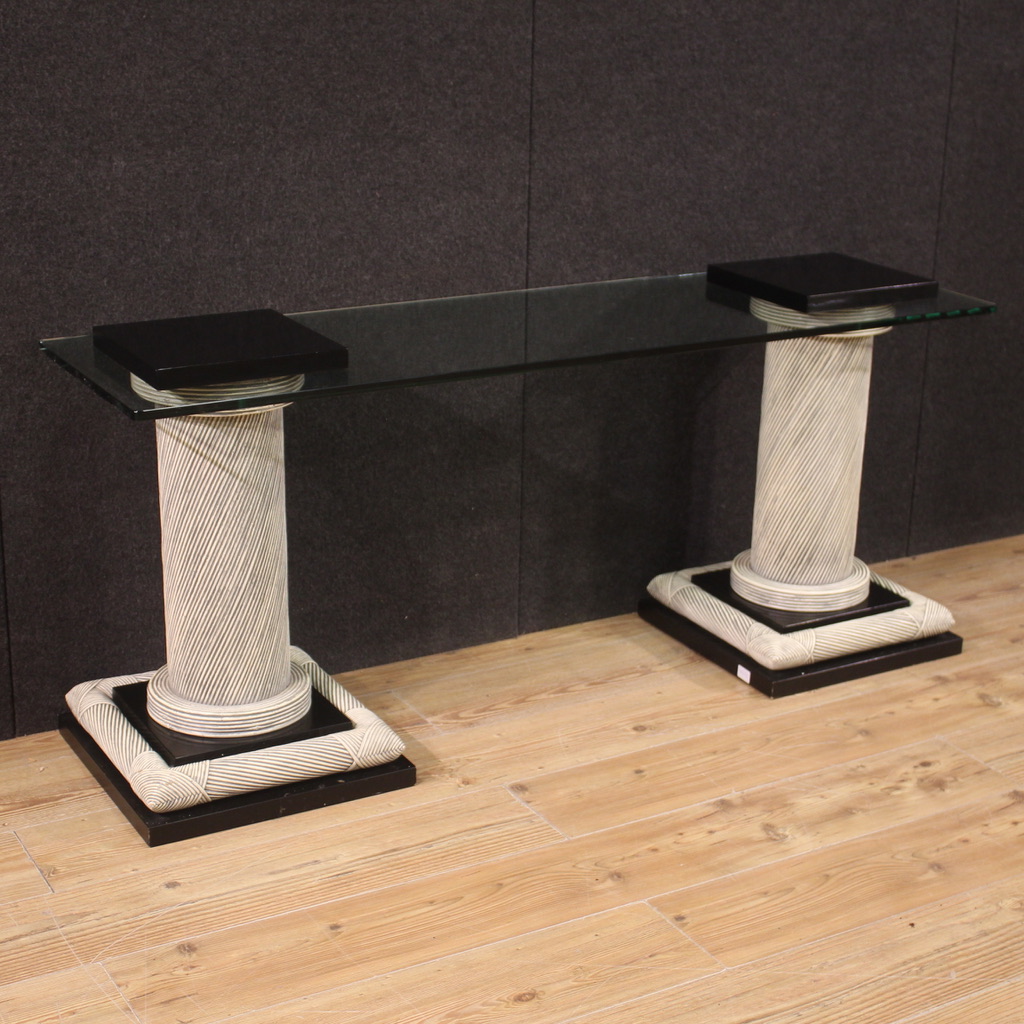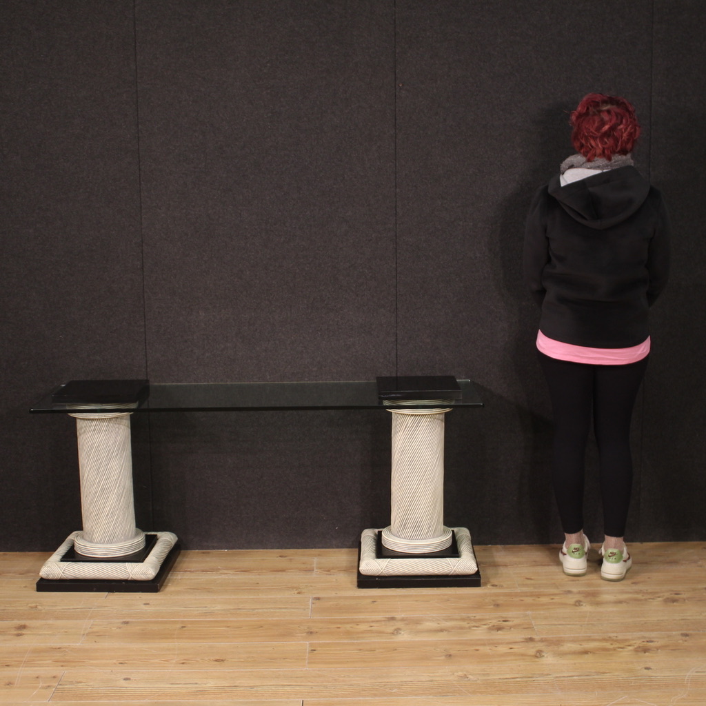 Particular design console, Spain from the 70s/80s. Furniture composed of two columns adorned with wicker with black lacquered wooden elements and glass top. Glass top equipped with special holes to be fixed to the columns (see photo). Console that can be completely disassembled to facilitate its movement and placement in the home. Furniture of interesting construction, for antique dealers, interior decorators and design collectors. Console of fine workmanship and pleasant furnishings, which can be easily placed in different parts of the house. Structurally sound, it has small signs of wear. Overall in good state of conservation.