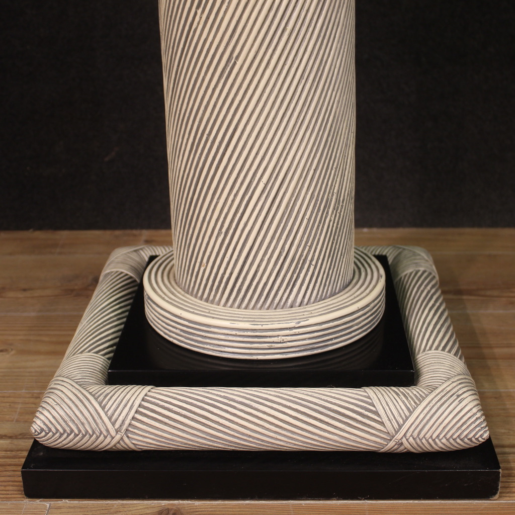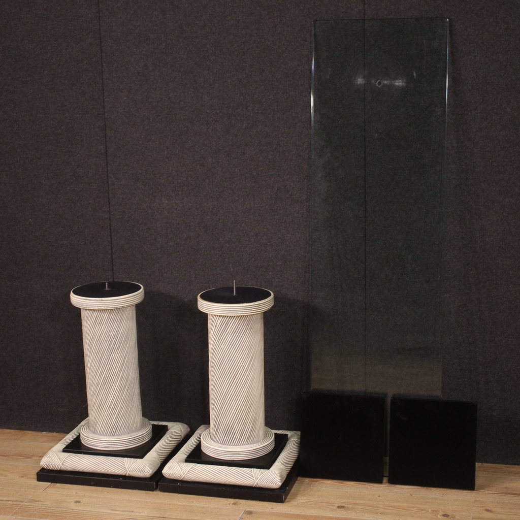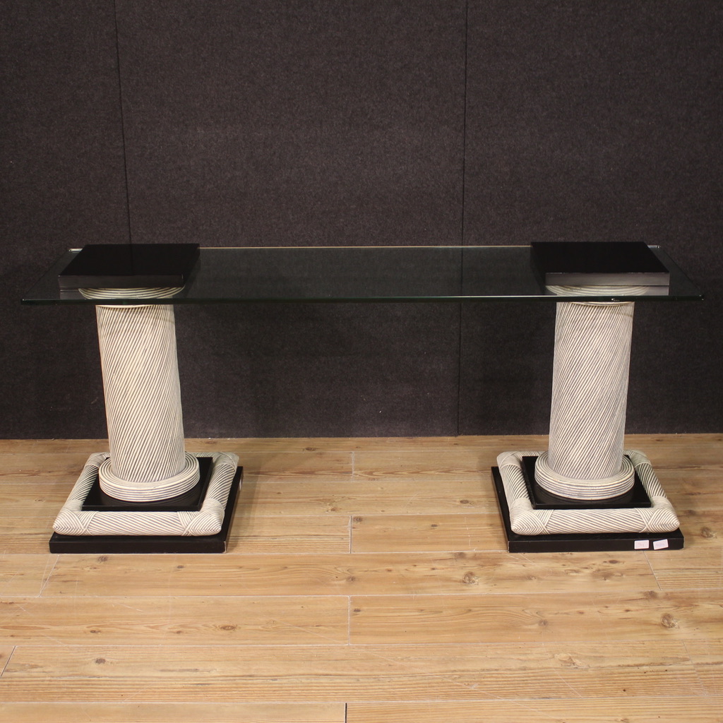 Particular design console, Spain from the 70s/80s. Furniture composed of two columns adorned with wicker with black lacquered wooden elements and glass top. Glass top equipped with special holes to be fixed to the columns (see photo). Console that can be completely disassembled to facilitate its movement and placement in the home. Furniture of interesting construction, for antique dealers, interior decorators and design collectors. Console of fine workmanship and pleasant furnishings, which can be easily placed in different parts of the house. Structurally sound, it has small signs of wear. Overall in good state of conservation.