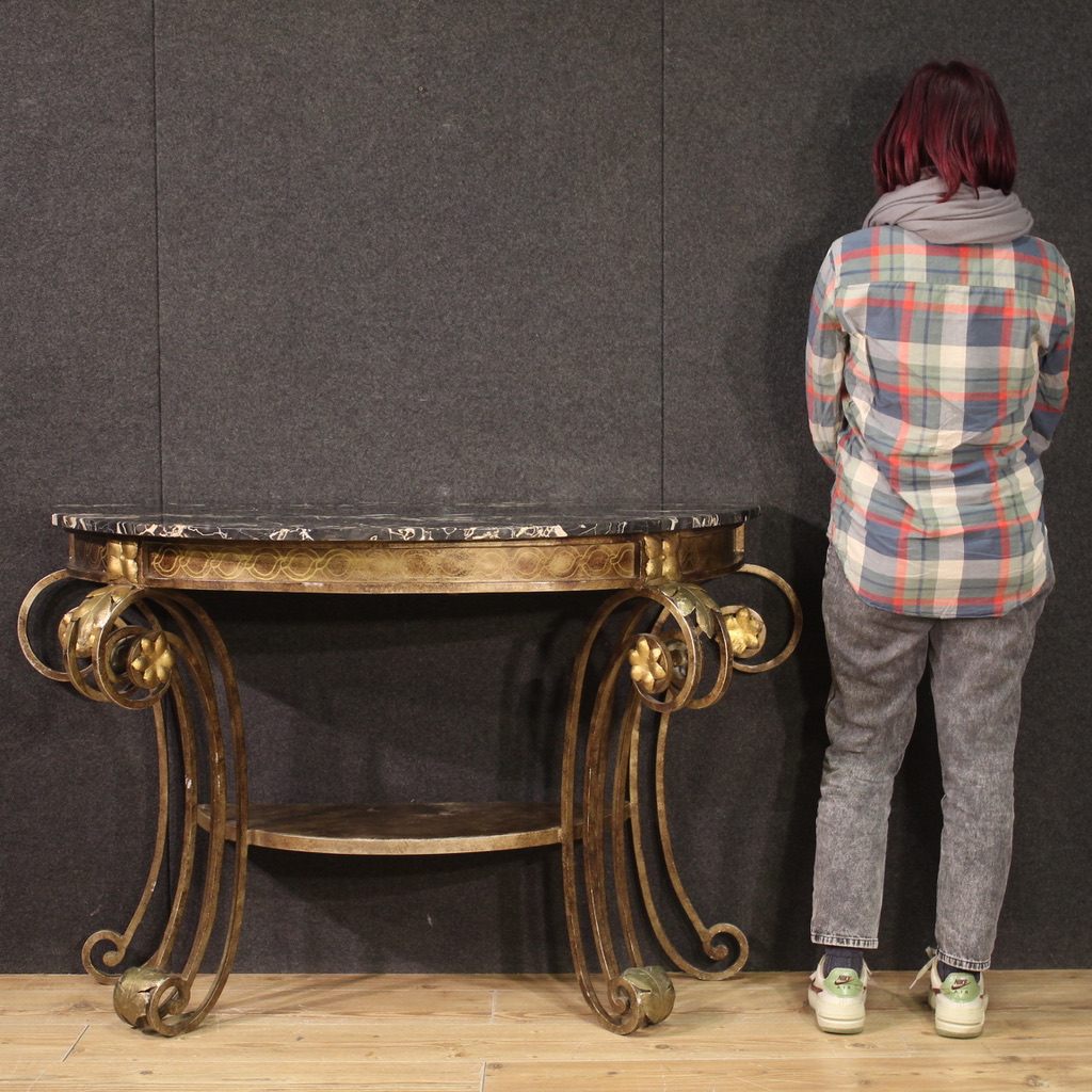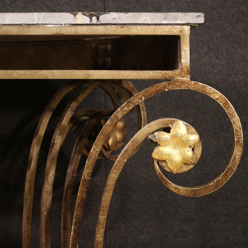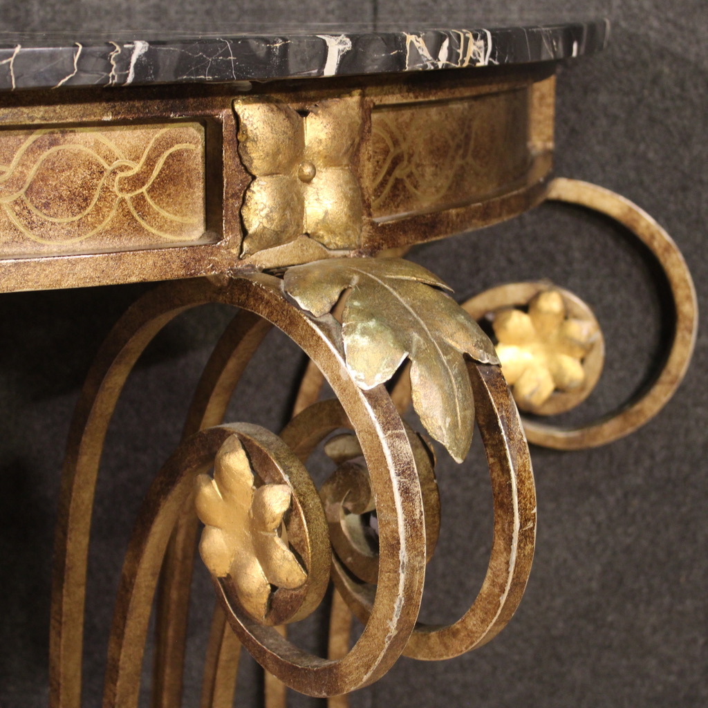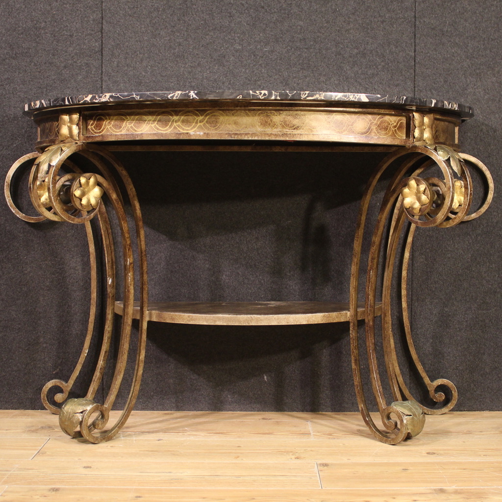 Elegant Italian console in wrought and gilded iron from the 70s. Spectacular top in Portoro marble from Portovenere, with some signs of aging (see photo). Spectacular piece of furniture in an eclectic Art Deco style, ideal for a reception room or large entrance hall. It has a second floor in the lower part, in iron, of discreet service. Console supported by four legs of excellent stability and solidity adorned with floral decorations and curled feet. Structurally sound furniture, overall in good condition.
