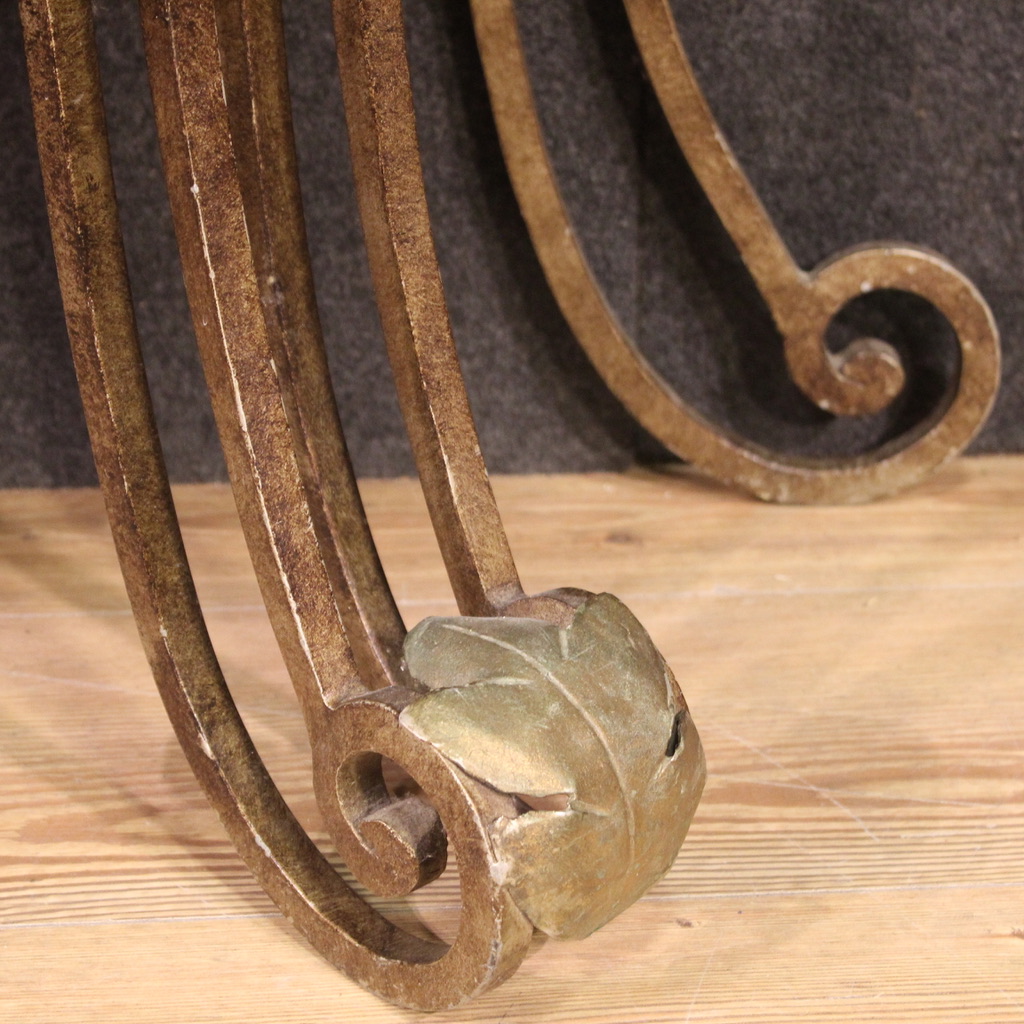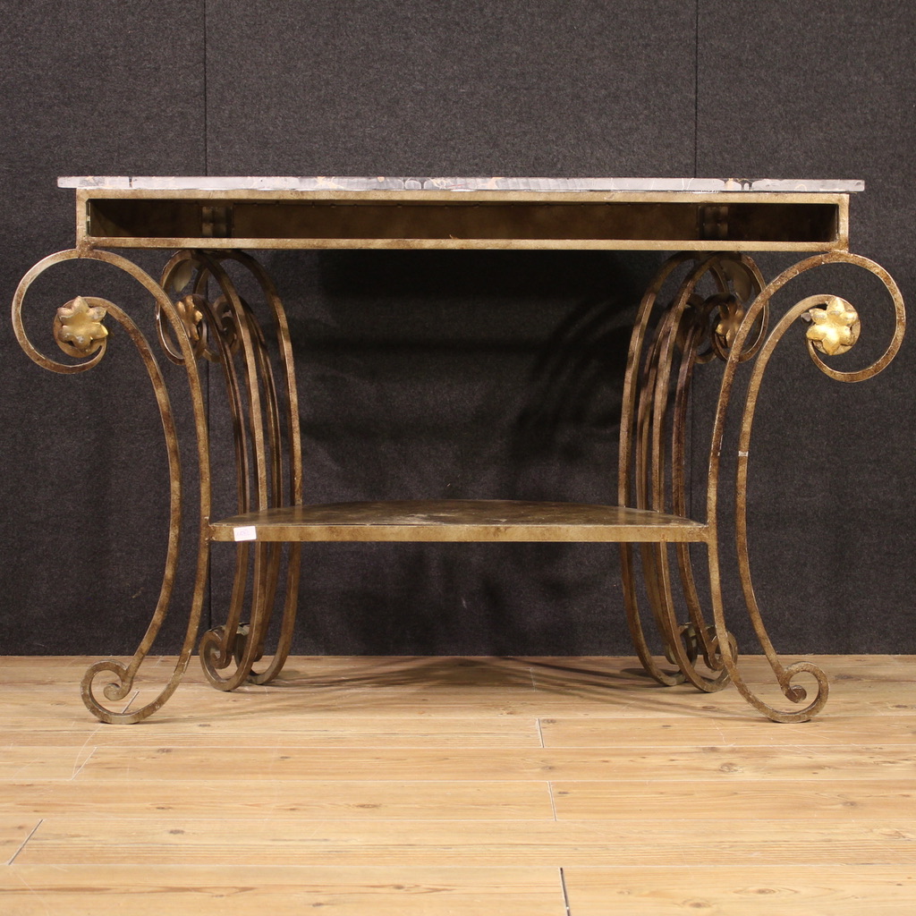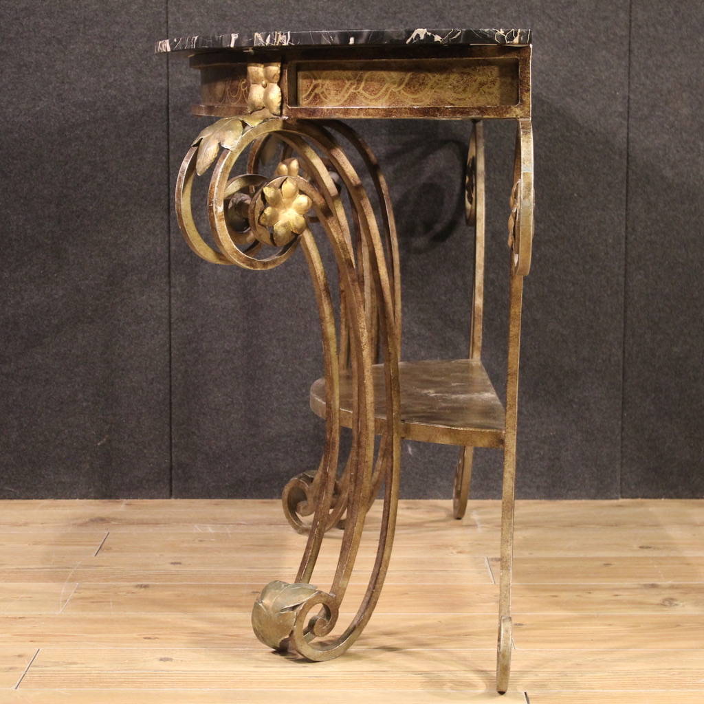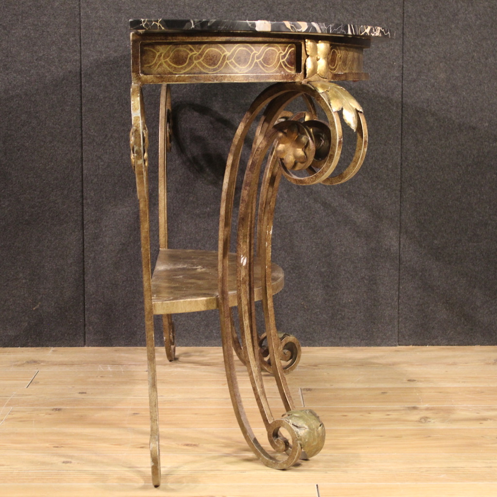 Elegant Italian console in wrought and gilded iron from the 70s. Spectacular top in Portoro marble from Portovenere, with some signs of aging (see photo). Spectacular piece of furniture in an eclectic Art Deco style, ideal for a reception room or large entrance hall. It has a second floor in the lower part, in iron, of discreet service. Console supported by four legs of excellent stability and solidity adorned with floral decorations and curled feet. Structurally sound furniture, overall in good condition.