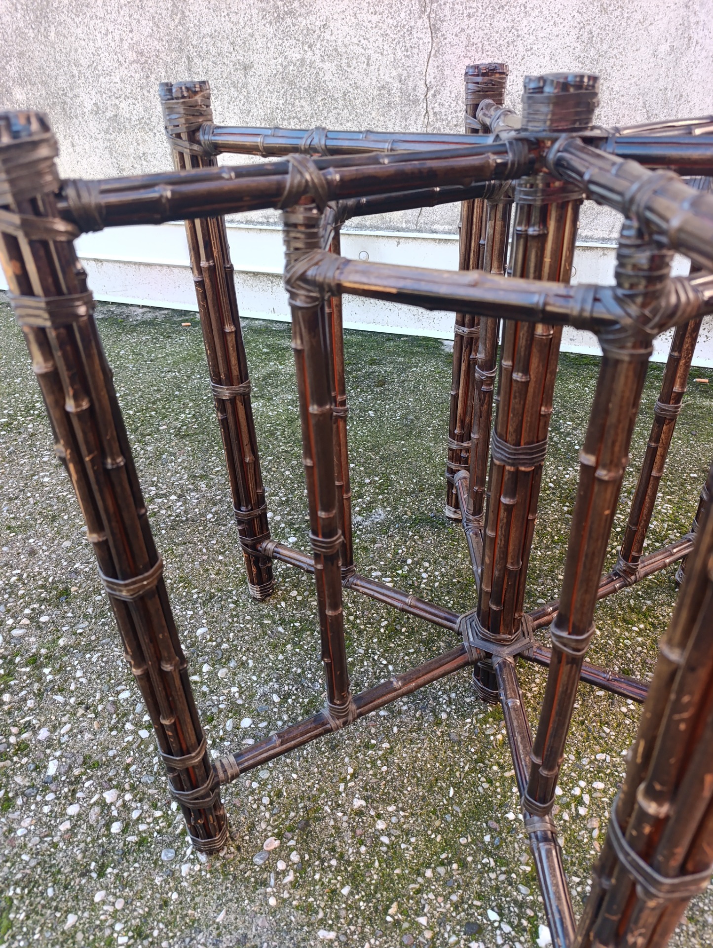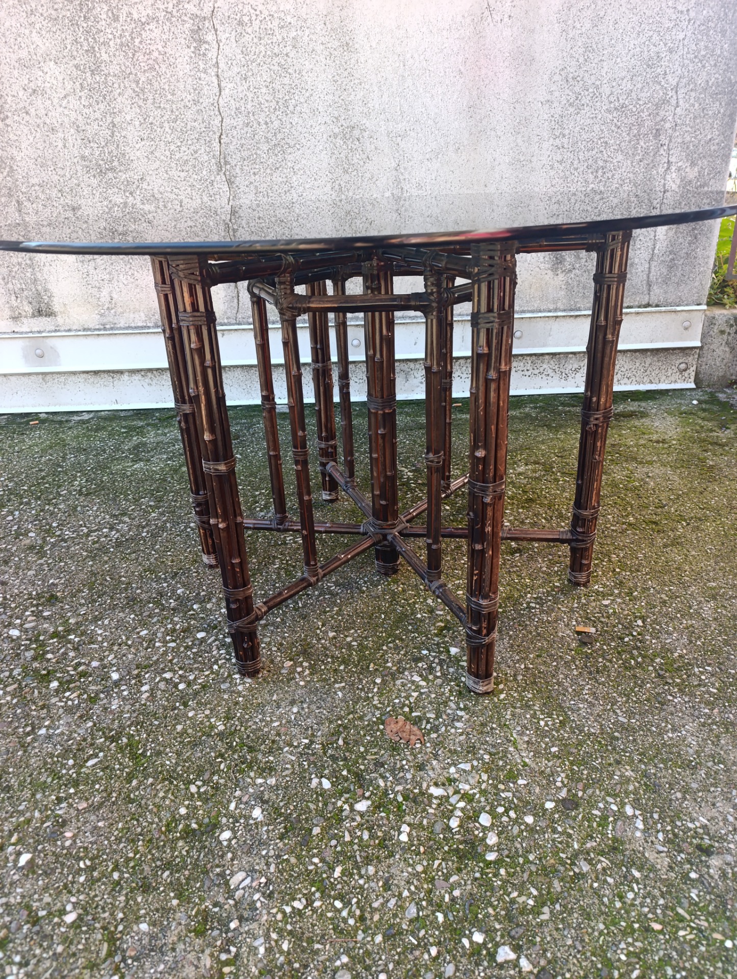 Wicker table with leather binding and original glass top.Architect MC Guire, San Francisco. Measurements: Diameter cm 120 Height cm 75 We are available for photos or questions.