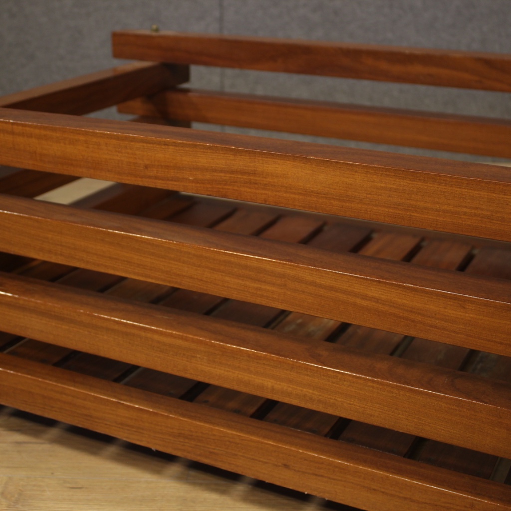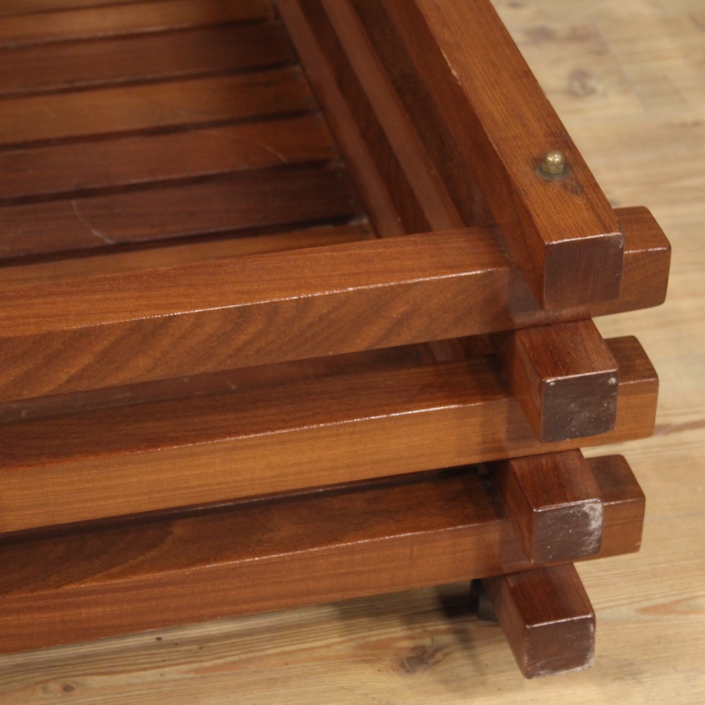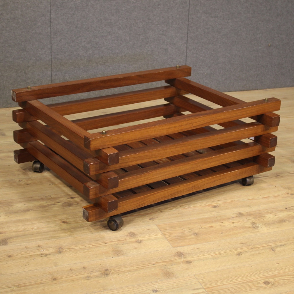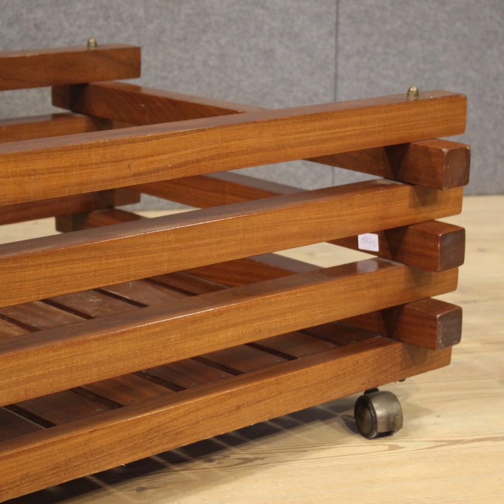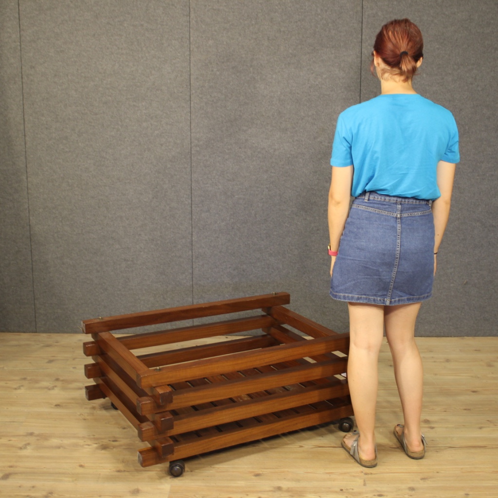 Large design flowerpot from the 70s / 80s. Italian furniture carved in mahogany wood of particular shape and construction. Planter equipped with wheels to facilitate movement inside the house. Furniture for interior designers and lovers of Italian design, of pleasant decor. In good condition with some small signs of the time.