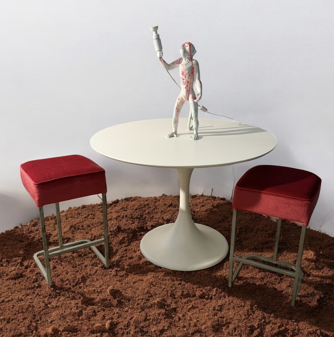 Pair of steel and velvet stools, 65 cm high, seat 36x36 cm