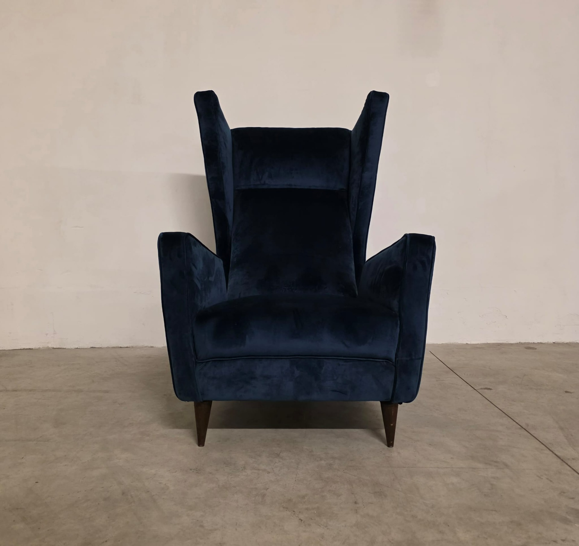 Coppia di poltrone disegnate da Mario Oreglia. Rare poltrone dal design geometrico. Grandi ed avvolgenti il designer reinterpreta la classica poltrona bergere in chiave moderna. Ampia seduta comoda e grandi orecchie spigolose. Rivestite in pregiato velluto blu. Prodotte nel 1949. Disegnate da Mario Oreglia architetto Torinese. Pubblicate sulla rivista Domus n237 pag 52 del 1949. MISURE: Altezza 116 cm, altezza seduta 43 cm. Larghezza 77 cm; Profondità 85 cm