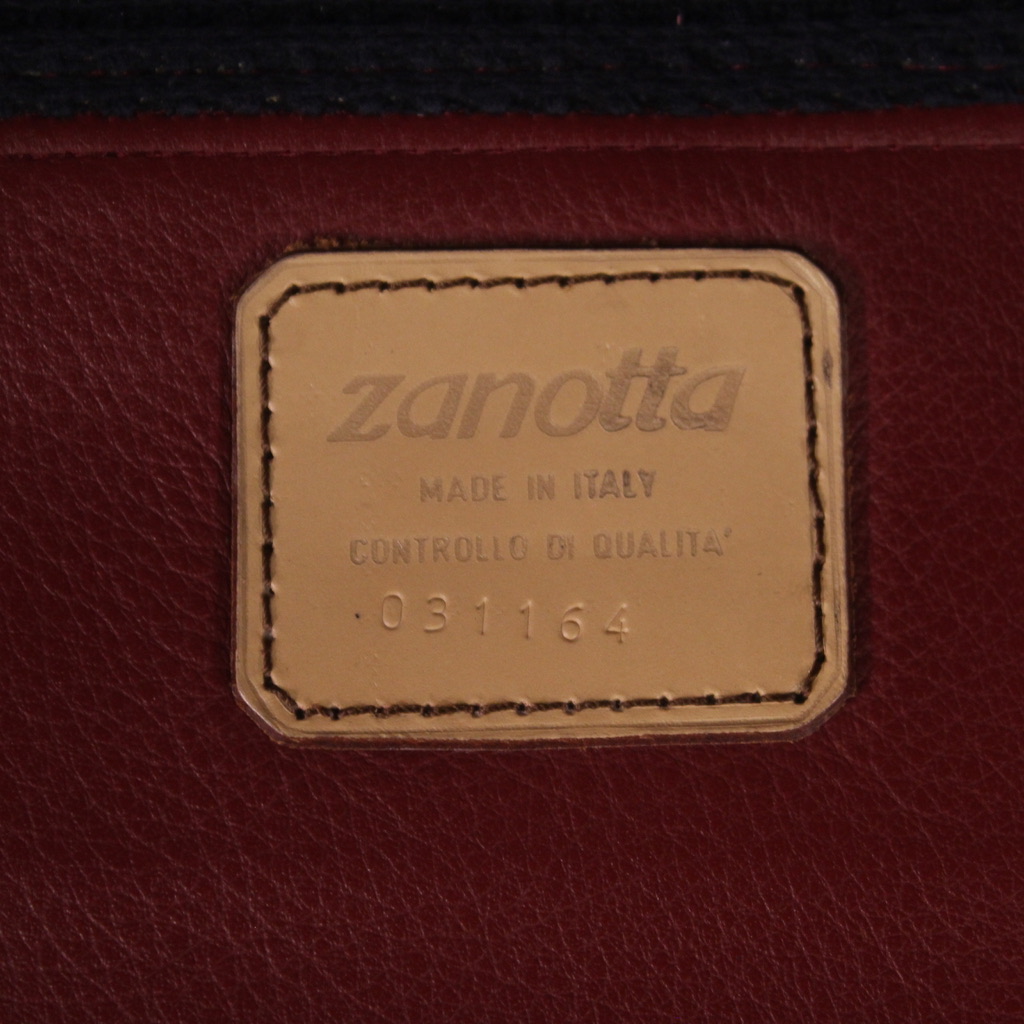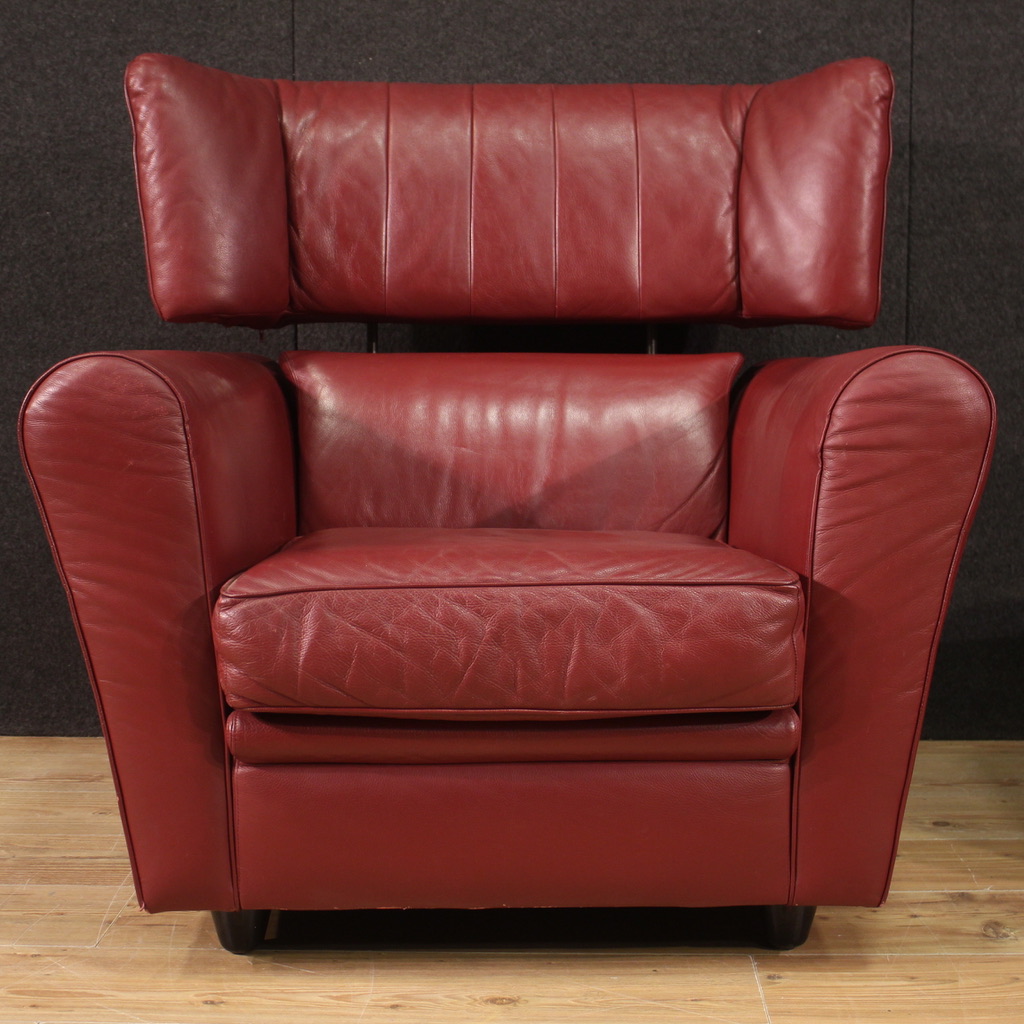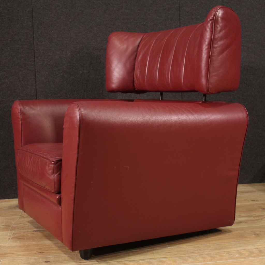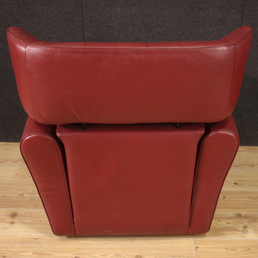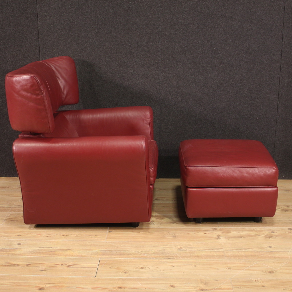 COD: 0822 Armchair with footstool, Italy from the 1980s. Furniture made by Zanotta (stamped and numbered) of beautiful line and pleasant decor, upholstered in leather. Very comfortable armchair with removable cushion and reclining headrest. Seat height of 40 cm. Footstool dimensions: H 42 x W 58 x D 58 cm. Ideal furniture to be placed in a hall or living room, for antique dealers and interior decorators. Set in beautiful patina and in good state of conservation, without breaks or tears.