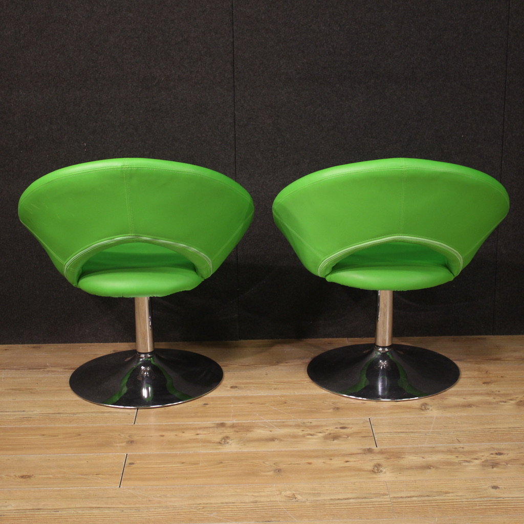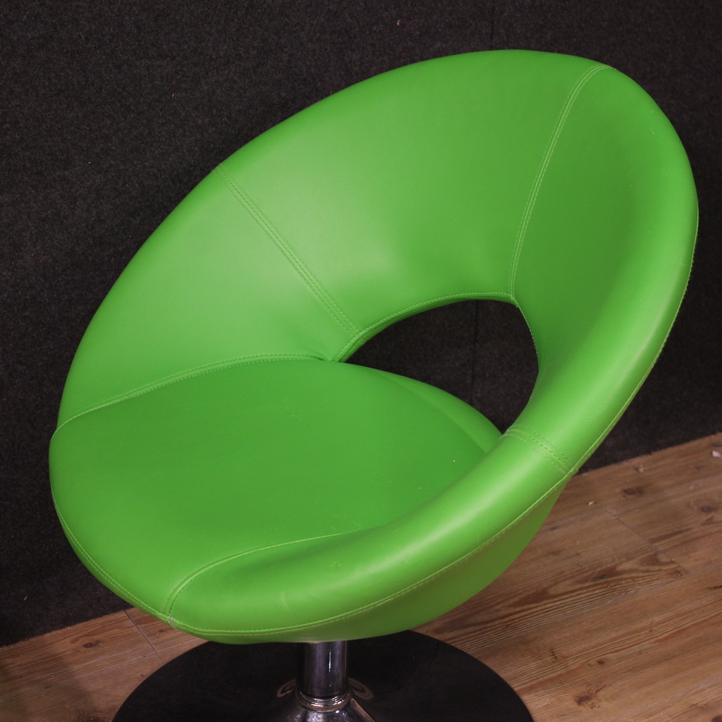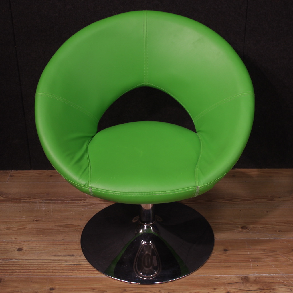 Pair of modern armchairs from the late 20th century. Design furniture of great charm, upholstered in green faux leather with a chromed metal base. Swivel armchairs for the bedroom, living room, or study, with a beautiful line and pleasant decor, for interior designers and design lovers. Comfortable furniture with a seat height of 40 cm. Metal bases with some scratches, faux leather upholstery with small signs of wear (see photos). Overall, the armchairs are in a good state of preservation with some signs of aging.