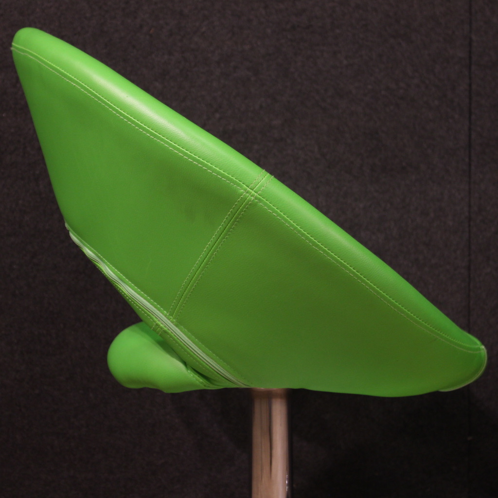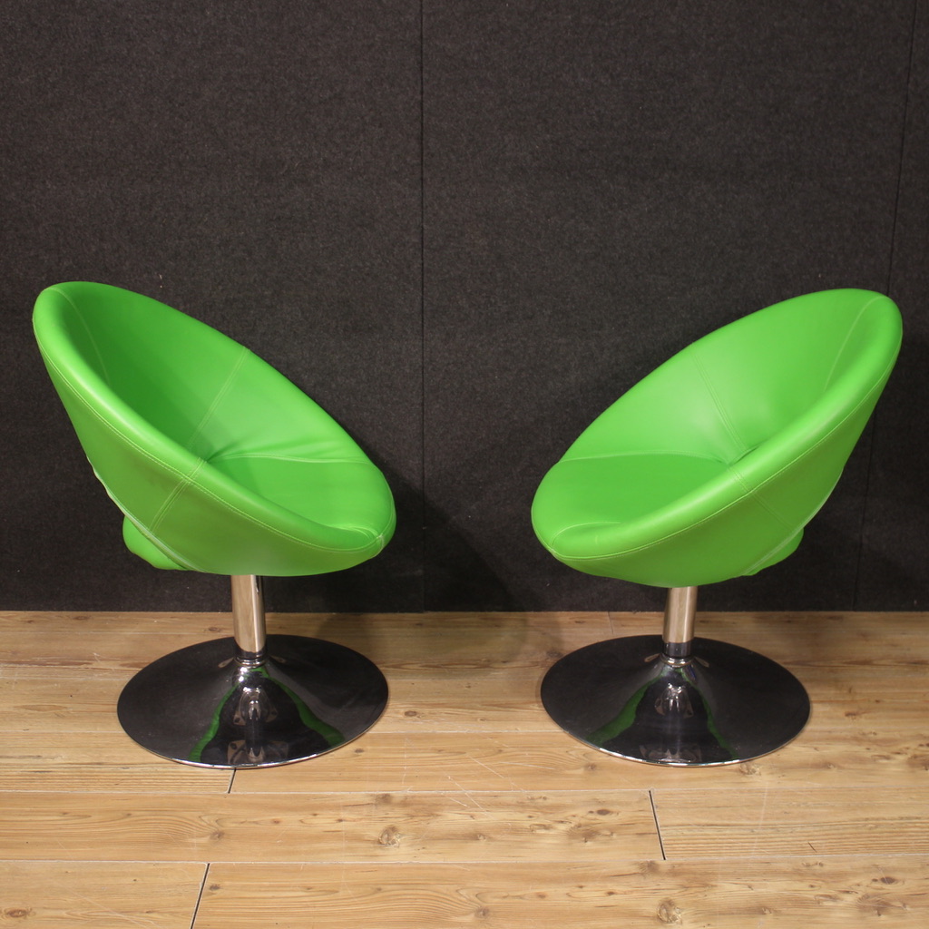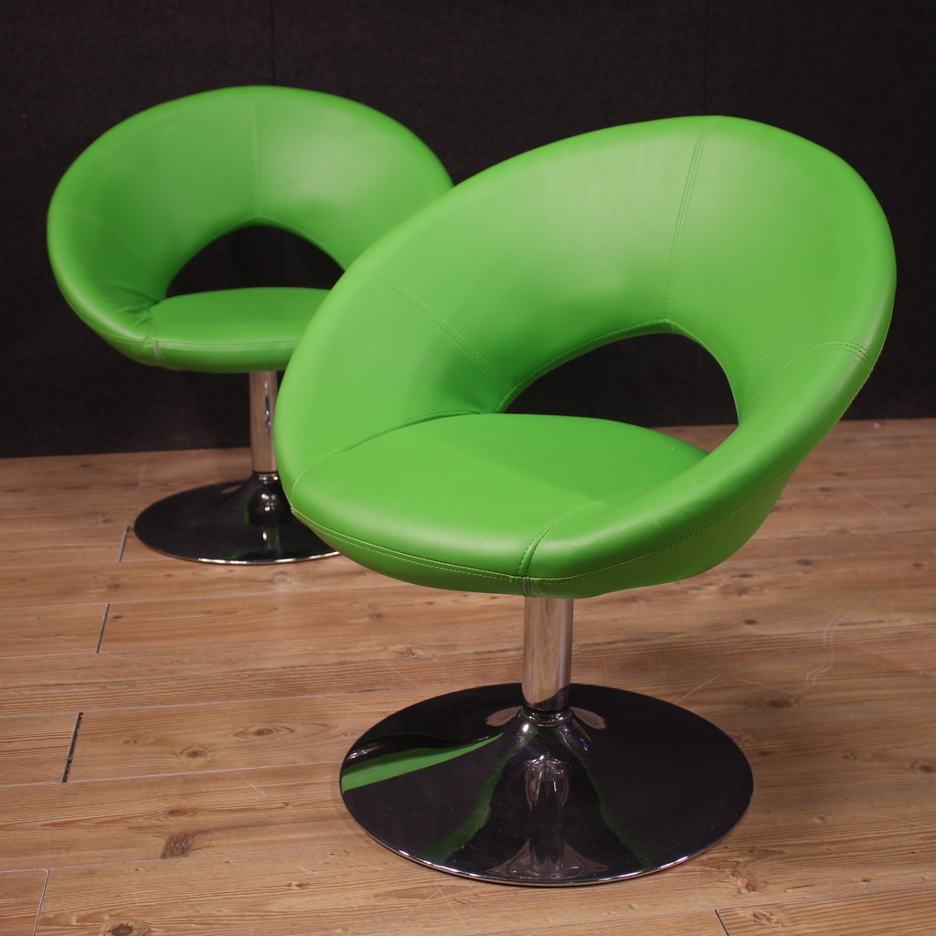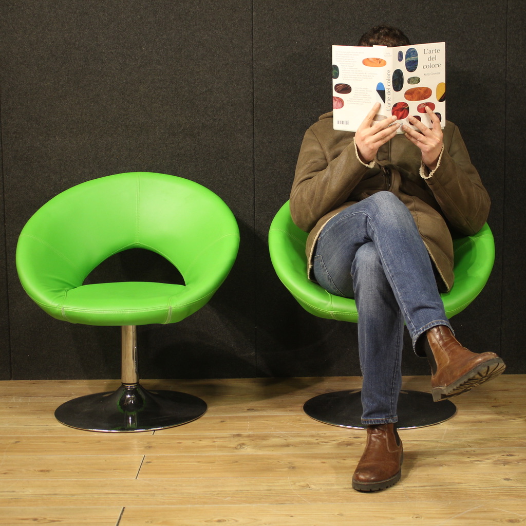 Pair of modern armchairs from the late 20th century. Design furniture of great charm, upholstered in green faux leather with a chromed metal base. Swivel armchairs for the bedroom, living room, or study, with a beautiful line and pleasant decor, for interior designers and design lovers. Comfortable furniture with a seat height of 40 cm. Metal bases with some scratches, faux leather upholstery with small signs of wear (see photos). Overall, the armchairs are in a good state of preservation with some signs of aging.